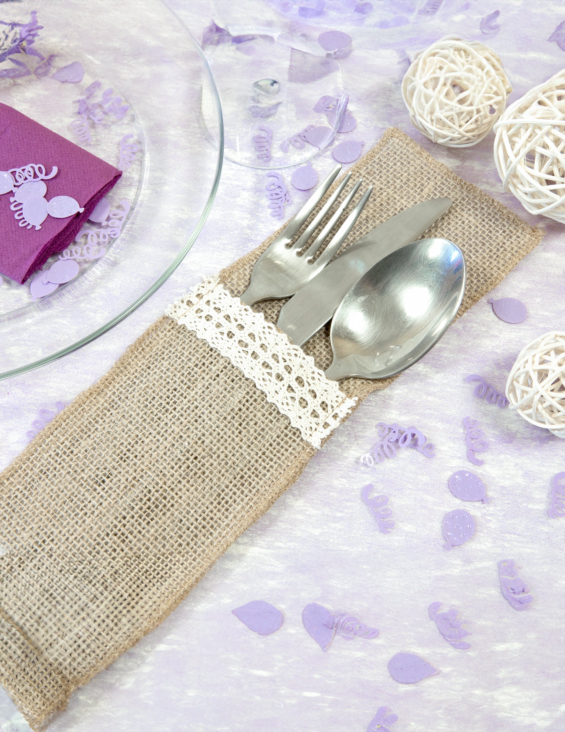 Dodajte dašak prirodne elegancije svom prijemu s ovim setom od 4 komada držač za pribor za jeloOvi dodaci nalik juti imaju dimenzije 8,5 x 24,5 cm i ukrašene su nježnom bijelom čipkom za elegantan izgled romantično i profinjeni. Bit će savršeni za završetak ukras od tvog seosko vjenčanje ili zabavu s autentičnim šarmom.