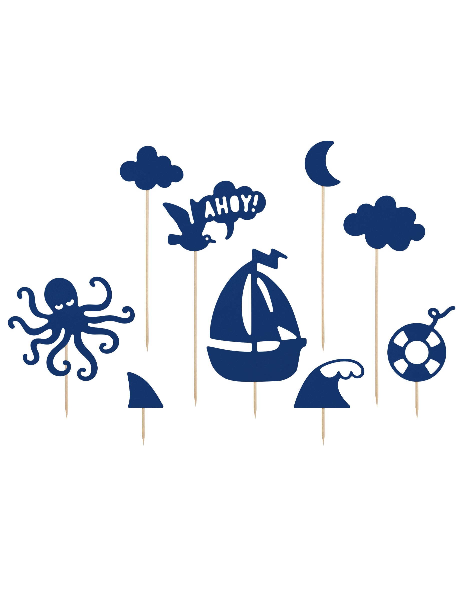 9 tamnoplavih ukrasa za torte na štapićima, 9,5 do 22,5 cm cm morski motivi