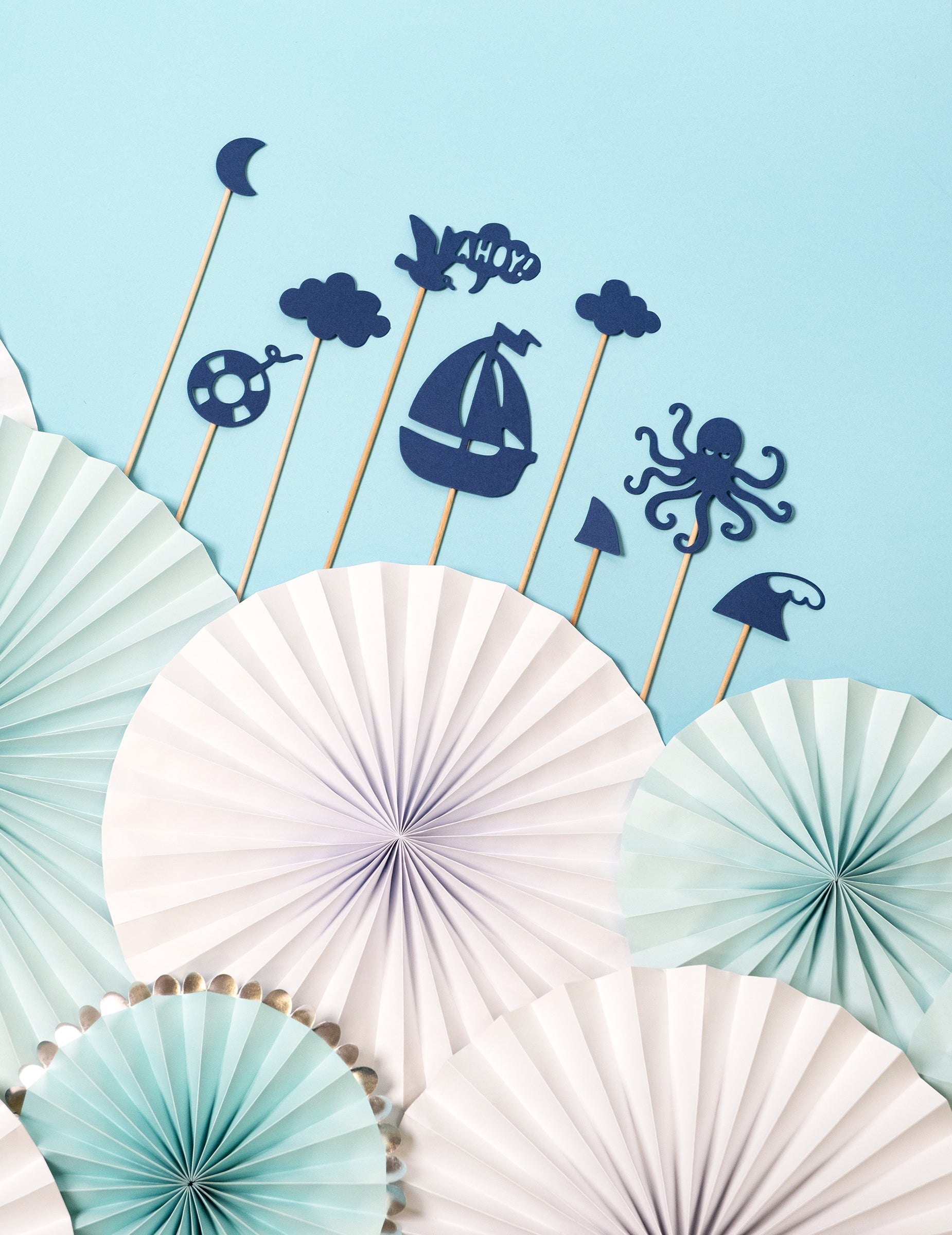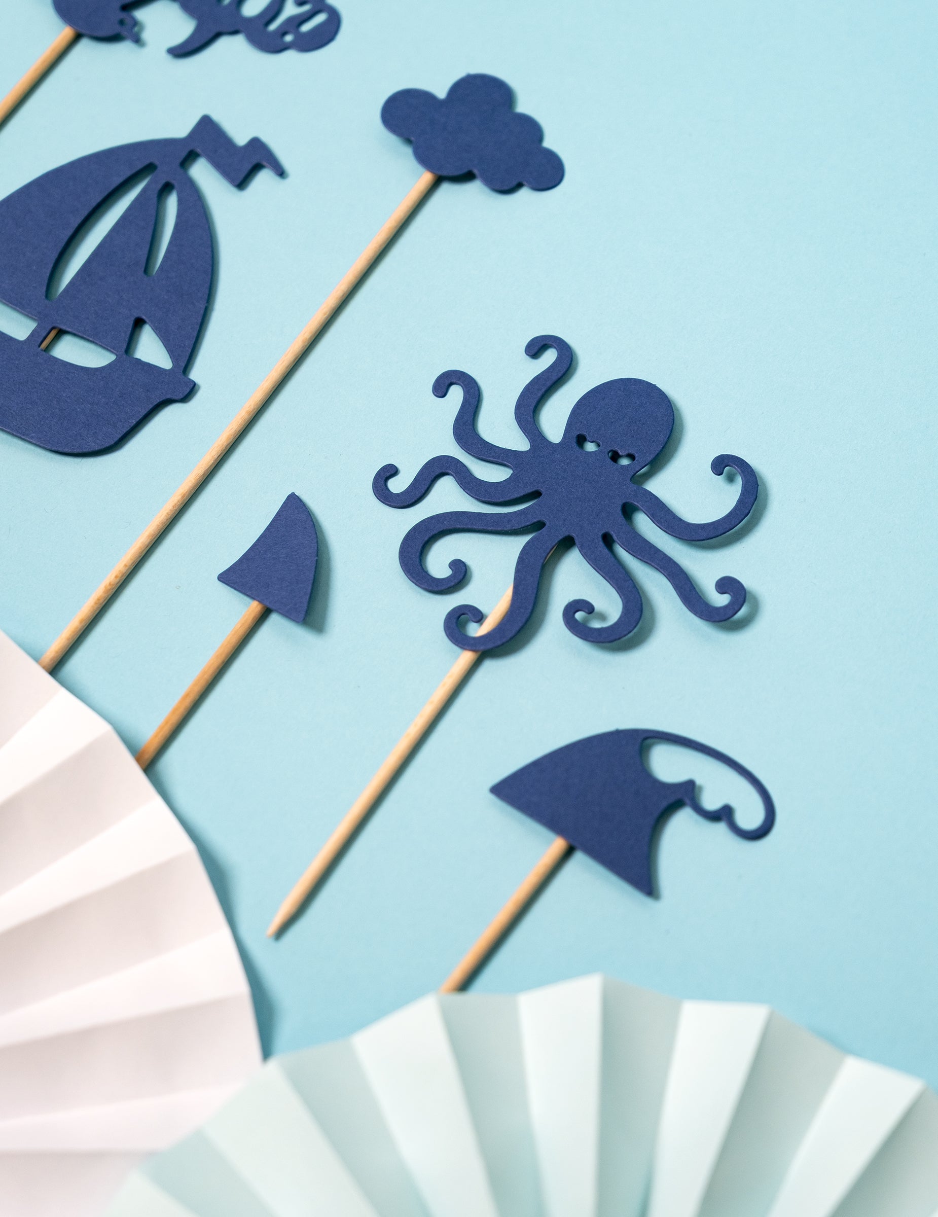 Dodajte dašak oceana svojim kreacijama s ovim setom od 9 komada ukrasi za torte postavljene na stabljike. Ove mali pribor Tamnoplave su dostupne u veličinama od 9,5 do 22,5 cm. Kolekcija uključuje razne ilustrirane predmete poput hobotnice, broda, plutače, peraje morskog psa i polumjeseca. Za personalizaciju torta na morska temaOvi šiljci su idealan izbor. Bit će savršeni za nautički rođendan, od vjenčanje na moru ili proslaviti dječak za baby shower.