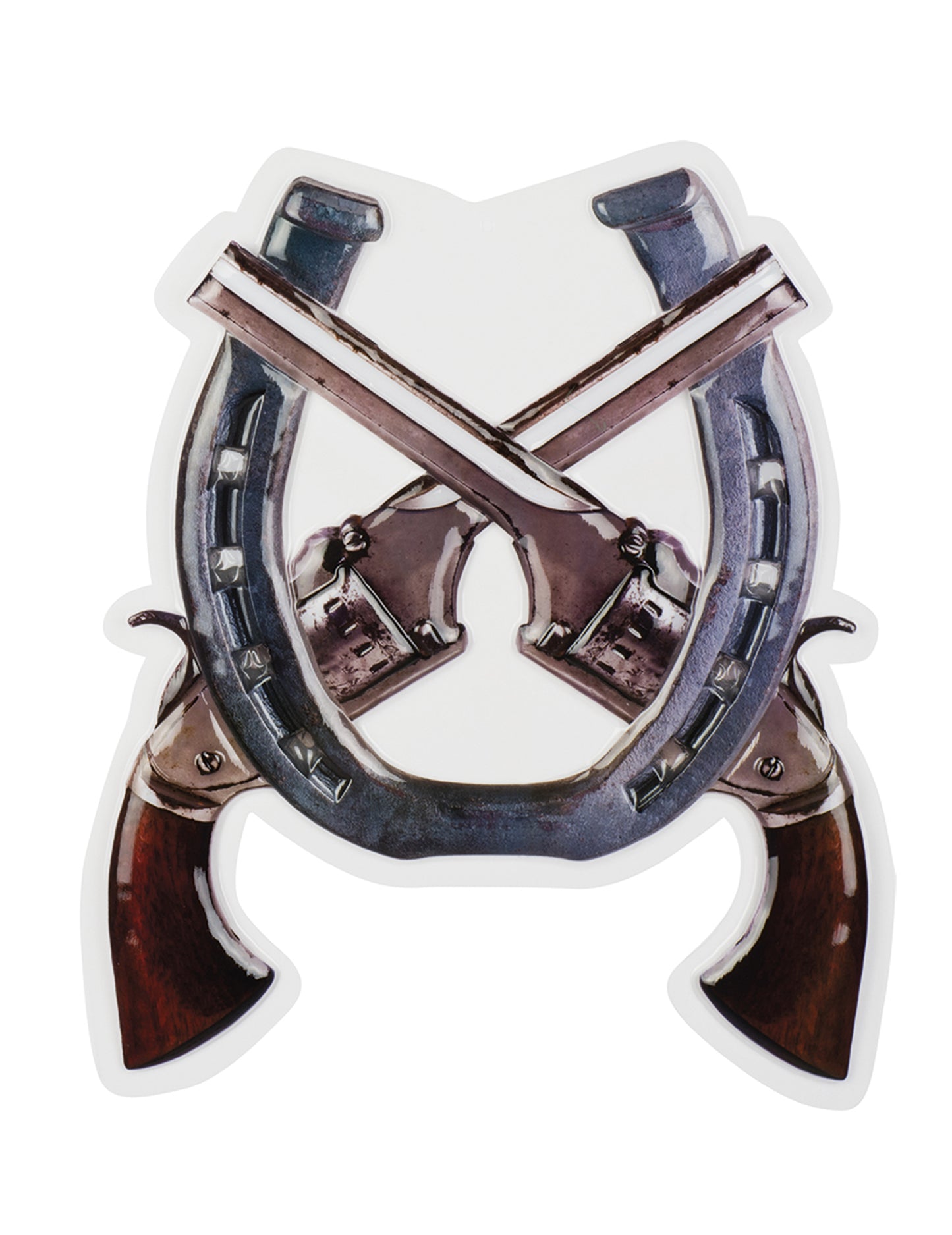 Ova serija sastoji se od ukrašavanja zidova koji se ne odnosi. Ovaj PVC ukras mjeri otprilike 47 x 40 cm. Predstavlja 2 kaubojska pištolja prekrižena potkova, ovaj će ukras biti savršen za dovršavanje vašeg uređenja sobe na zapadnoj temi!