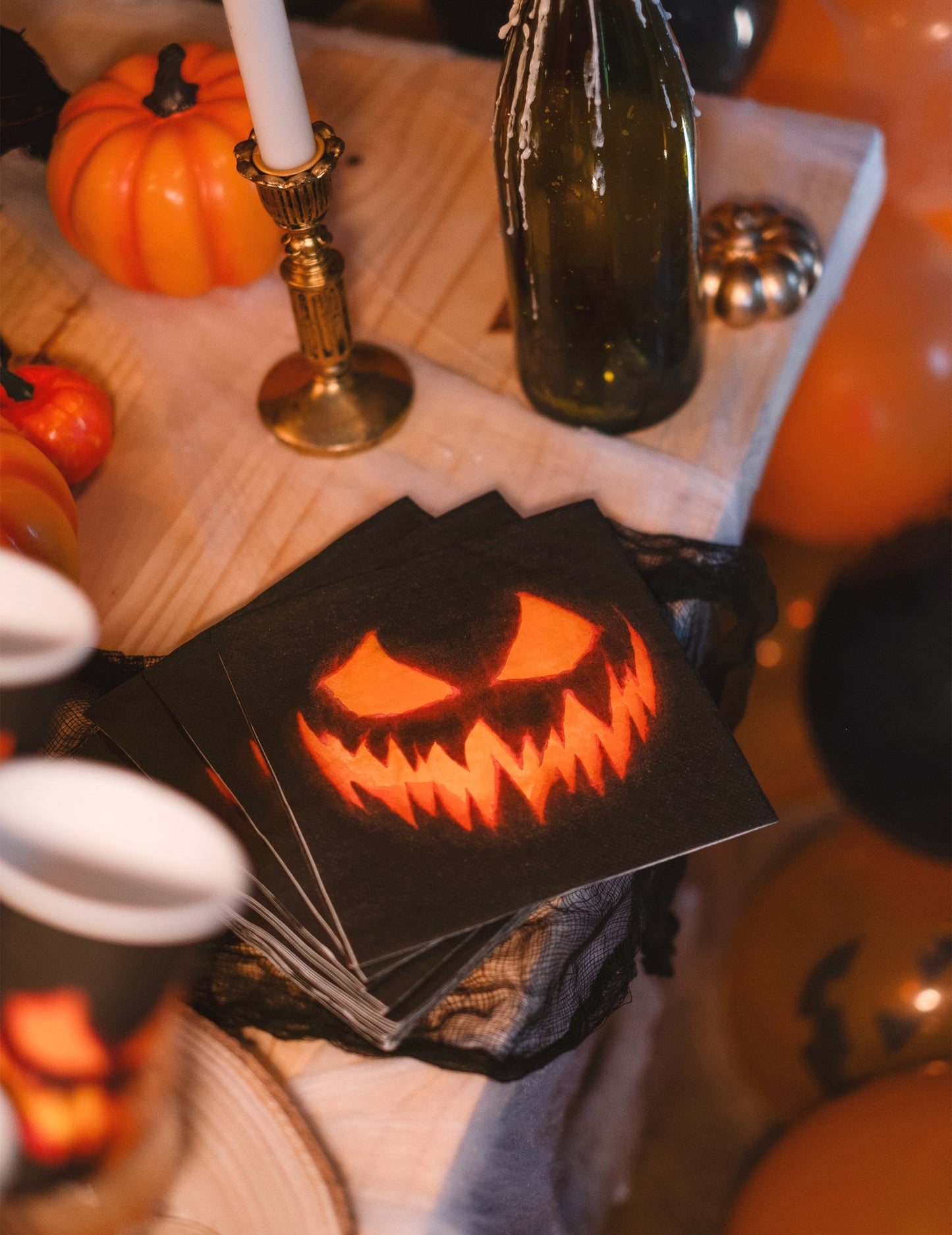 Ovaj se paket sastoji od 12 zastrašujućih papirnatih ručnika od bundeve. Presavijeni, mjere otprilike 16,5 x 16,5 cm. I jednom neugodno 33 x 33 cm. Ručnici su crni. Ukrašeni su slikom grozne bundeve koja ima demonski osmijeh. Ovi zastrašujući ručnici od bundeve savršeni su za dovršavanje vašeg uređenja stola tijekom Noći vještica.