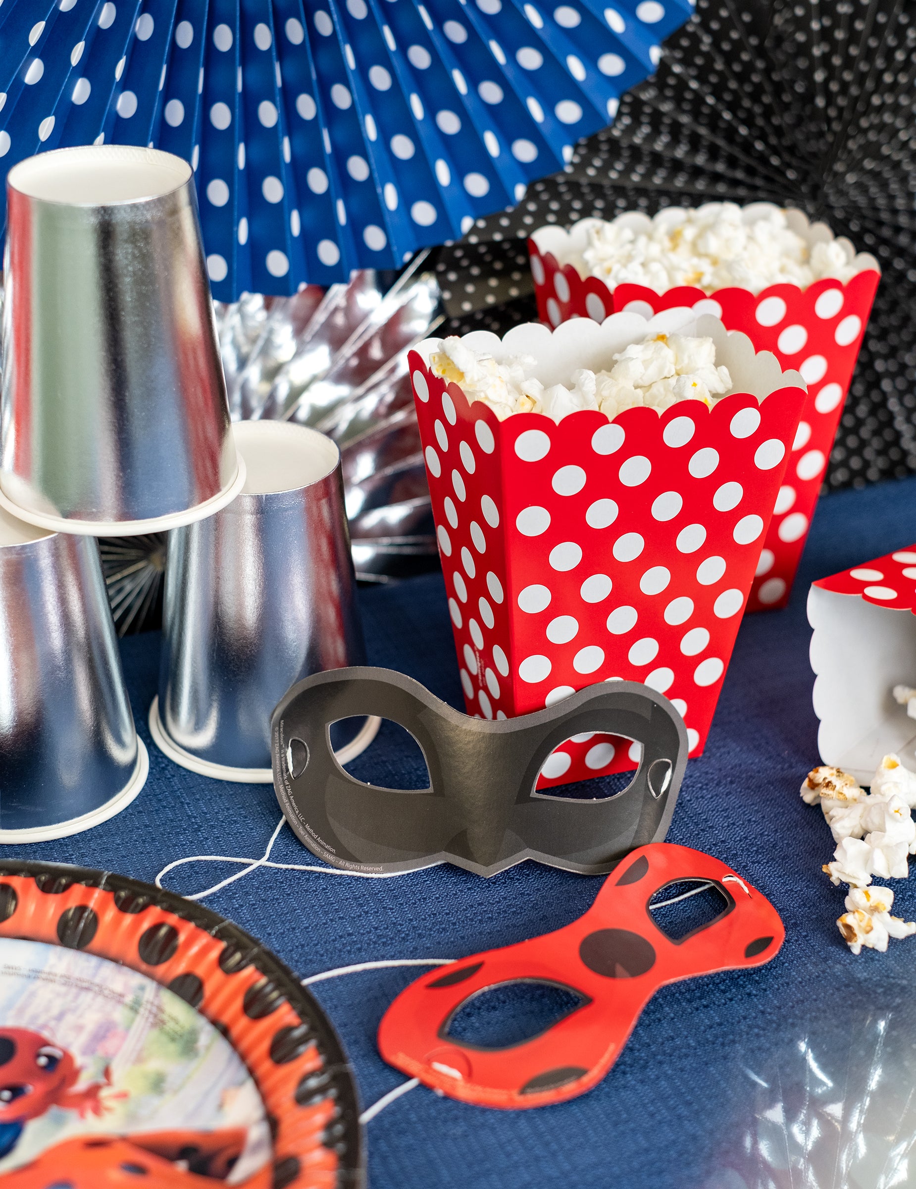 Ova serija sadrži 8 kartonskih maski pod službenom licencom za labaš. Pronaći ćete 4 maske od bubrega i 4 crne maske za chat. Maske od bubamara crvene su s crnim polka točkicama, dok su maske crne mačke obične crne. Oni su otvoreni u očima i drže se elastikom da prođu iza glave. Ove će maske biti savršene za distribuciju djeci tijekom rođendana vaše kćeri! Zamislite igru dviju timova: momčad Ladybug -a i tima Chat Noir!