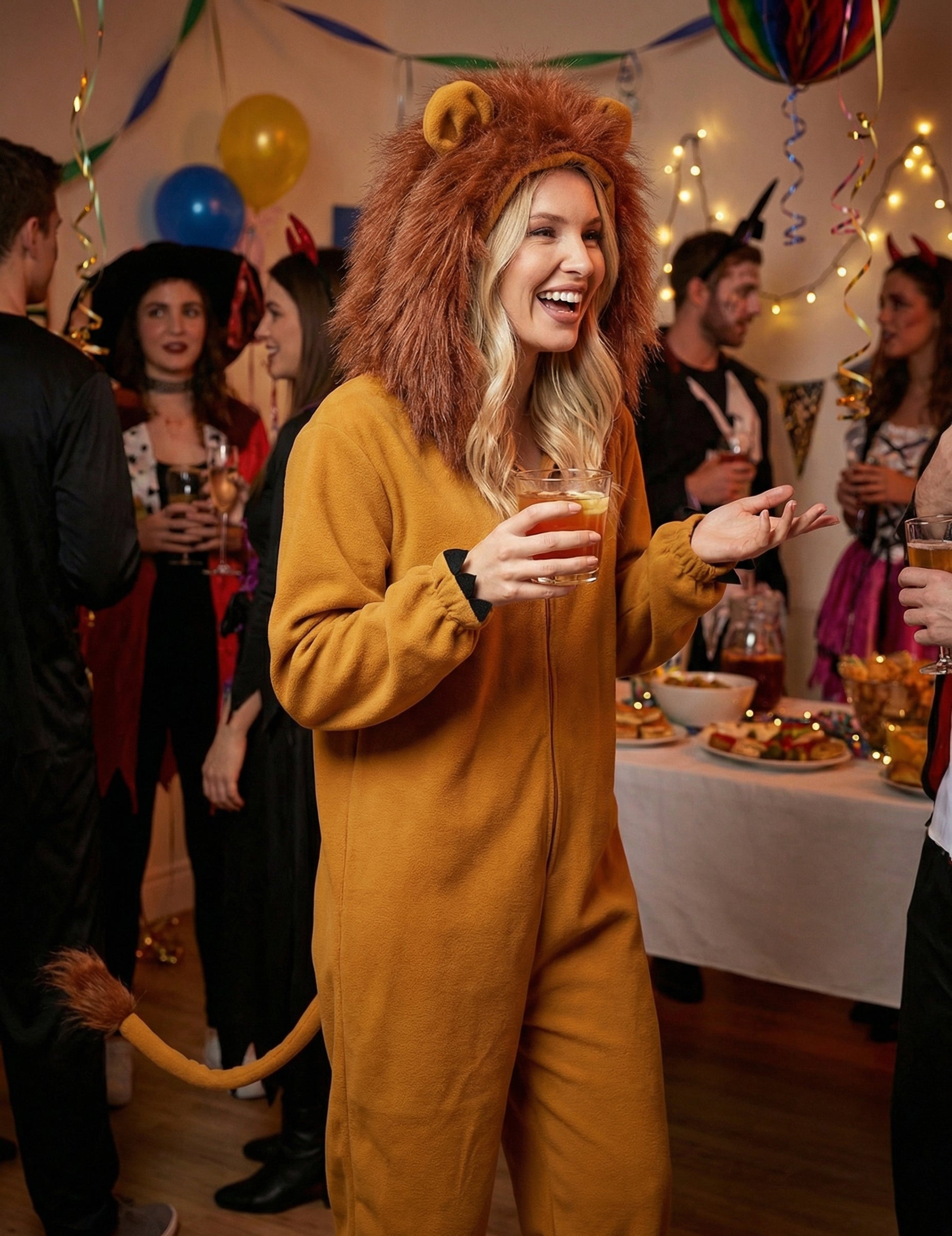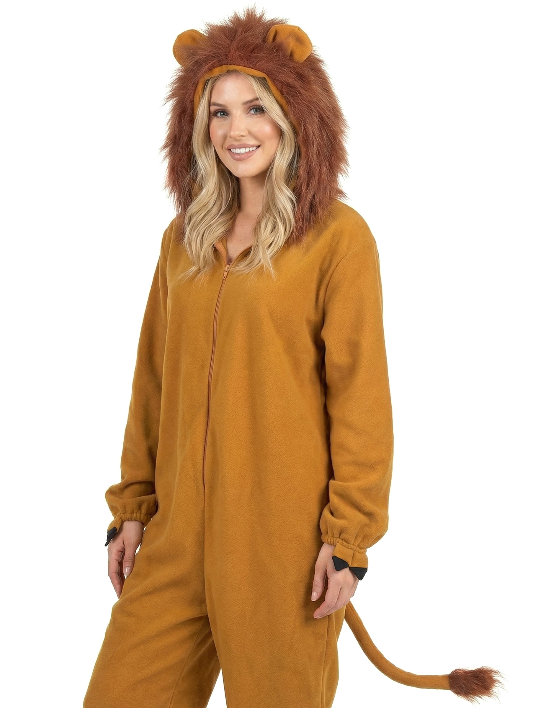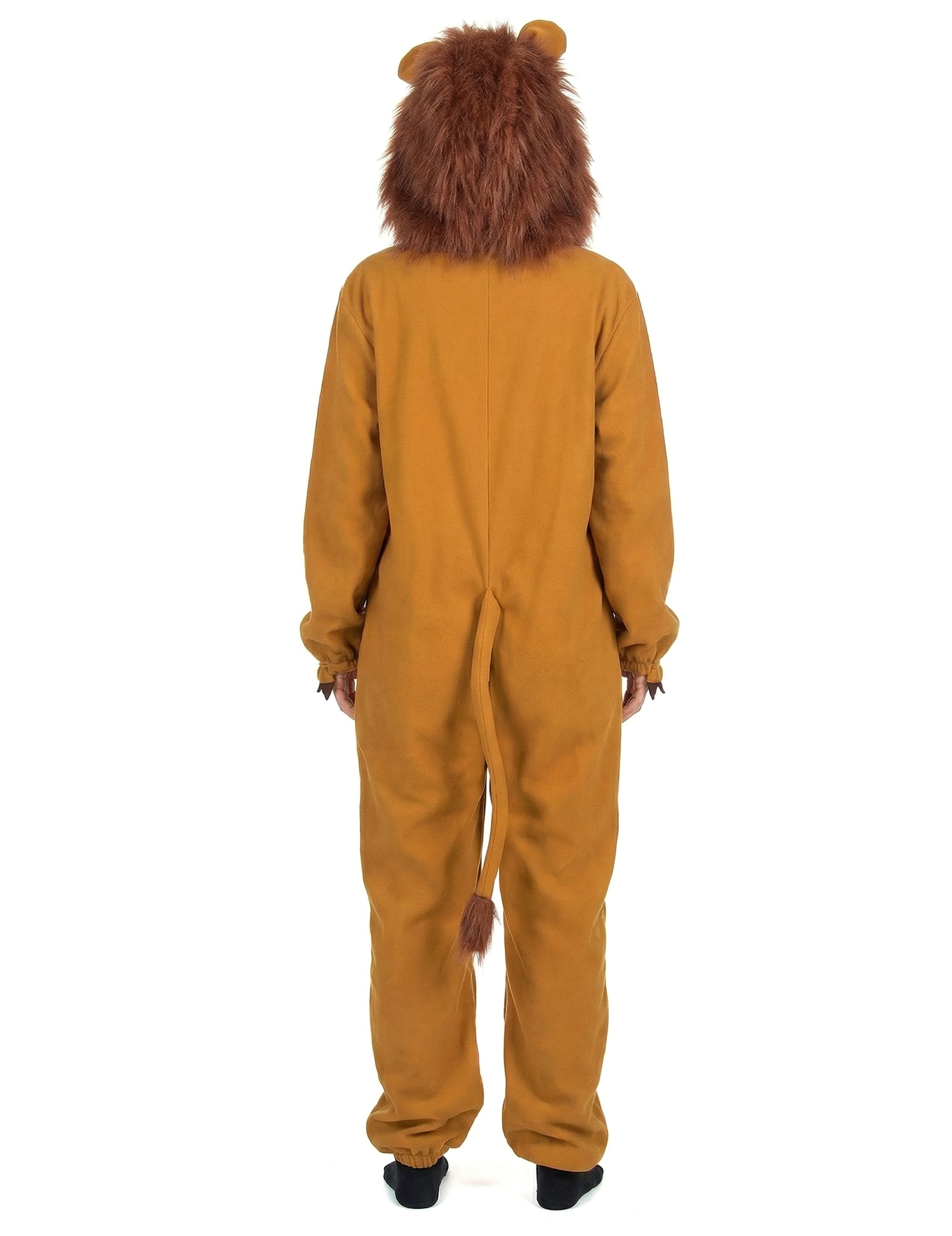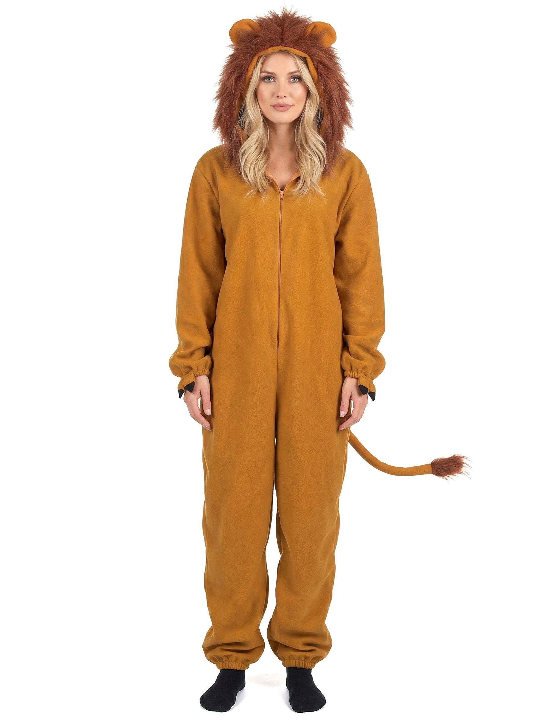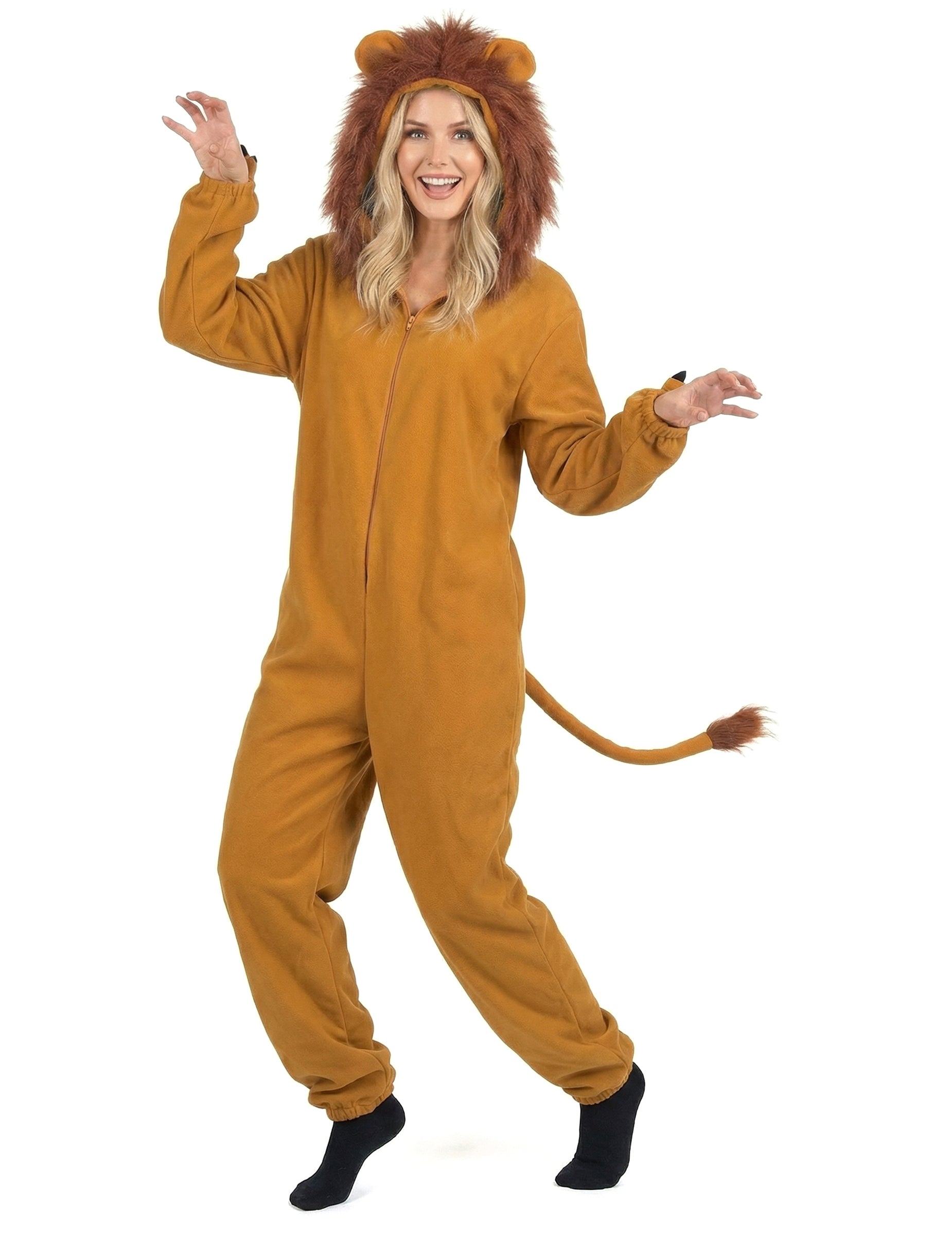Ovaj kostim lavi za žene ugodna je kombinacija za nošenje zatvaranja na prednjoj strani laganim zatvaranjem (čarape nisu uključene). Tkanina za runo od runa bit će ugodna za nošenje. Kombinacija je opremljena kapuljačom s ušima, a posebno plamenom grivom u lažnom krznu. Na stražnjoj strani naći ćete rep koji završava s gomilom kose. Krajevi nogu i rukava su elastificirani kako bi se postigla utjeha i rukovanje. Spremni da iznesete svoju divlju stranu, lažne kandže za zglobove na zglobovima pomoći će vam da paradirate poput lavese u Savanni! Ovaj kostim lavova bit će savršen za karneval ili za večer na temu životinja!