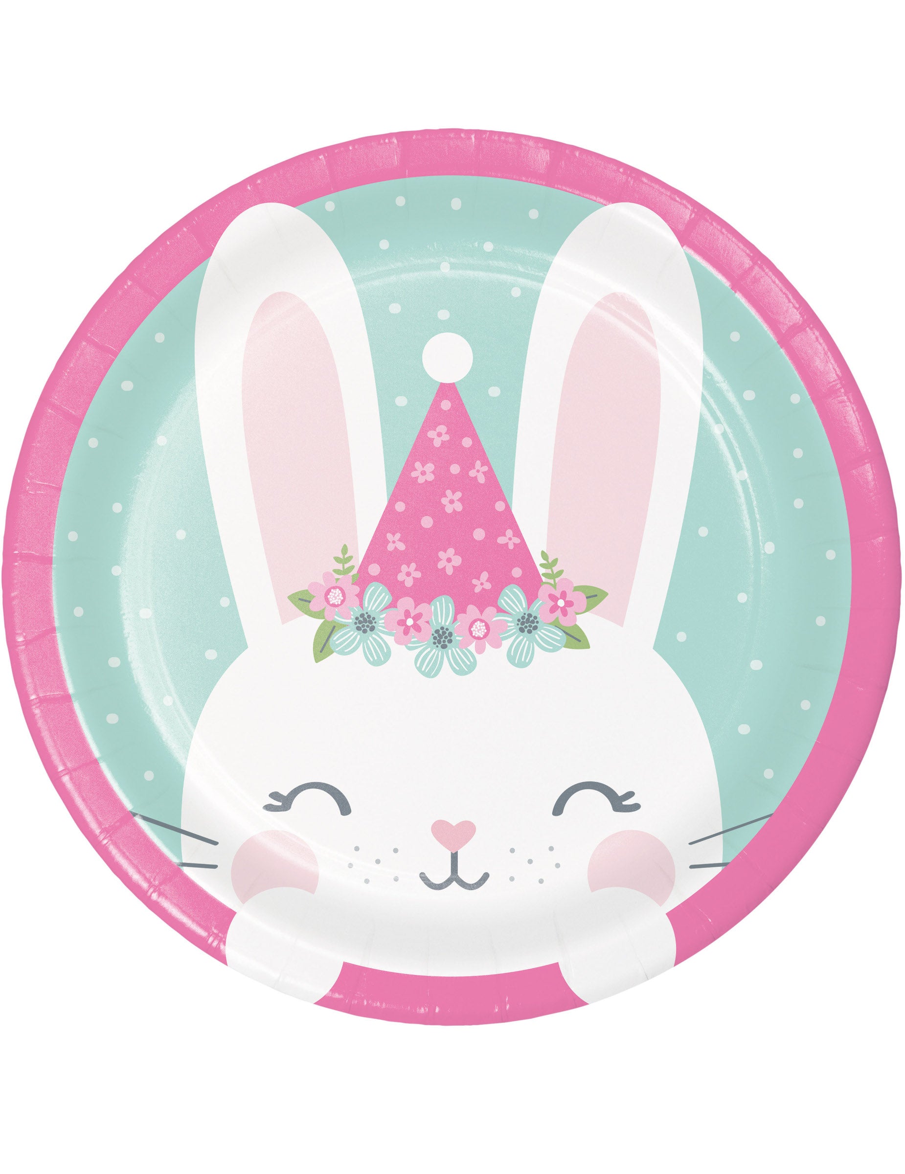 Ce lot comprend 8 assiettes en carton de 18 cm de diamètre. Chaque pièce présente un bord rose et un fond vert menthe à pois blancs, illustré par un petit lapin malicieux arborant un chapeau d'anniversaire à pompon. Ces petites assiettes thématiques sont parfaites pour sublimer la décoration de table lors de l'anniversaire d'une petite fille.