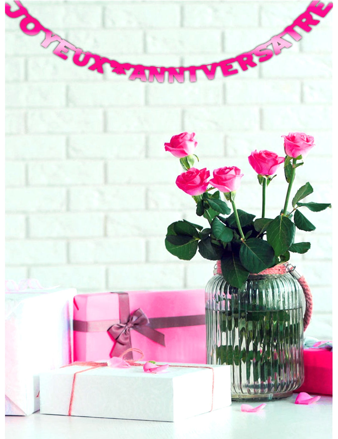 Ovaj karton od fushia dugačak je otprilike 280 cm. Ovaj vijenac predstavlja riječi sretnih rođendana u Fushia slovima visoka 15,5 cm i široka 11,5 cm. Bit će idealno za odijevanje sobe ili vrta povodom rođendana!