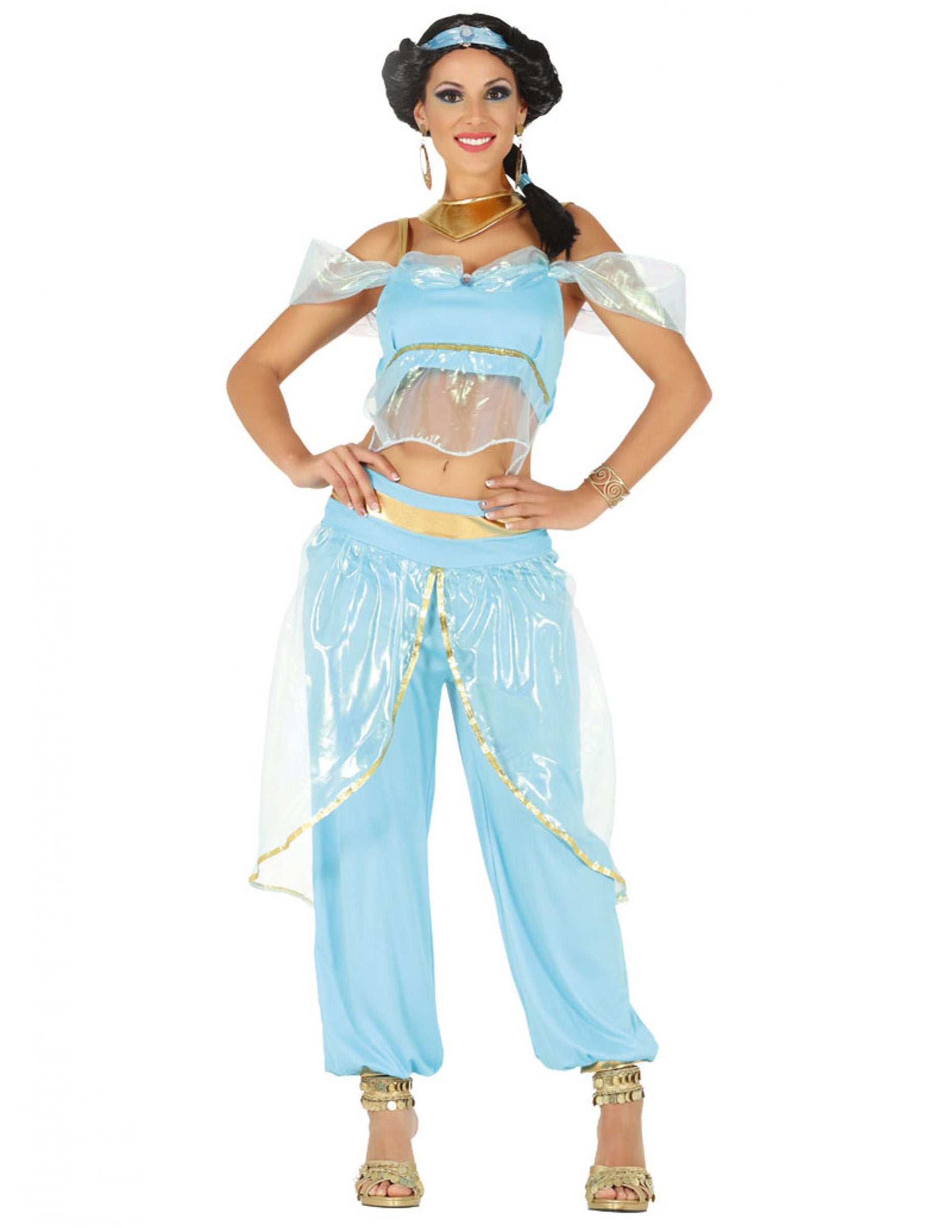 Ova maskiranje kao orijentalna princeza za žene sastoji se od vrha, hlača, traka za glavu i ovratnika (nakit i cipele nisu uključeni). Vrh, vrlo kratak, ostavit će vam trbuh. Nebo je plava s velema koji padaju na ramena i trbuh. Hlače koje odgovaraju su nebesko plava s jedrama u struku. Poziv je na gležnjeve da mu daju malu veličinu. Traka za kosu također je plava, s lažnim kamencem u sredini. Konačno, ogrlica Zlatne pjene dovršava ovaj kostim. Ova prerušavanje u orijentalni plesač bit će savršeno za izradu trbušnog plesa.