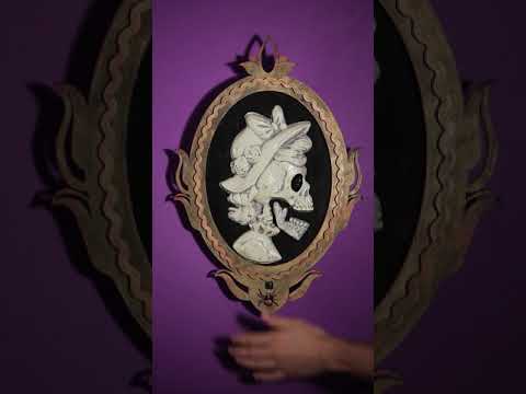 Ovaj ukrasni okvir mjeri otprilike 32 x 48 cm. On predstavlja kosturnu damu u profilu na crnoj pozadini, u okruženju sa zlatnim tonovima. Skeletonsko oko svijetli crveno i aktivira se detektorom pokreta. Lady Skeleton recitira 4 različite rime na engleskom jeziku i istovremeno pomiče mahore. Ovaj okvir funkcionira pomoću 3 AAA baterije. Bit će savršeno dovršiti svoj ukras na večeri Noći vještica.