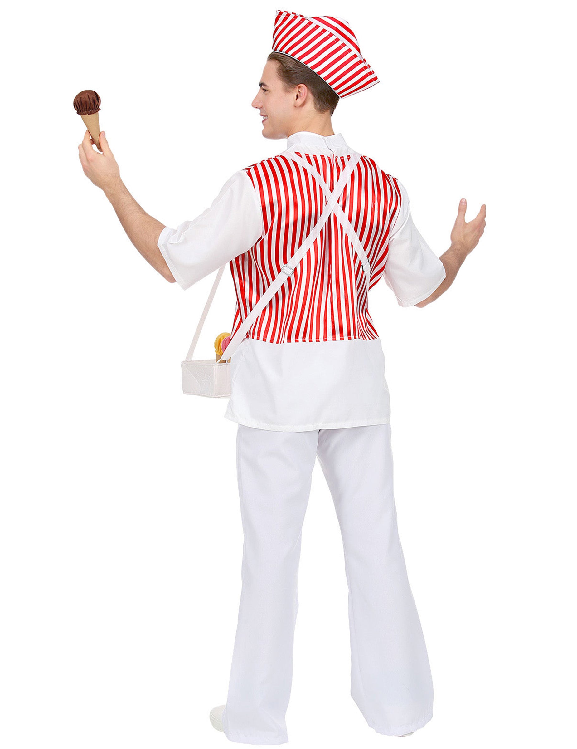 Krema za prodavače kostima namijenjena je za muškarce, sastoji se od košulje s prslukom, kravatom s lukom, šeširom i konusnom ladicom s 6 konusa sladoleda. Košulja je bijela s lažnim bijelim i crvenim prugama i lažnim prozirnim prištićima s prednje strane. Crvena se nalazi i na čvoru leptira na ujedinjeni način, a na šeširu također s bijelim i crvenim prugama koje se povezuju s lažnim prslukom. Konusna ladica sa 6 stožca sladoleda isporučuje se kako bi se savršeno prihvatilo kostim. Ovaj prodavač sladoleda bit će idealan za prikriveni događaj.