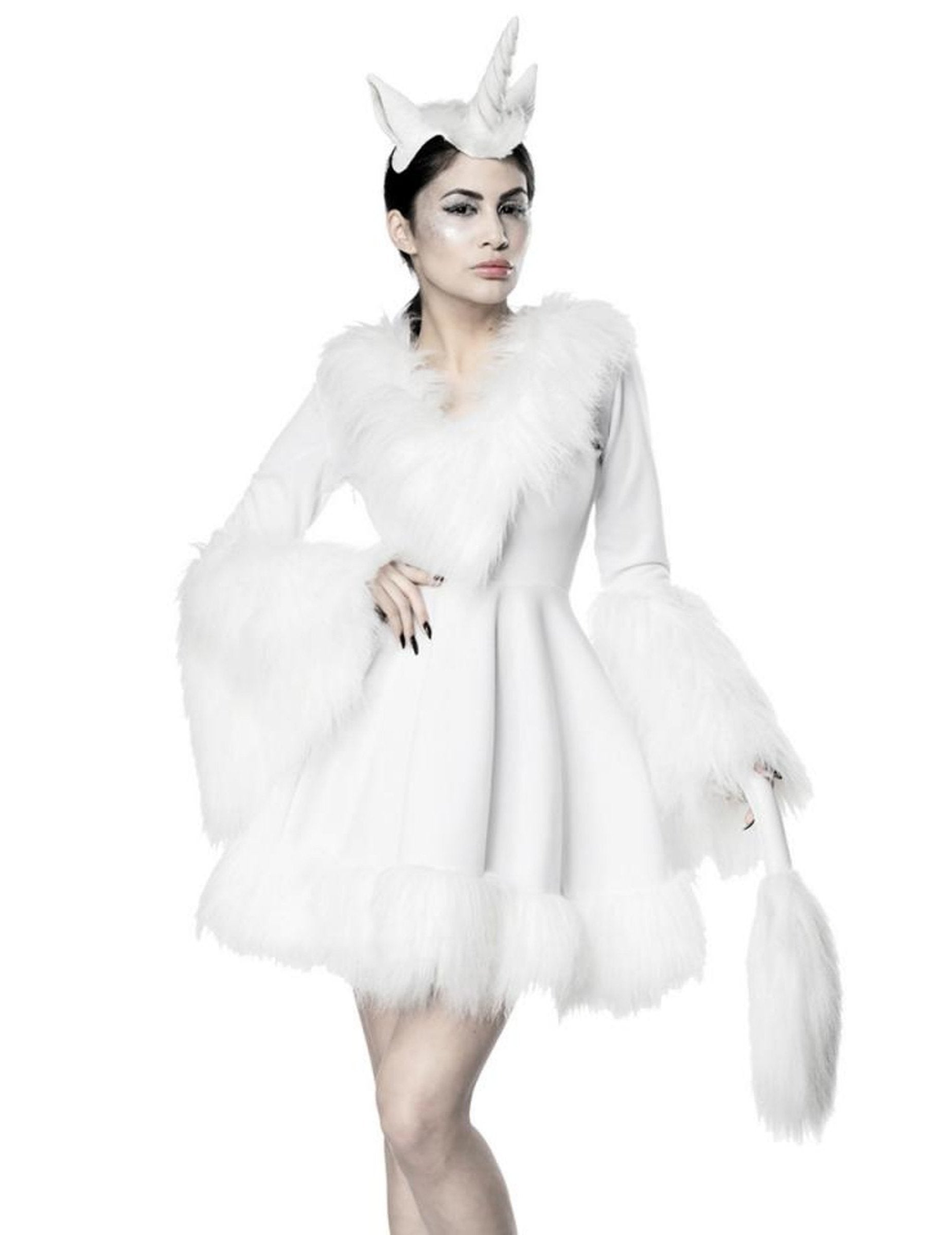 Ovaj seksi bijeli kostim jednoroga namijenjen je ženama. Ima haljinu i traku za glavu (torba nije uključena). Haljina je izrađena u kvalitetnoj tkanini. Bijela je boje s krajem rukava, suknje i kvalitetnim ovratnikom od umjetnog krzna. Ova je haljina zakrivljena u struku s razmaženim rezom na dijelu suknje kako bi se poboljšala vaša silueta. Ona također ima dugačke rukave u krznu za još seksipilniji prikaz. A da biste dovršili vrlo seksi krznu kapuljaču, ušivena je s haljinom, čak možete nositi traku za glavu preko haube za visokokvalitetno prikazivanje. Bijela traka za glavu predstavlja uši i rog ovog bijelog jednoroga s krznom svuda okolo. Ovaj bijeli kostim jednoroga bit će savršen za dobivanje seksi izgleda na Dan karnevala ili za tematsku večer jednoroga.