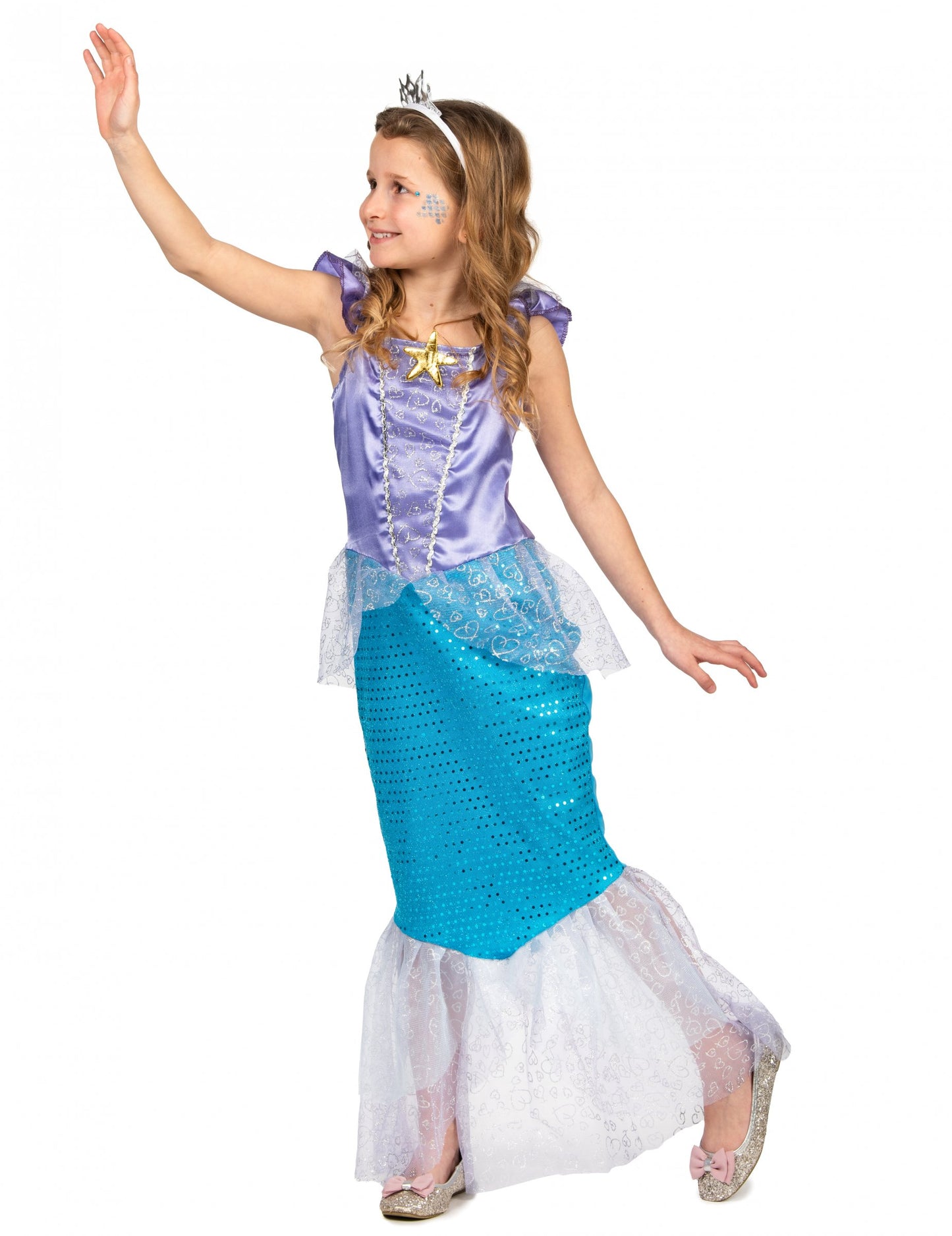 Ovaj kostim sirene sastoji se od haljine i staklenika za glavu. Haljina je duga i predstavlja tijelo sirene s nogama koje formiraju riblje. Vrh je sateno ljubičasto, dno je tirkizno plavo sjajno za oponašanje ribljih vaga, a dno haljine ima jedra od tila za oponašanje peraje ribe. Glava staklenika je srebrna kruna koja će savršeno dovršiti ovaj kostim. Ovaj kostim sirena bit će savršen tijekom prerušene večeri ili za karneval!