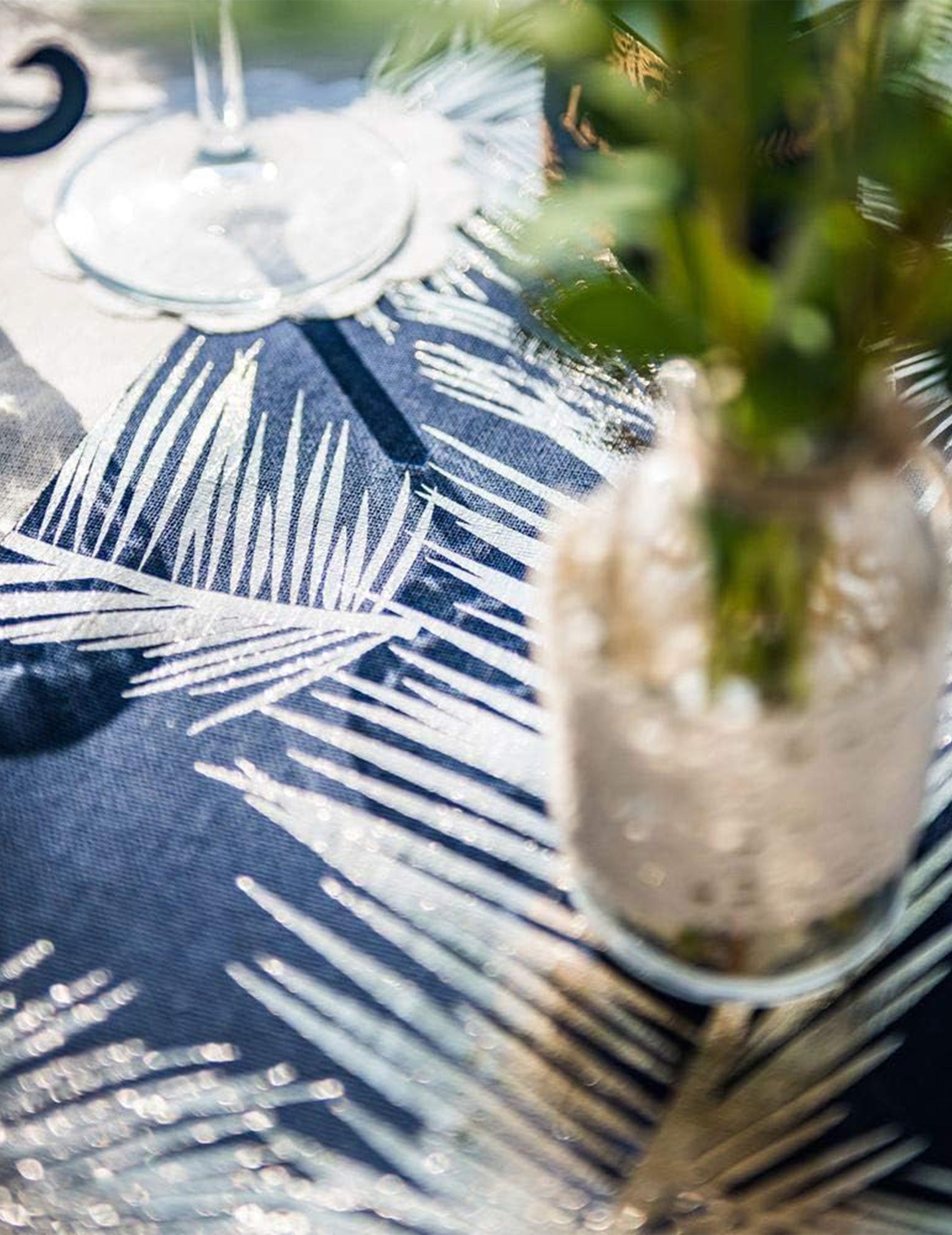 Njegova tamnoplava pozadina ukrašena je nježnim uzorcima paprati pozlaćeno za svjetlucavi efekt. Ovo stolnjak savršen je dodatak za dodavanje šik dodira brak ili rođendan.