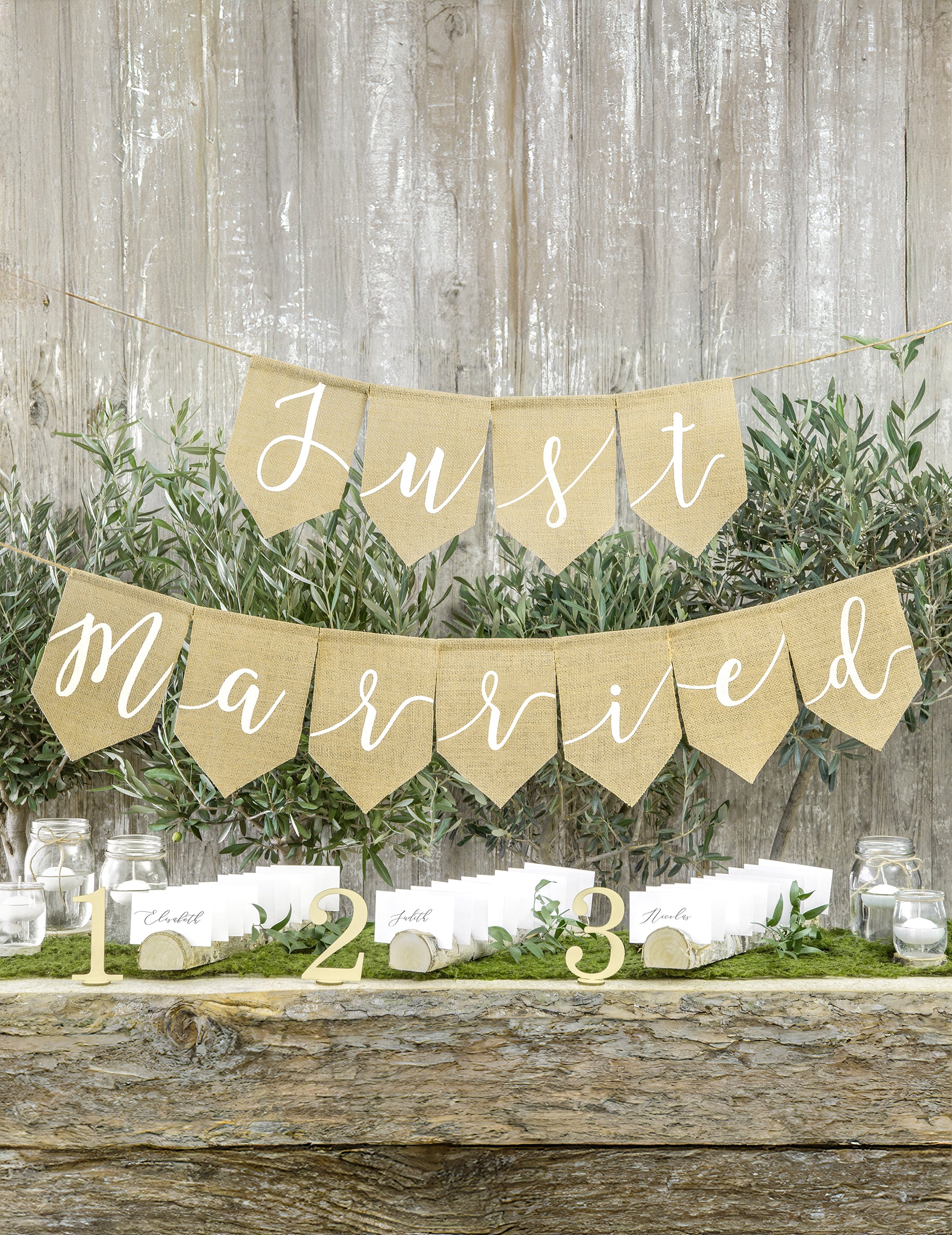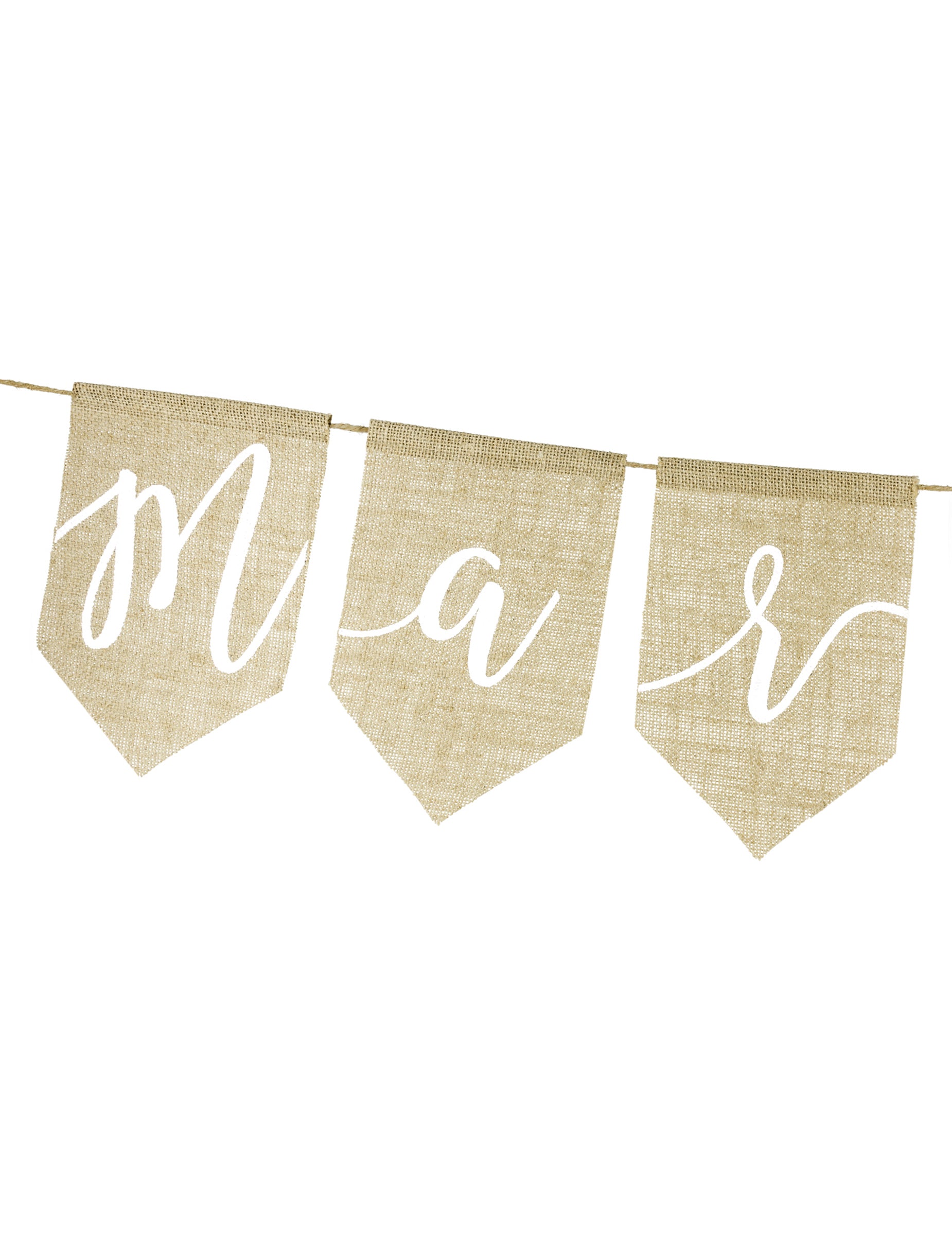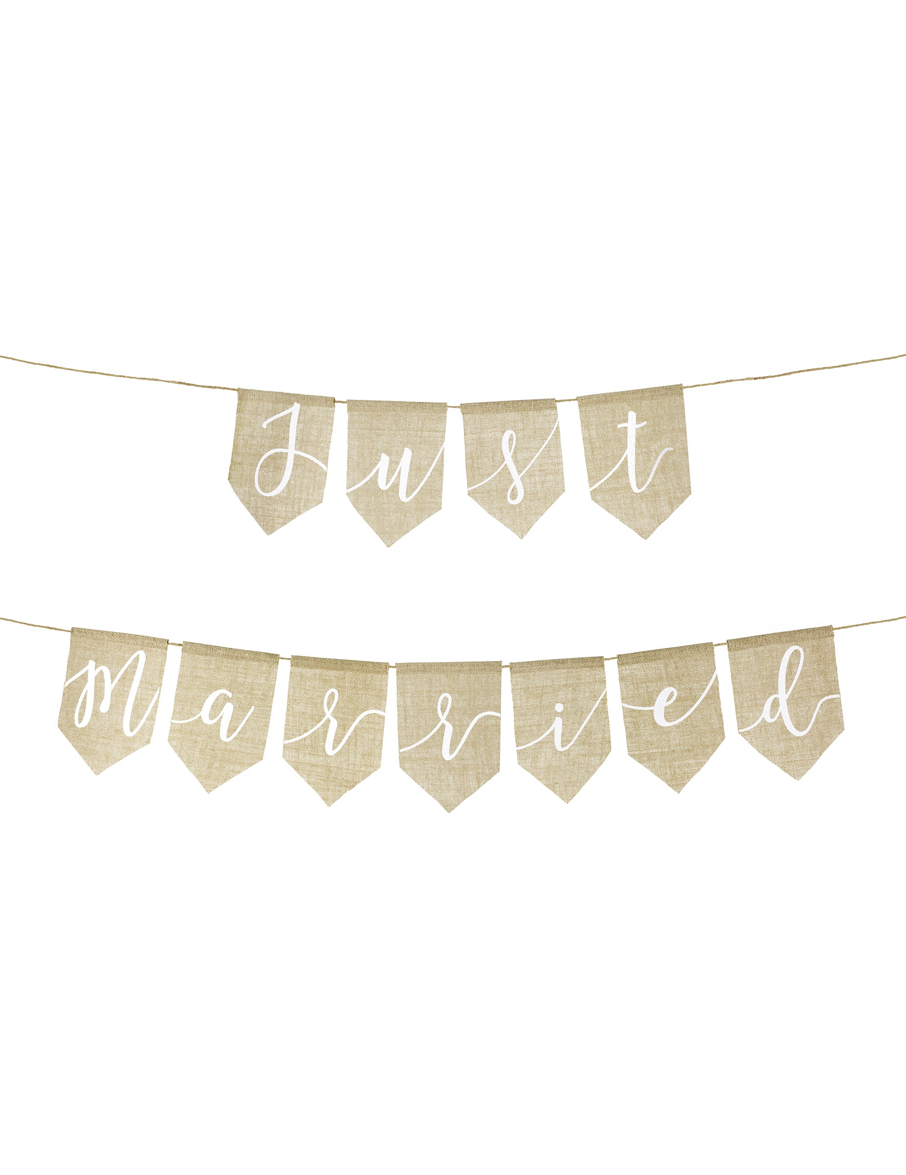 Apportez un esprit authentique à votre fête avec cette bannière "Just Married" comprenant deux guirlandes à fanions en jute. L'ensemble se compose d'un pan arborant le mot "Just" de 65 x 23 cm et d'un second avec "Married" de 120 x 23 cm. Cette bannière est l'accessoire parfait pour une décoration de mariage au look naturel et vintage.