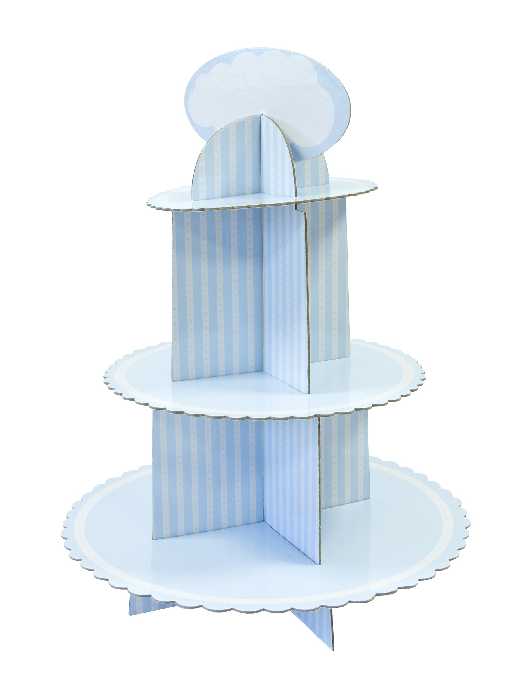 Pokažite svoje pecivo s ovim stalak za kolačiće Izrađen od čvrstog kartona. Dostupan u nijansama plave i bijele, ovaj ukrasni dodatak mjeri 30 x 42 cm. cm otprilike. Ovo izložbeni štand bit će nezamjenjiv za predstavljanje vašeg kolačići tijekom rođendanska zabava svečani ili baby shower nezaboravan.