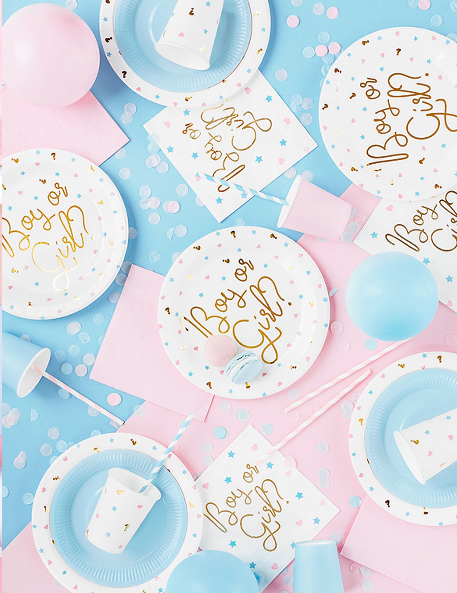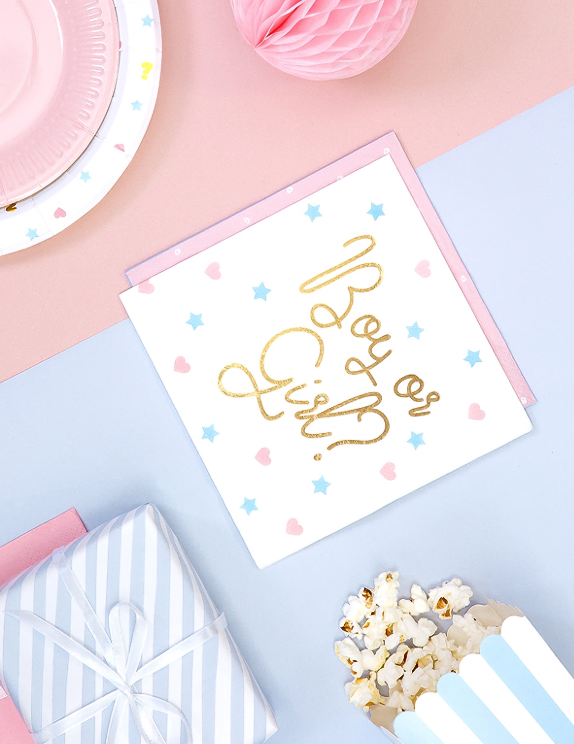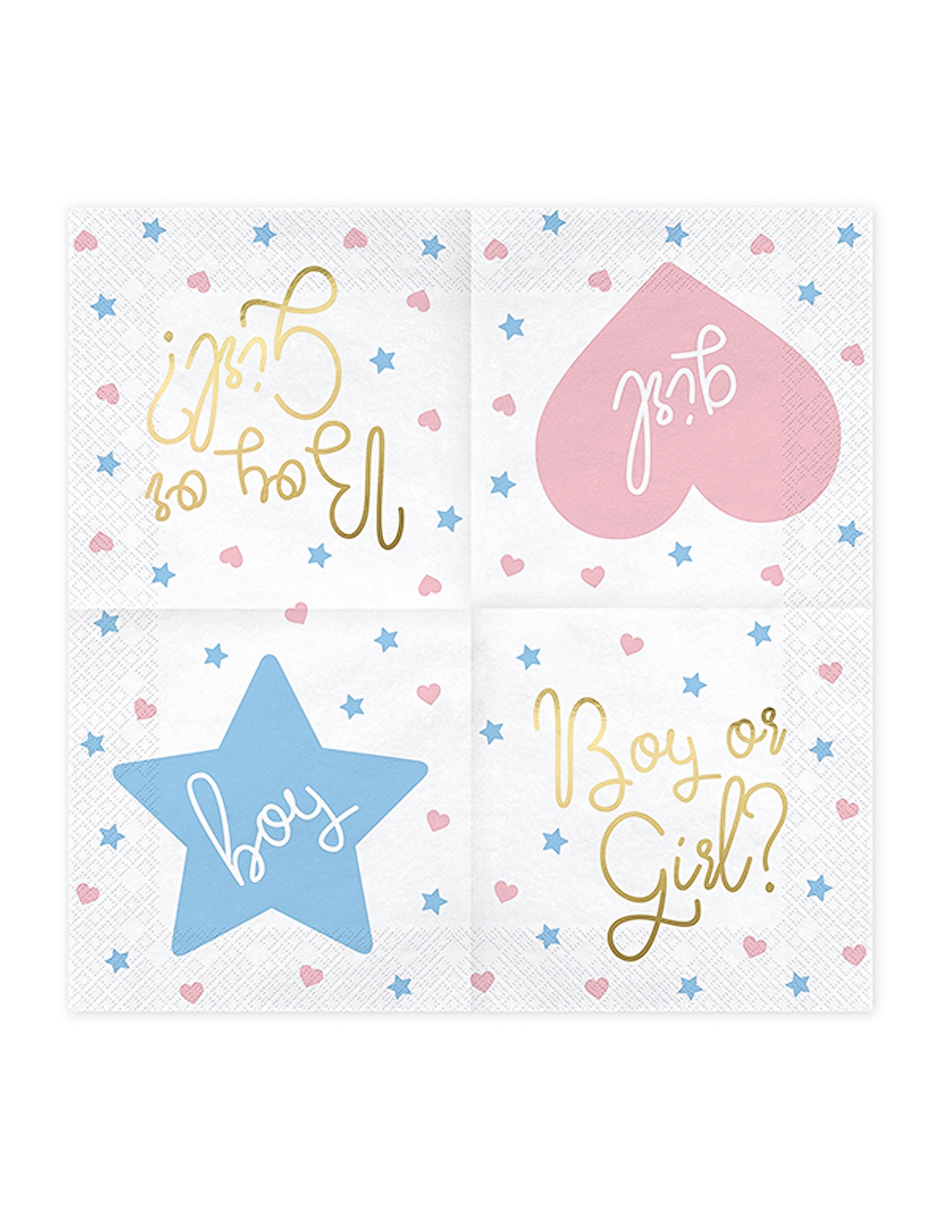 Apportez une touche de mystère à votre événement avec ce paquet de 20 serviettes jetables. De couleur blanche, elles affichent le message « Boy or Girl ? » en lettres dorées, entouré de jolis motifs étoilés bleus et de cœurs roses. Le verso propose un design différent avec un cœur « Girl » ou une étoile « Boy ». Une fois ouvertes, ces décorations de table affichent des dimensions de 33 x 33 cm. Ces serviettes sont parfaites pour animer la révélation du genre lors d'une baby shower conviviale.