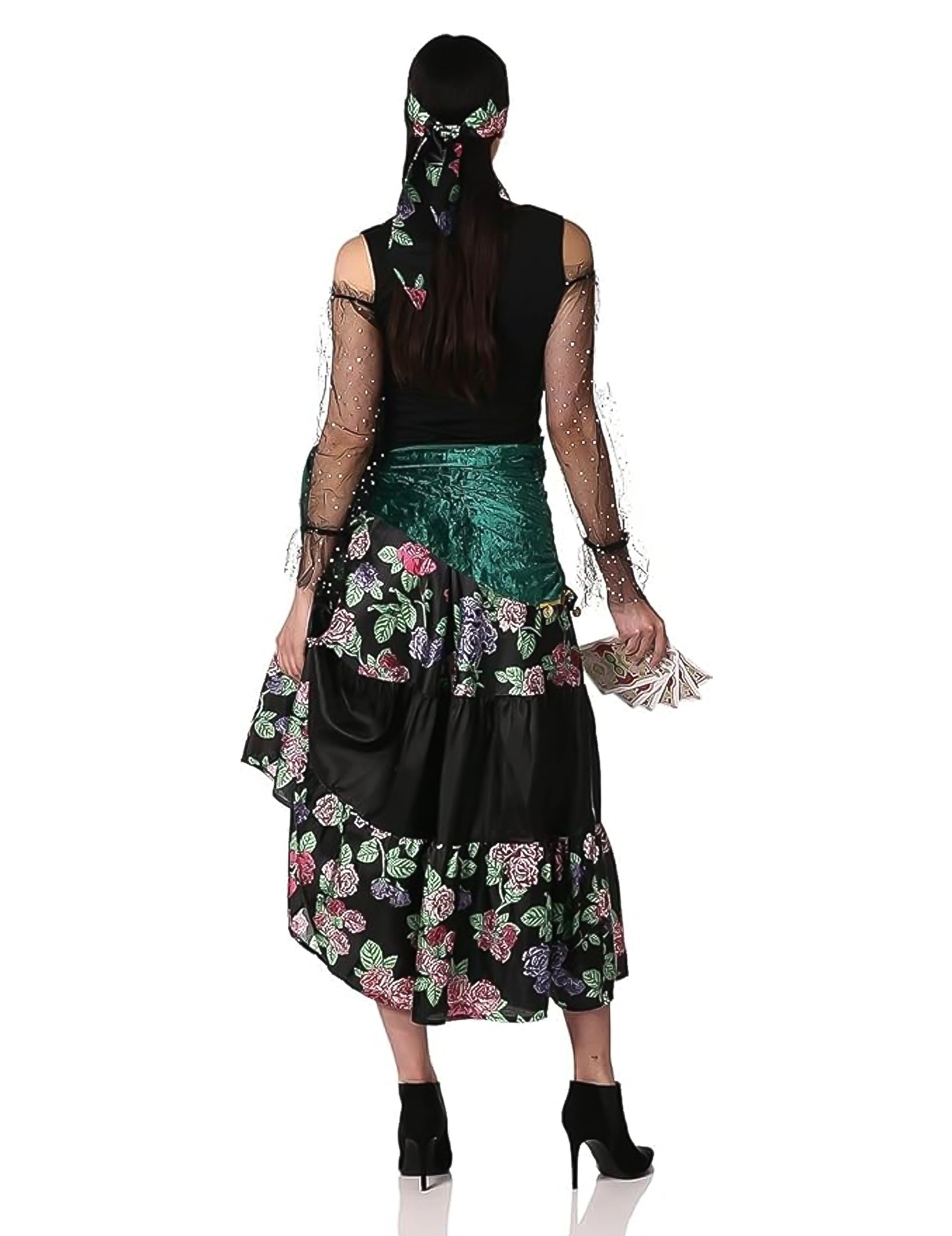 Ovo je vodio kostim za žene sastoji se od košulje s korzetom, suknje, pojasa, trake za glavu i 6 taro kartica. (Kristalna kugla, ogrlica i cipele nisu uključeni). Košulja je crna s prozirnim dugim rukavima i ljubičastim korzetom s narančastim vezanjem. Pojas je zeleni s ukrasima u obliku zlatnih kovanica. Ovo će prilagoditi vašu veličinu i dodati crnoj suknji s uzorcima u ružama. Crni transparent prisjetit će se uzoraka ruža suknje. 6 Tarot kartica donijet će ovaj aspekt dobrog avanturističkog stanja. Ovaj će kostim biti savršen da vas stavi u cipele špica za Noć vještica.