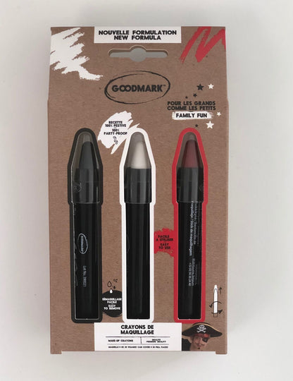 Ova serija sastoji se od 3 olovke za šminkanje. Imat ćete crnu olovku, bijelu i crvenu. Za mlade i stare ove će se obojene olovke omogućiti da dovršite bilo koju vrstu kostima: mime, kostur, gusar ... bilo da se radi o karnevalu ili za Noć vještica, pomognete sebi s tim olovkama kako biste stvorili prilično make -Up. Sastojci: Bijelo: CI 77891, ulje sjemenki Ricinus communis, gliceril stearat, peg-100 stearat, parafinum licum, ceteareth-20, sorbitan laura, Cera alba, polisorbat 20, fenoksietanol, sorbinska kiselina, tokofer. Crno, crveno: ulje sjemenki ricinus communis, gliceril stearat, perarat PEG-100, parafinum licum, ceteareth-20, cera alba, sorbitan laurat, polisorbat 20, fenoksietanol, sorbinska kiselina, tokoferol. (+/-): CI 77499, CI 12490, CI 73360.