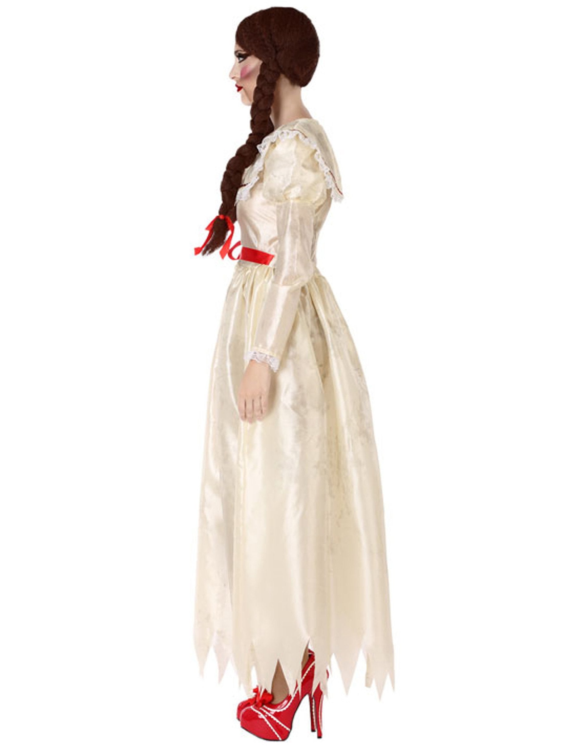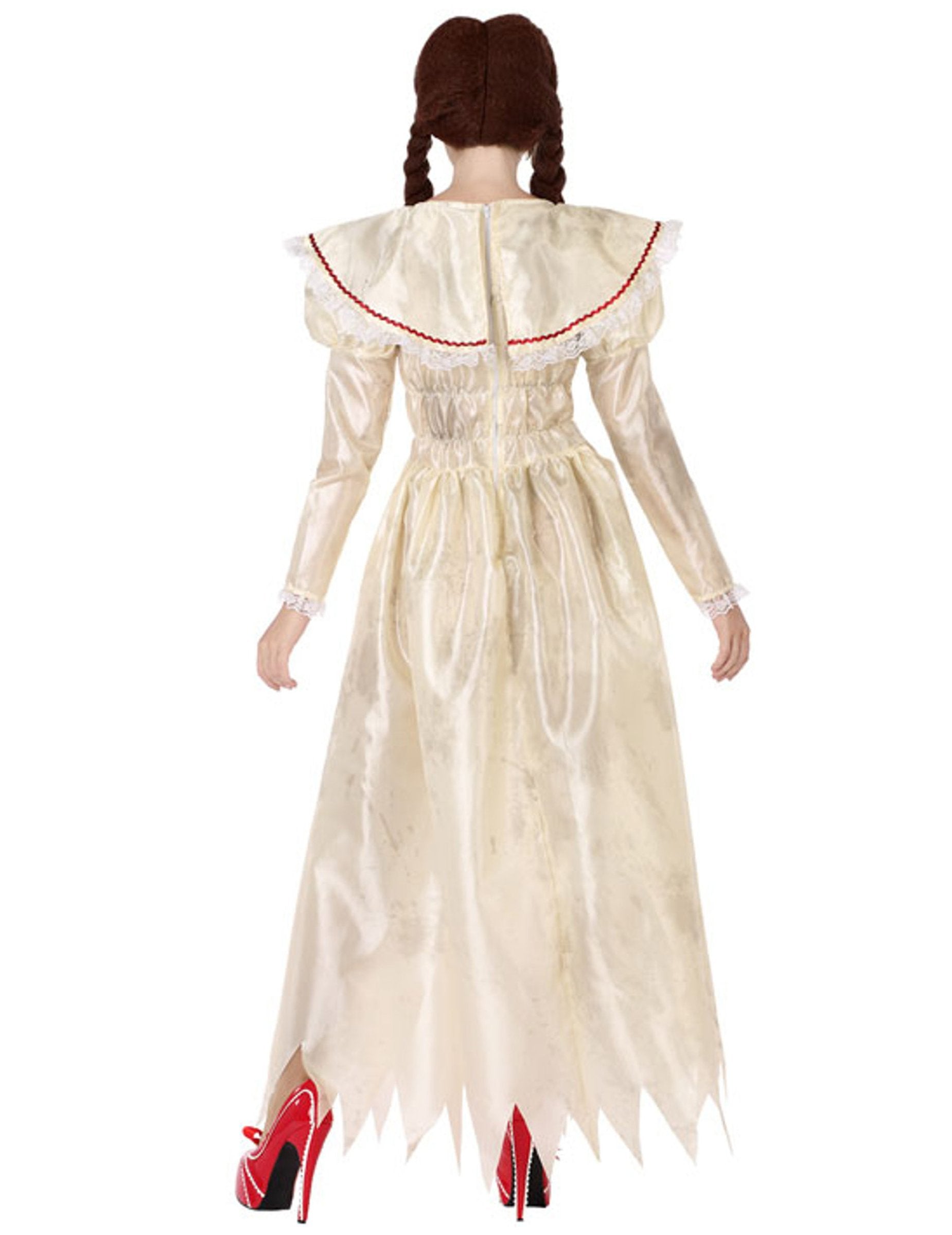 To je prerušavanje za odrasle. Sastoji se od haljine (cipele nisu uključene). Ova dugačka haljina ima ovratnik s crvenom granicom koja pada na ramena. Duga je i zategnuta na veličini crvenom vrpcom. Bit će savršeno za maskiranje kao zlu vintage lutku za Noć vještica!