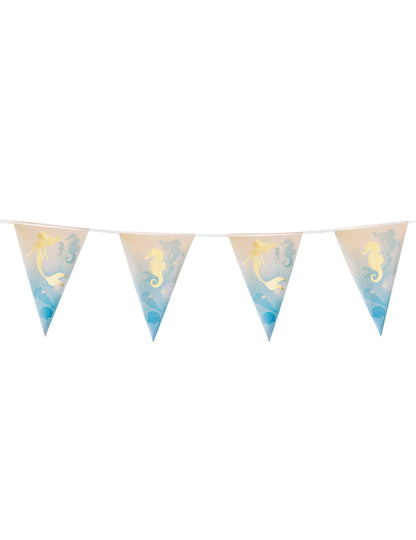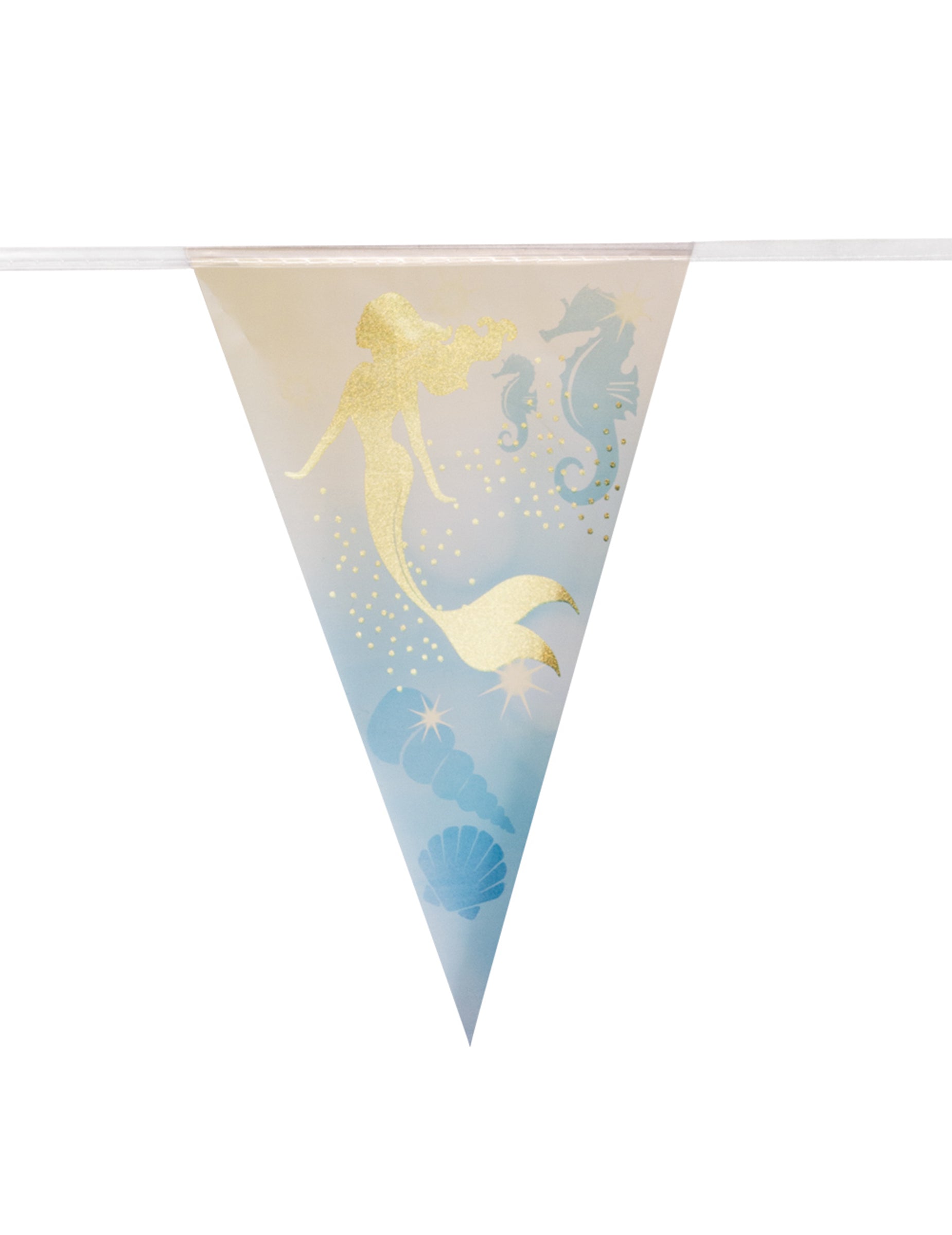 Ovaj plastični vijenac od 4 m sastoji se od 10 zastavica. U plastici ove zastave mjere otprilike 30 x 20 cm. S jedne strane, zastave se tiskaju sa zlatnim sirenama i hipokampima na plavkastoj pozadini. Ovaj će vijenac savršeno dovršiti vaš svečani ukras za rođendan tematske sirene.