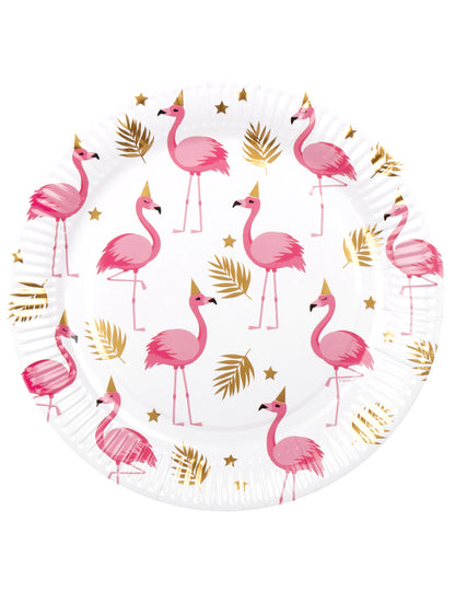 Ove kartonske ploče prodaju se do 10. Promjer im je oko 23 cm. Bijeli, imaju uzorke flamingosa i zlatnih tropskih listova. Ove trendovske ploče bit će idealne za vašu flamingo tematsku zabavu!