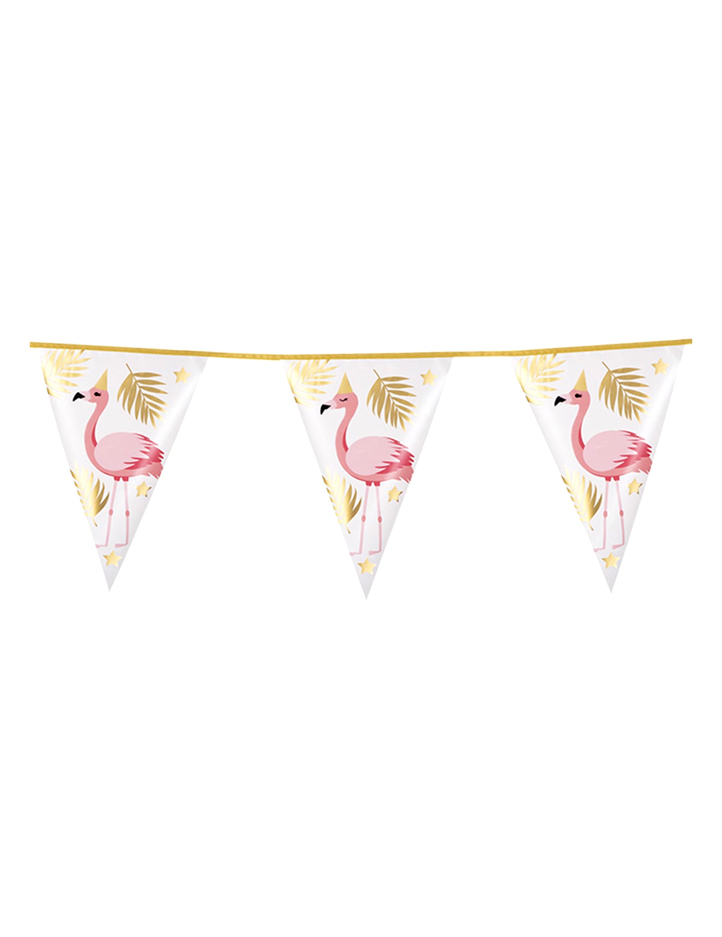 Ovaj vijenac sastoji se od plastičnih zastavica. Ima oko 4 metra. Njegove bijele zastavice, dimenzija 30 x 20 cm, imaju uzorke flamingosa i tropskog lišća. Ovaj će tajnik tajne biti savršen kao dekor za vašu zabavu na temi Flamingo!