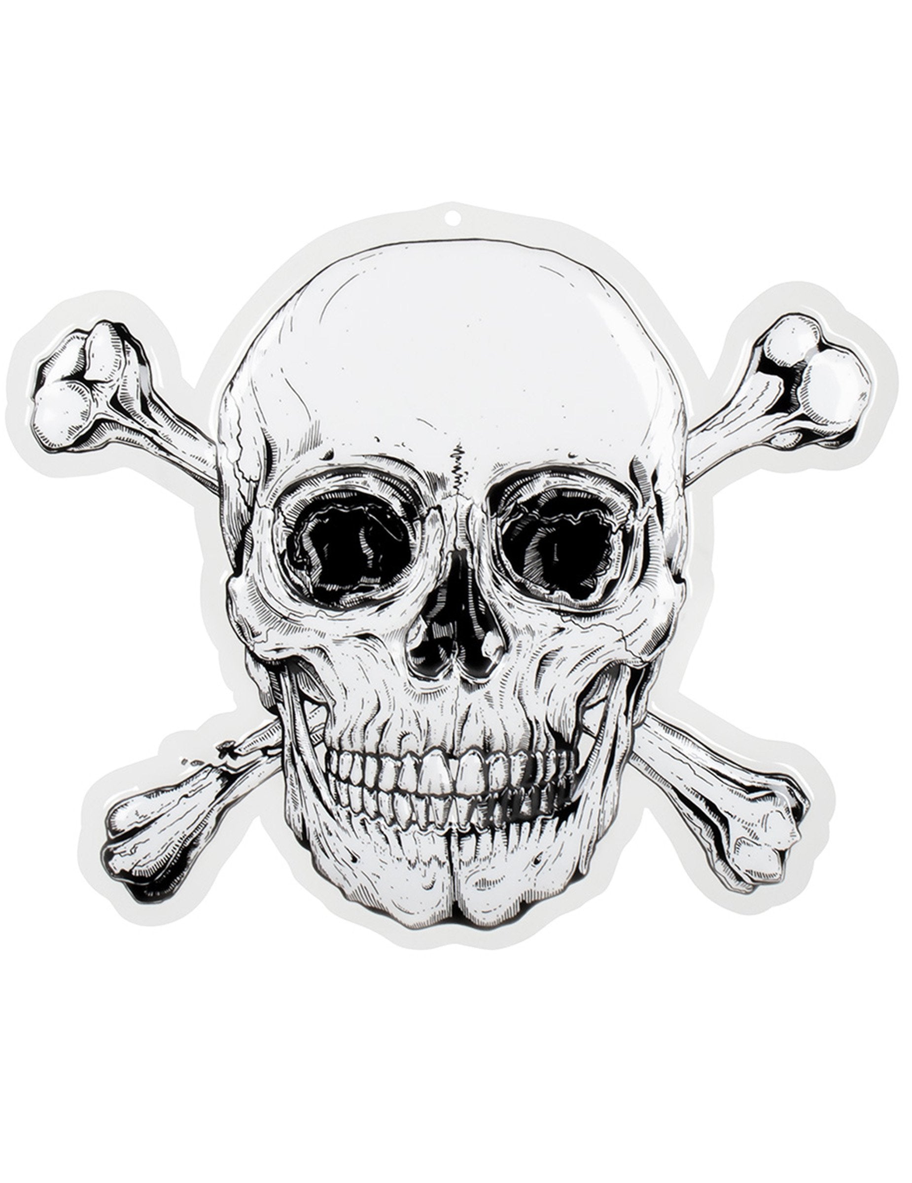 Ovaj zidni ukras je u obliku lubanje. U plastici je otprilike 50 x 42 cm. Predviđene su male rupe za jednostavno vješanje. Pretvorite svoju sobu u piratski brod za tematsku zabavu s ovom zidnom lubanjom!
