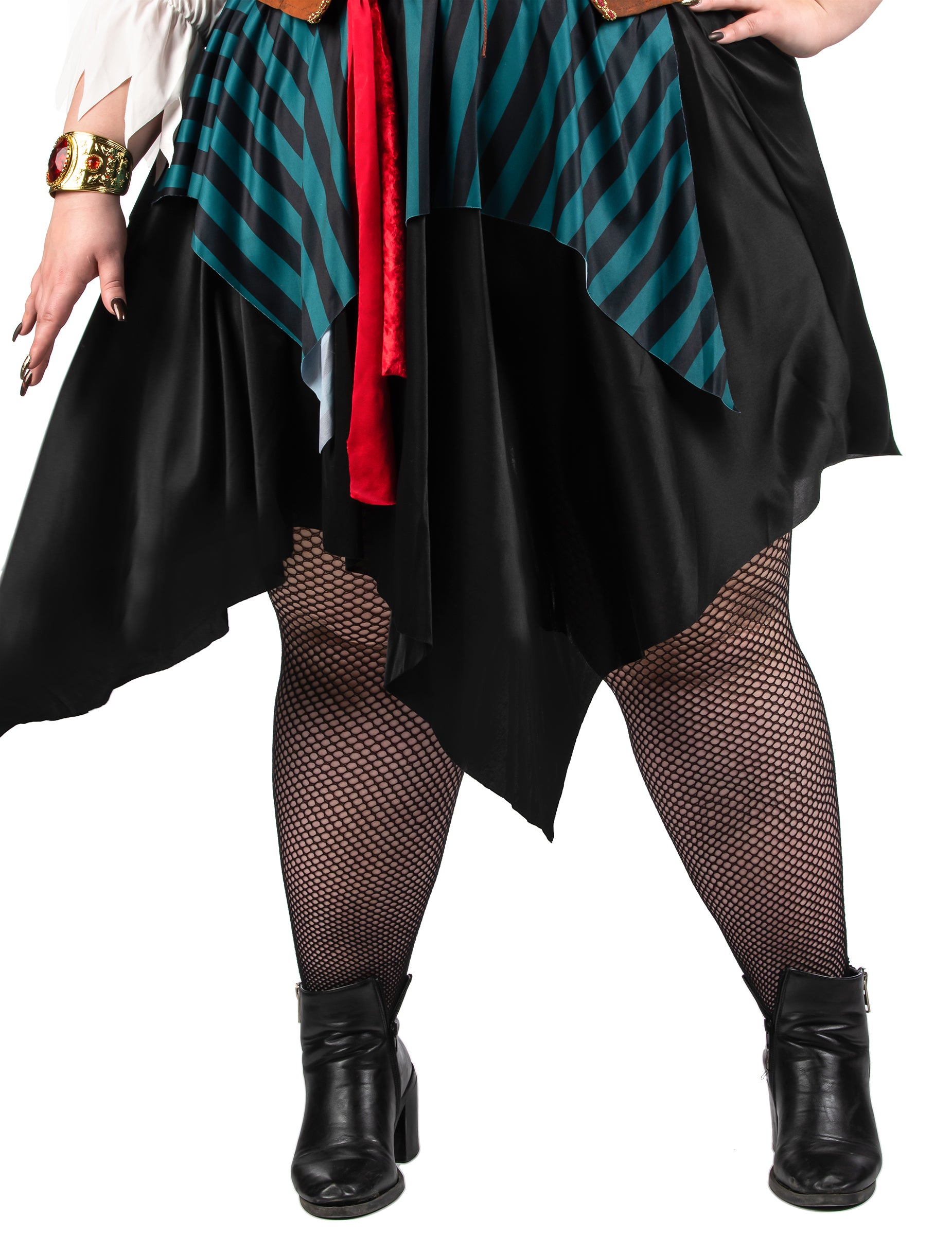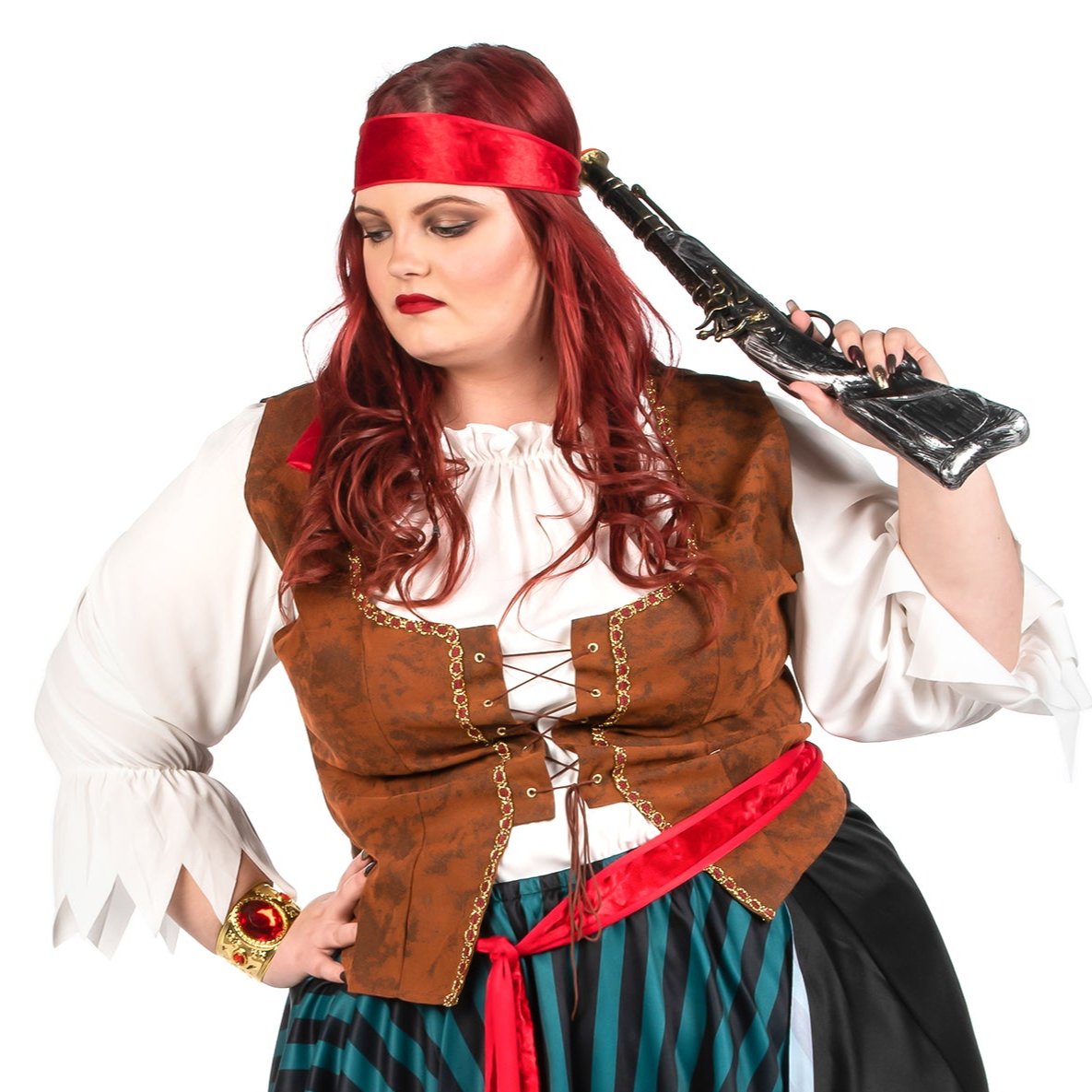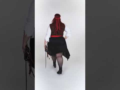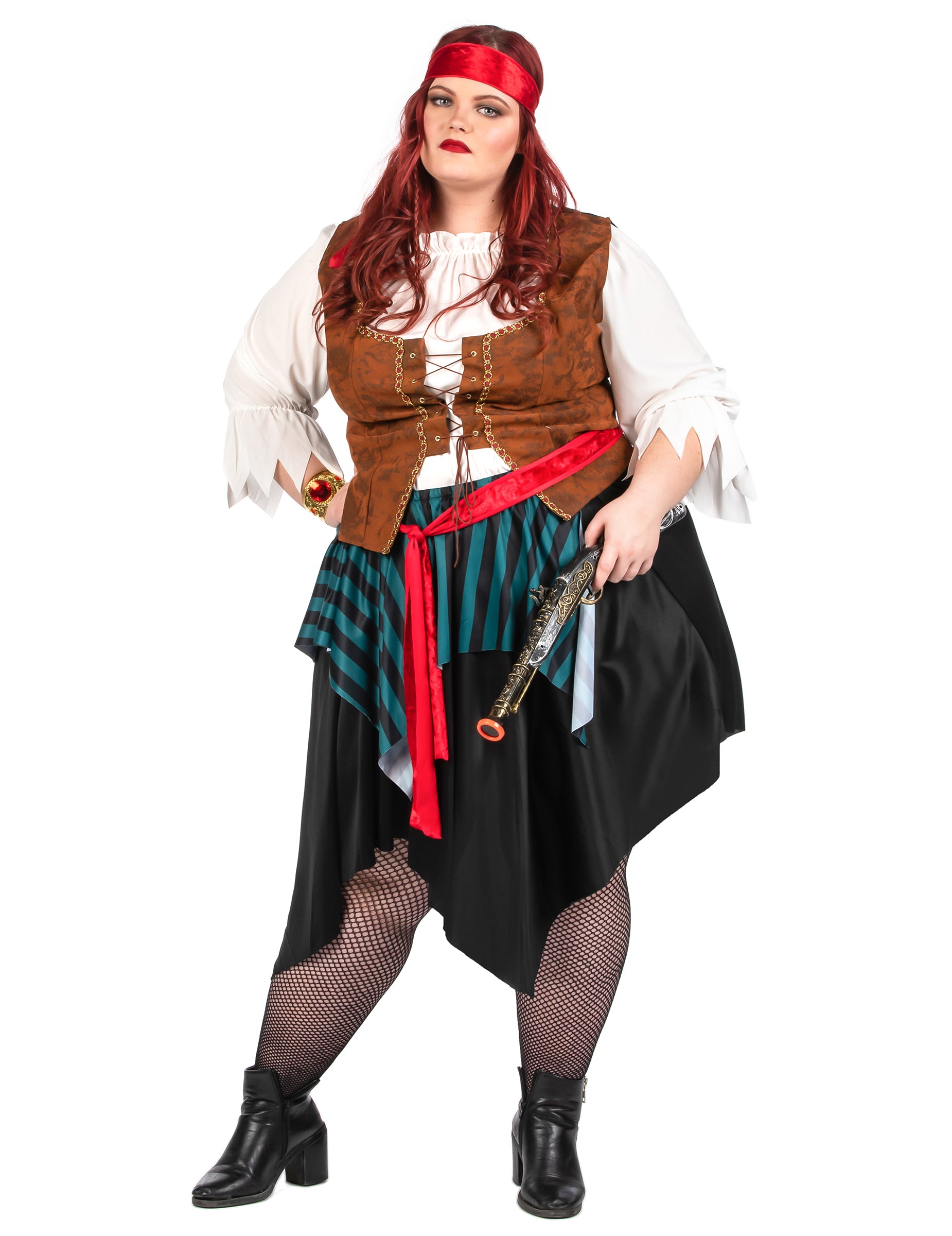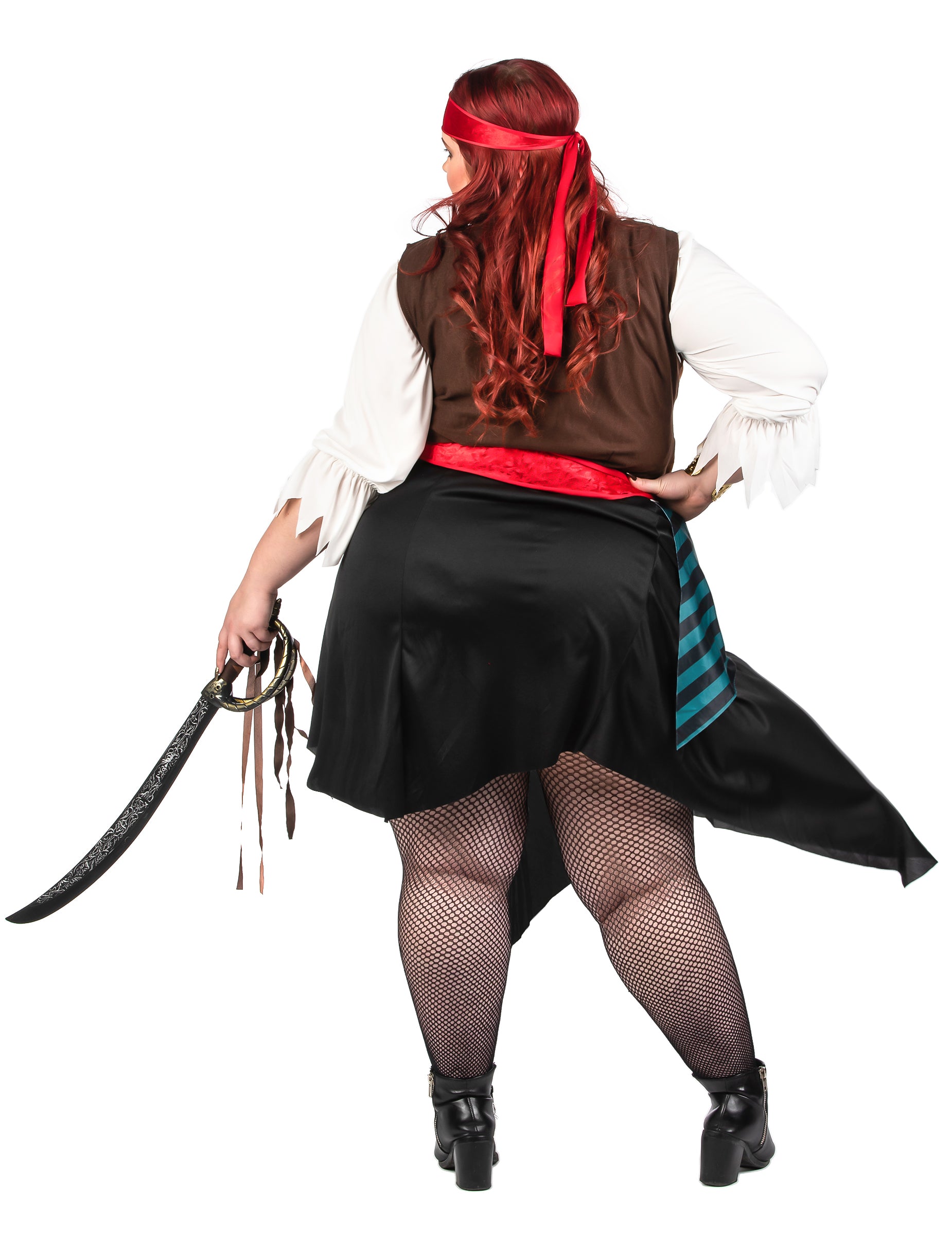 Ovaj veliki gusarski kostim veličine veličine namijenjen je ženama. Uključuje transparent, vrh, prsluk, suknju i pojas (sablja i čizme nisu uključeni). Vrh je potpuno bijeli. Dugi rukavi su široki za još više realizma. Prsluk je u imitaciji smeđe tkanine od antilop. Zlatni šav donosi predmemoriju na ovaj prsluk. Suknja je u crnoj tkanini s crnom i plavom prugastom pločom. na prednjoj strani. Ima asimetrični oblik. Konačno, uključen je satenski crveni pojas koji se veže oko struka. Ovaj gusarski kostim za žene su ideje "al za sve vaše prikrivene večeri.