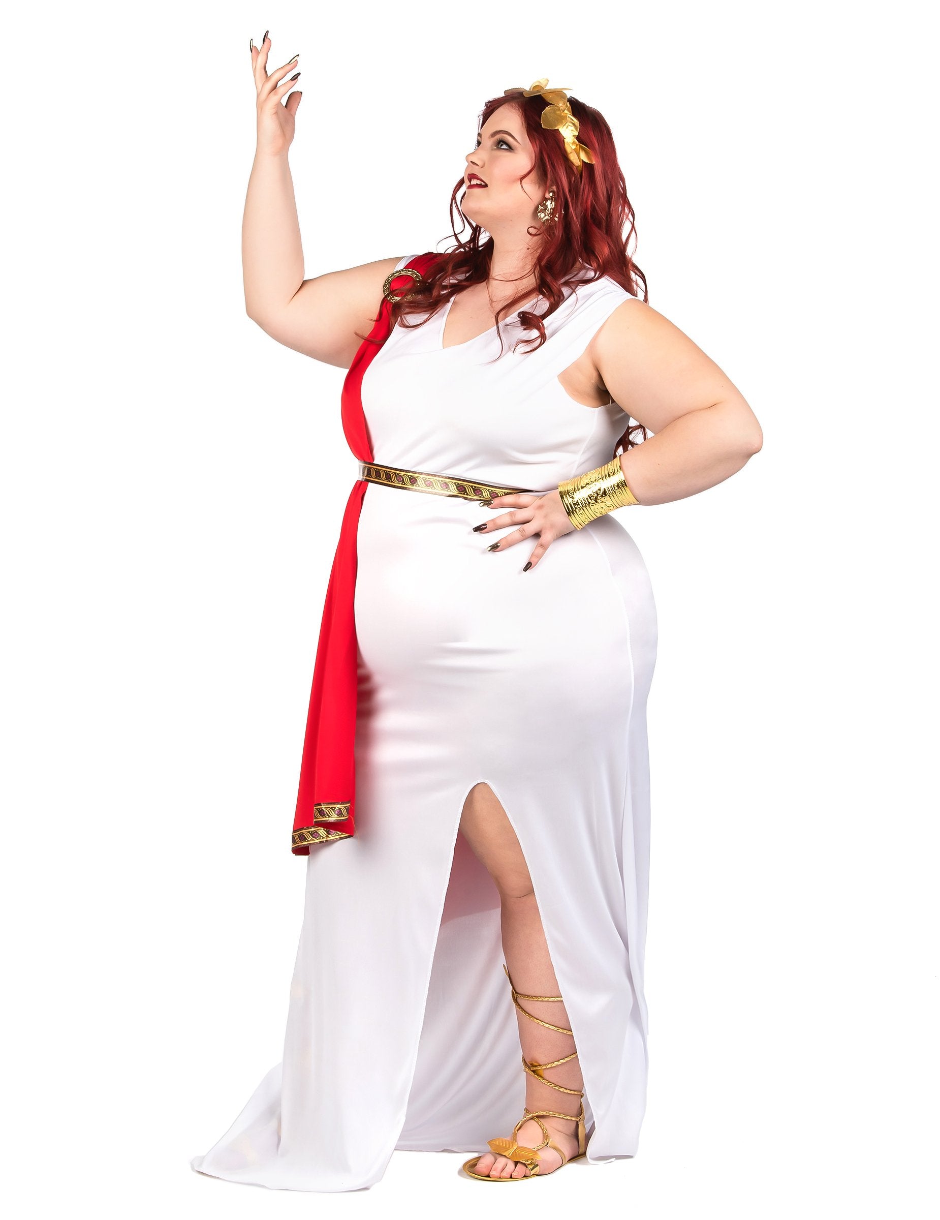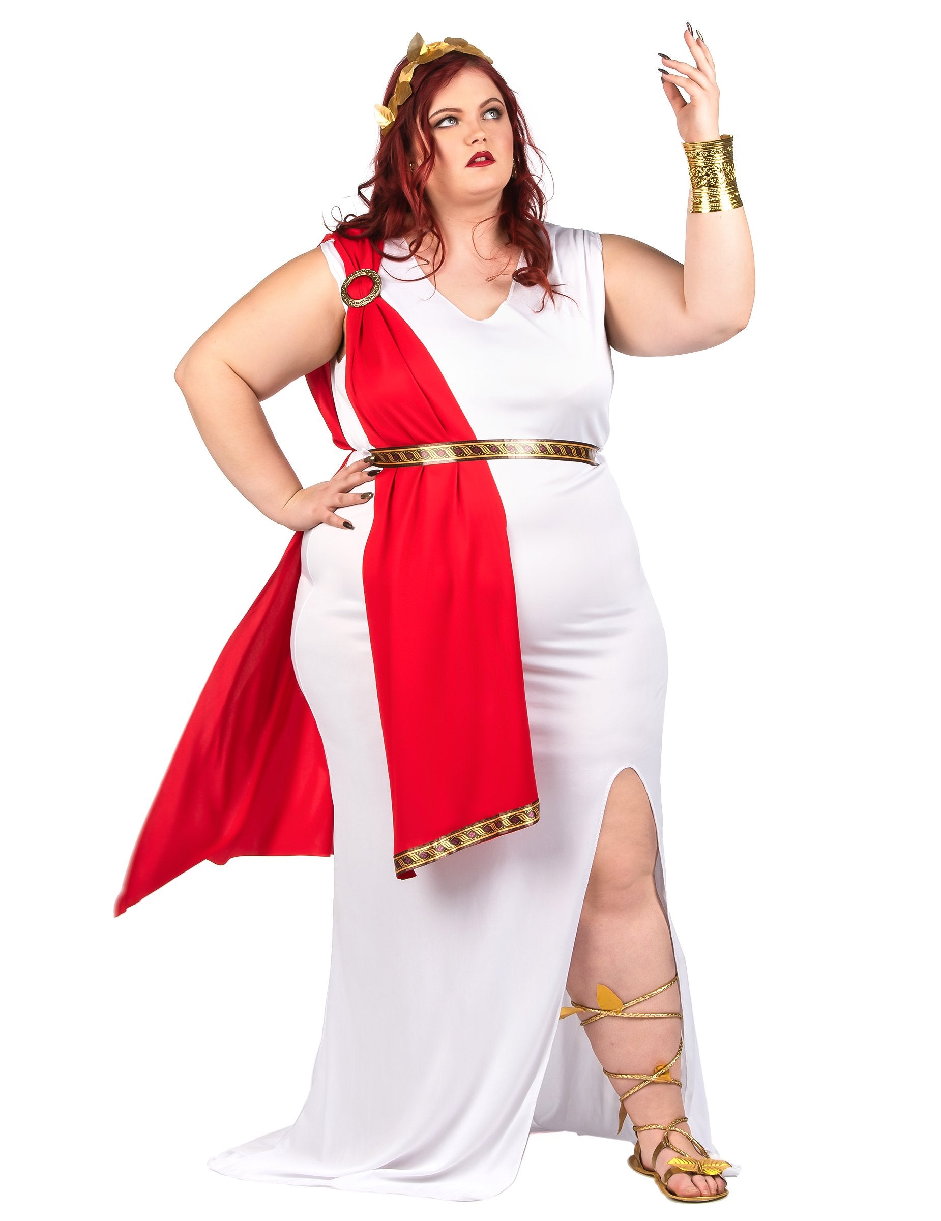 Ovaj veliki, veliki kostim rimske božice za žene ima tuniku i pojas (kruna i cipele nisu uključeni). Haljina je imitacija duge bijele toge podijeljene na bedru. Postrojena je s crvenom ukradenom na ramenom i viseći na haljinu zlatnom okruglom petljom. Na dnu ukradene ukrade prisutna je crna i zlatna granica. Pojas koji odgovara granici prisutnoj na dnu haljine također je uključen za savijanje haljine. S ovim rimskim kostimom odlučuje se za drevni šik navečer nove godine ili za večer na temu antike.