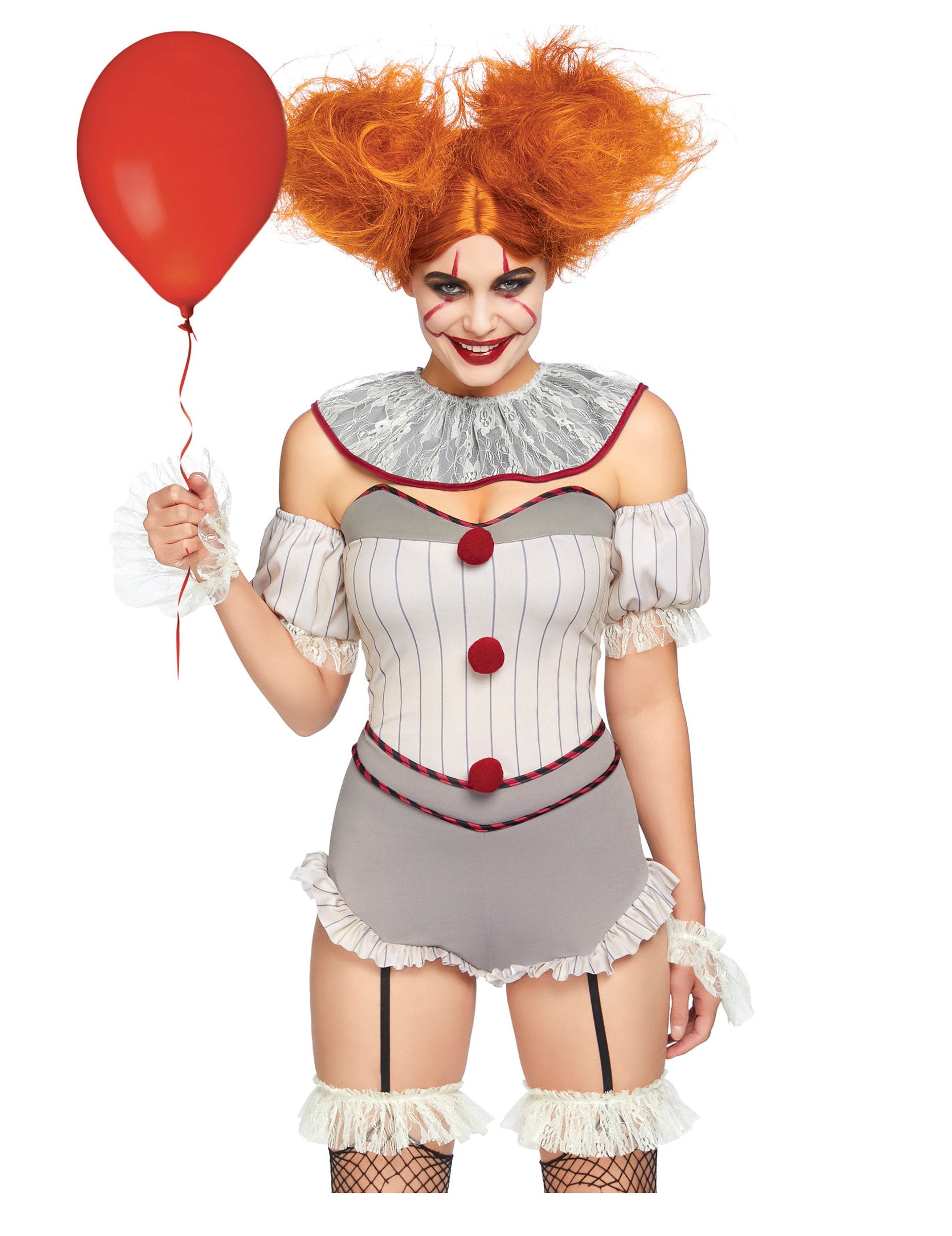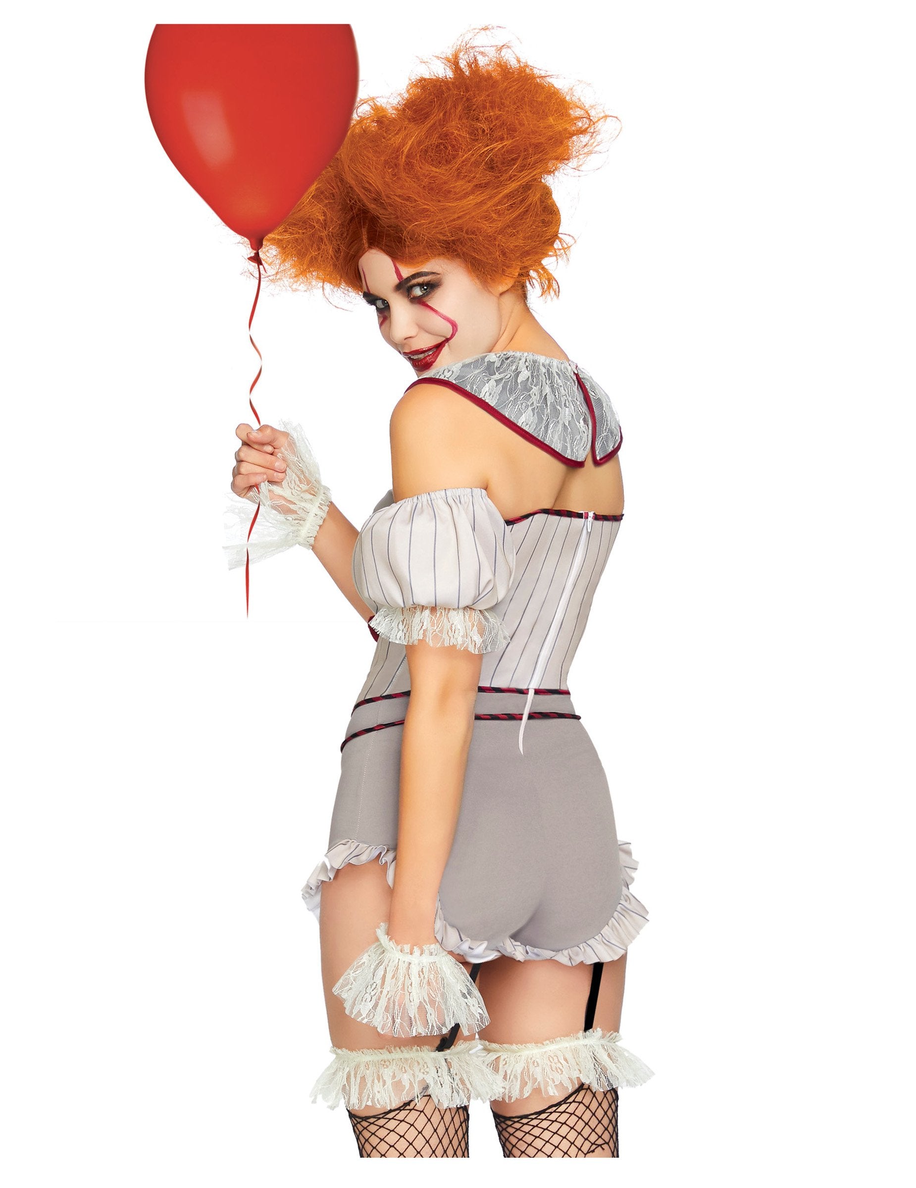 Ovaj seksi luksuzni kostim Killing Clownette namijenjen je ženama. Uključuje slušalicu, 2 trika zapešća, trake za ruke i vrat (kugla, dno i perika nisu uključeni). Donji dio slušalice je siv s lijepim bijelim upravljačem. Bijeli vrh ima tanke svijetlo sive pruge s crvenim pompima na sebi. Dio dekoltea je siv, poput kratkih hlača, s crvenom obrubom s crnim linijama. Taj isti obrazac nalazimo na dvije granice koje su na razini veličine. Prozirne kaiševe ušivene su u slušalici. Manžete su bijele u imitacijskoj tkanini od čipke. Trake za ruke odgovaraju gornjem dijelu slušalice, s lažnom bijelom čipkom na rubovima. Vrat je izrađen od imitacijske tkanine bijele čipke s obrubom crvene koja prolazi crvenom bojom. Budite zastrašujući dok ste seksi u ovom luksuznom kostimu klawnette seksi seksi ideal za Noć vještica.