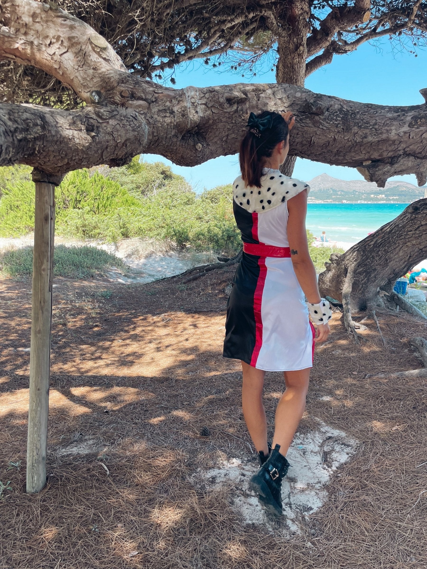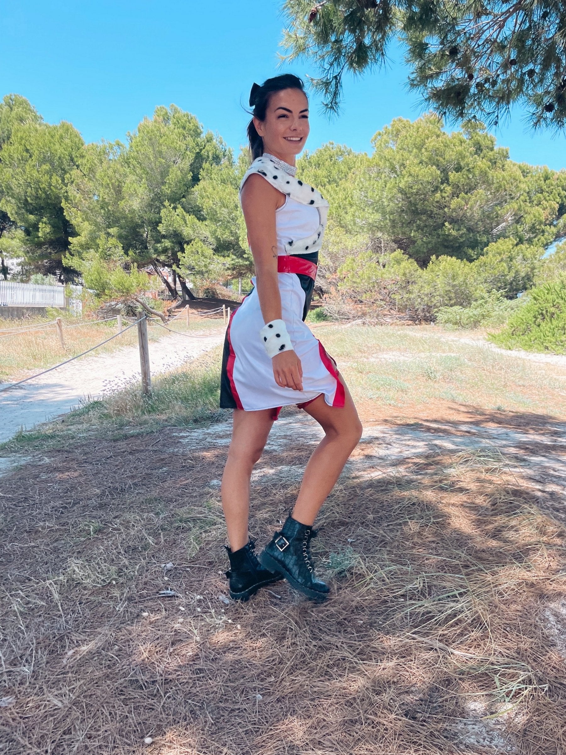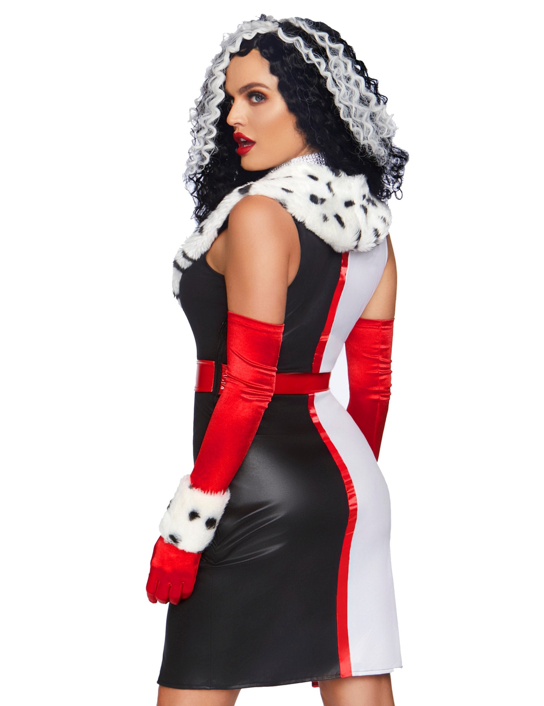 Ova luksuzna diva seksi pakla za žene sastoji se od haljine, pojasa, podvezice, vrata i manžeta. Haljina je u imitacijskoj koži s dalmatinskim krznim granicama na naličju. Ova odjeća ima potučeni dekolte u V. Ima prorez sa strane koji ide do sredine bedara. Crvena granica crta ovaj prorez. Crveni pojas s bijelom petljom savršeno će prilagoditi vašu veličinu. Podvezica je crvena da bi se složila s dovragom ove prerušavanje. Vrat je bijeli s rhinestones koji se pojavljuju kao diva izgled odjeće. Manžete su crvene s krznim reverima koji se uklapaju u haljinu. Ova prerušavanje bit će idealna za postajanje seksi paklenim diva tijekom prerušene večeri.