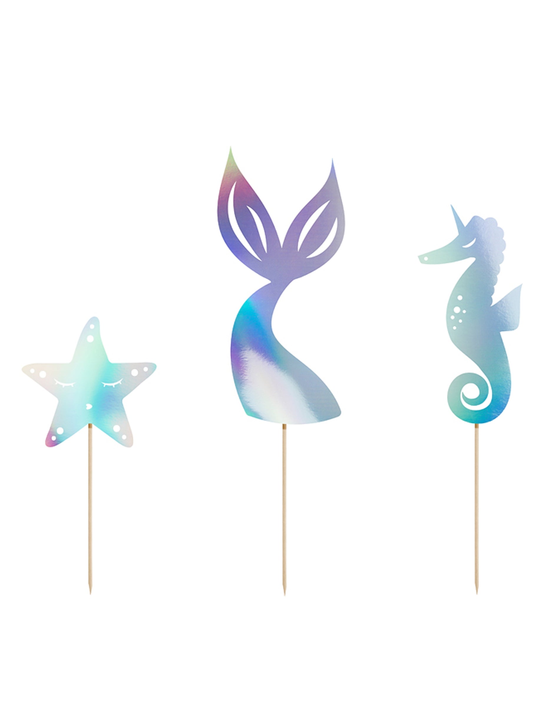Ova lota ima 3 torta Topper Holografska sirena. Svaka od njih mjeri približno 24,5 cm duljine. Svaki topar za tortu je iridescentni u tonovima plave i ljubičaste boje. Jedan predstavlja rep sirene, drugi hipokampus i posljednja zvijezda.