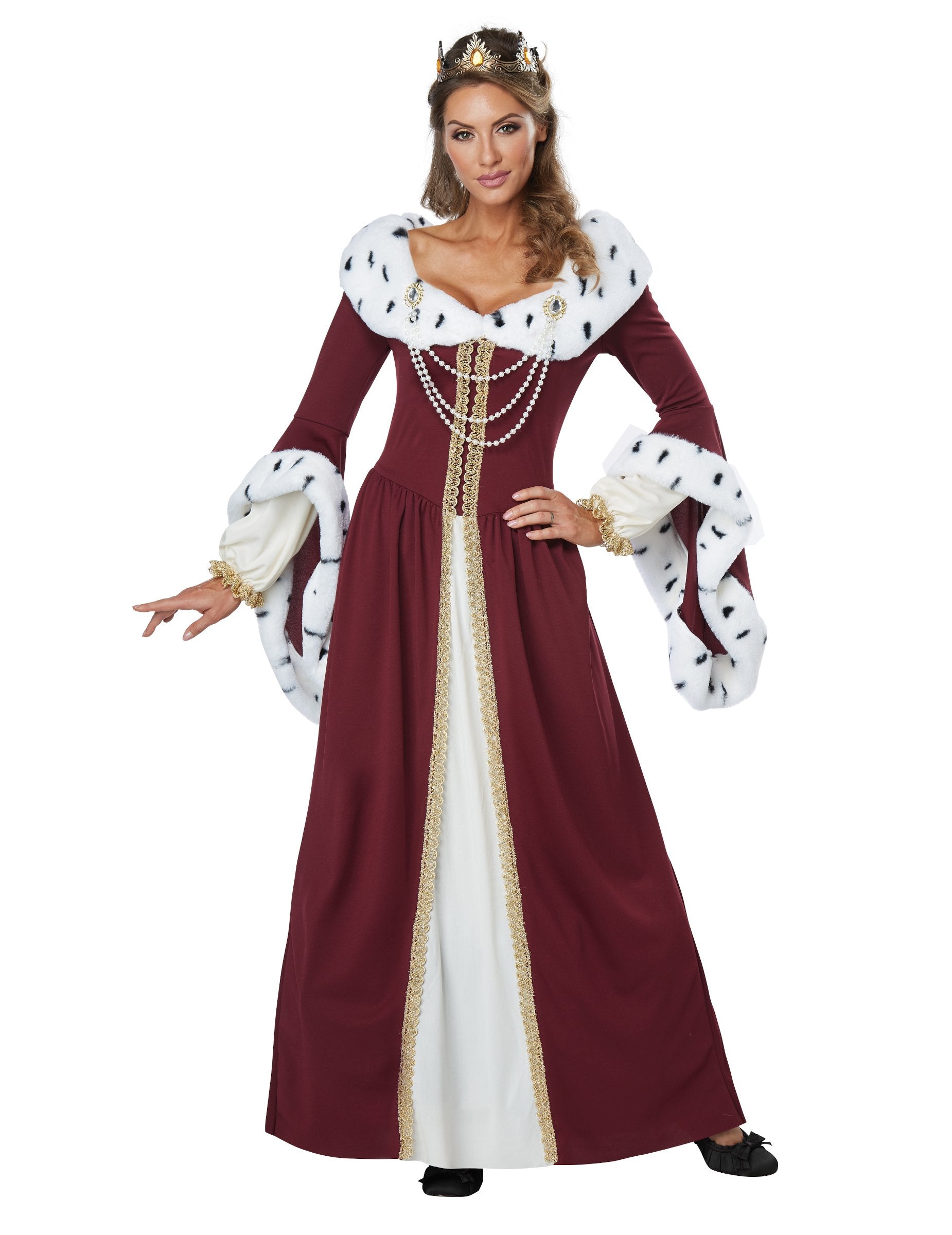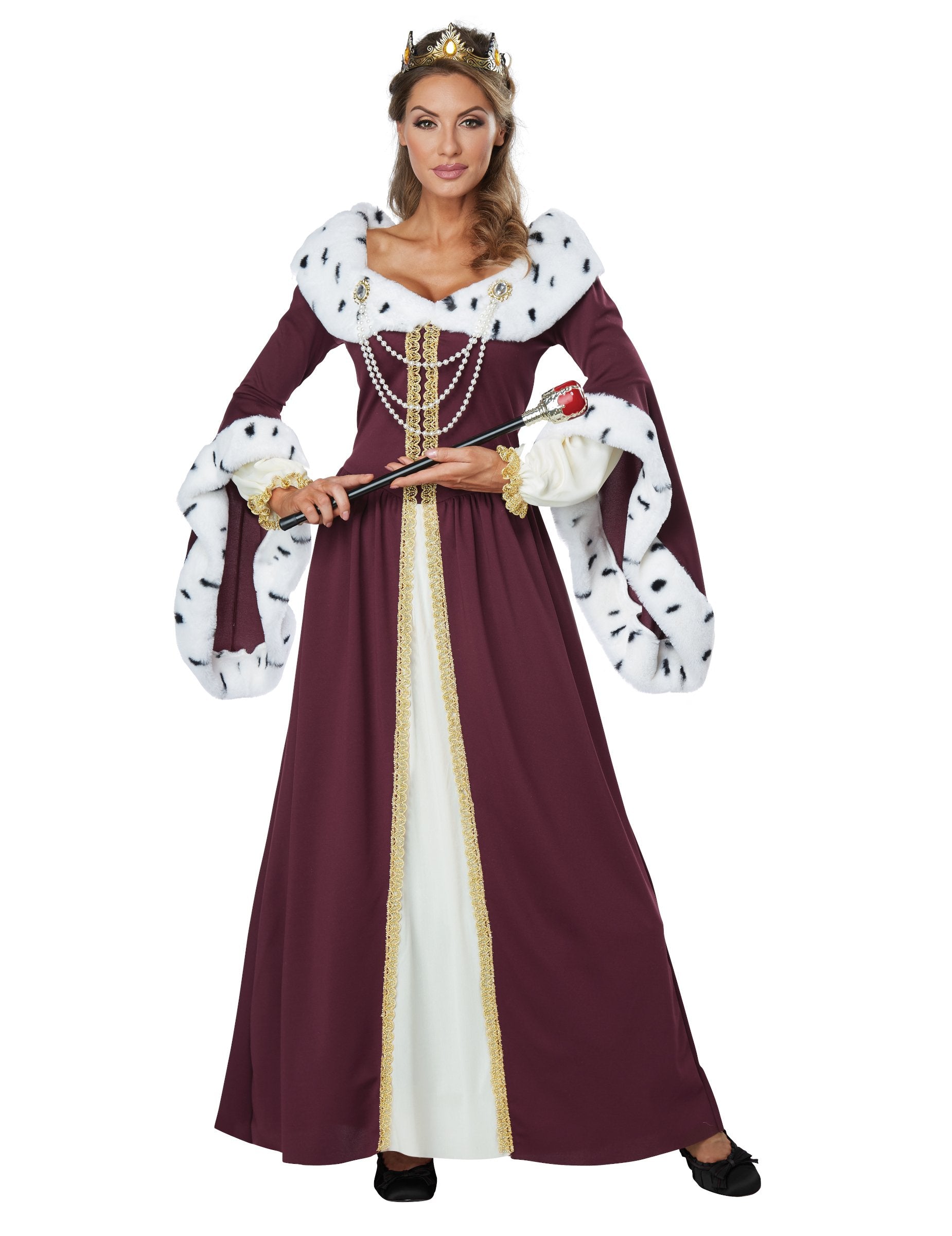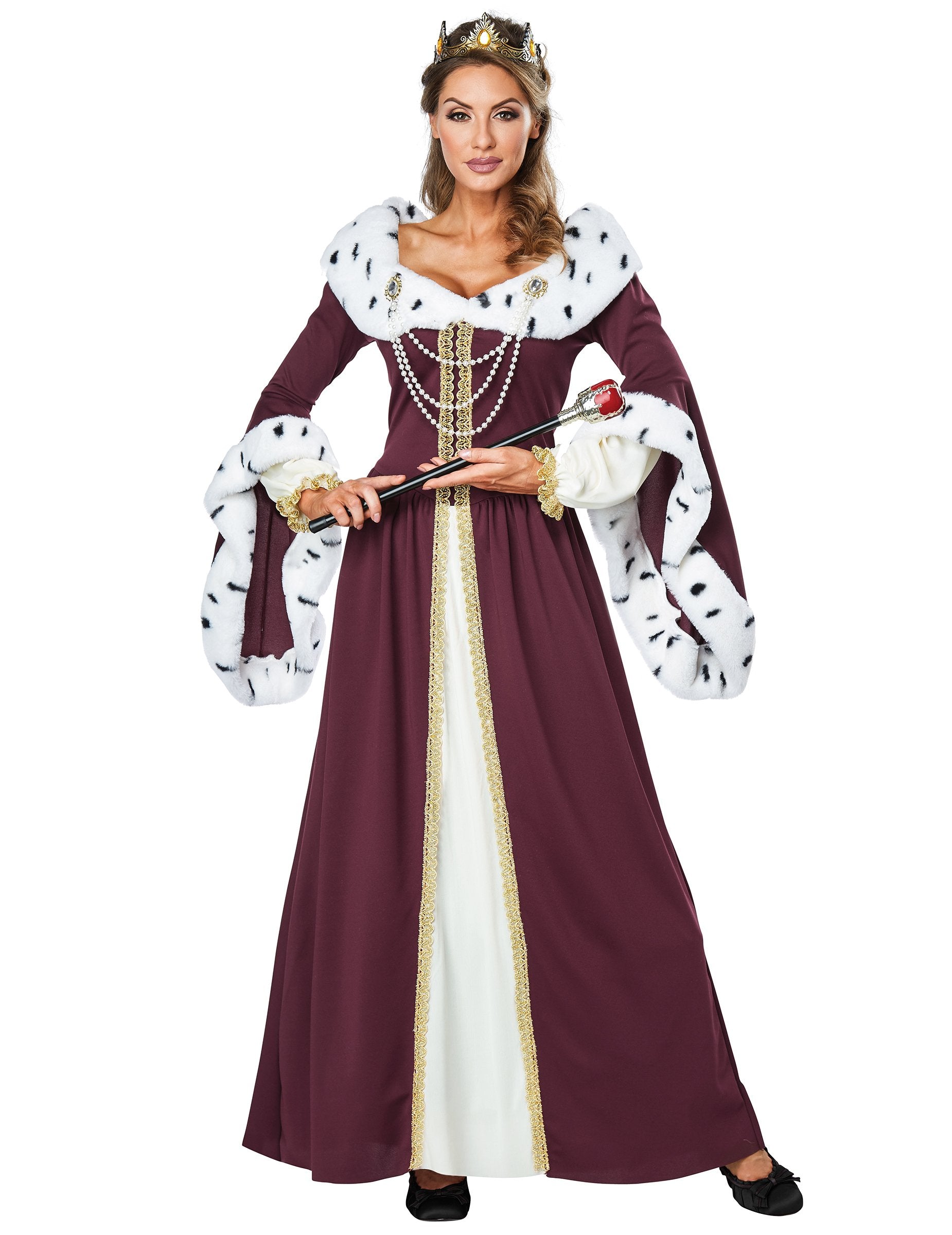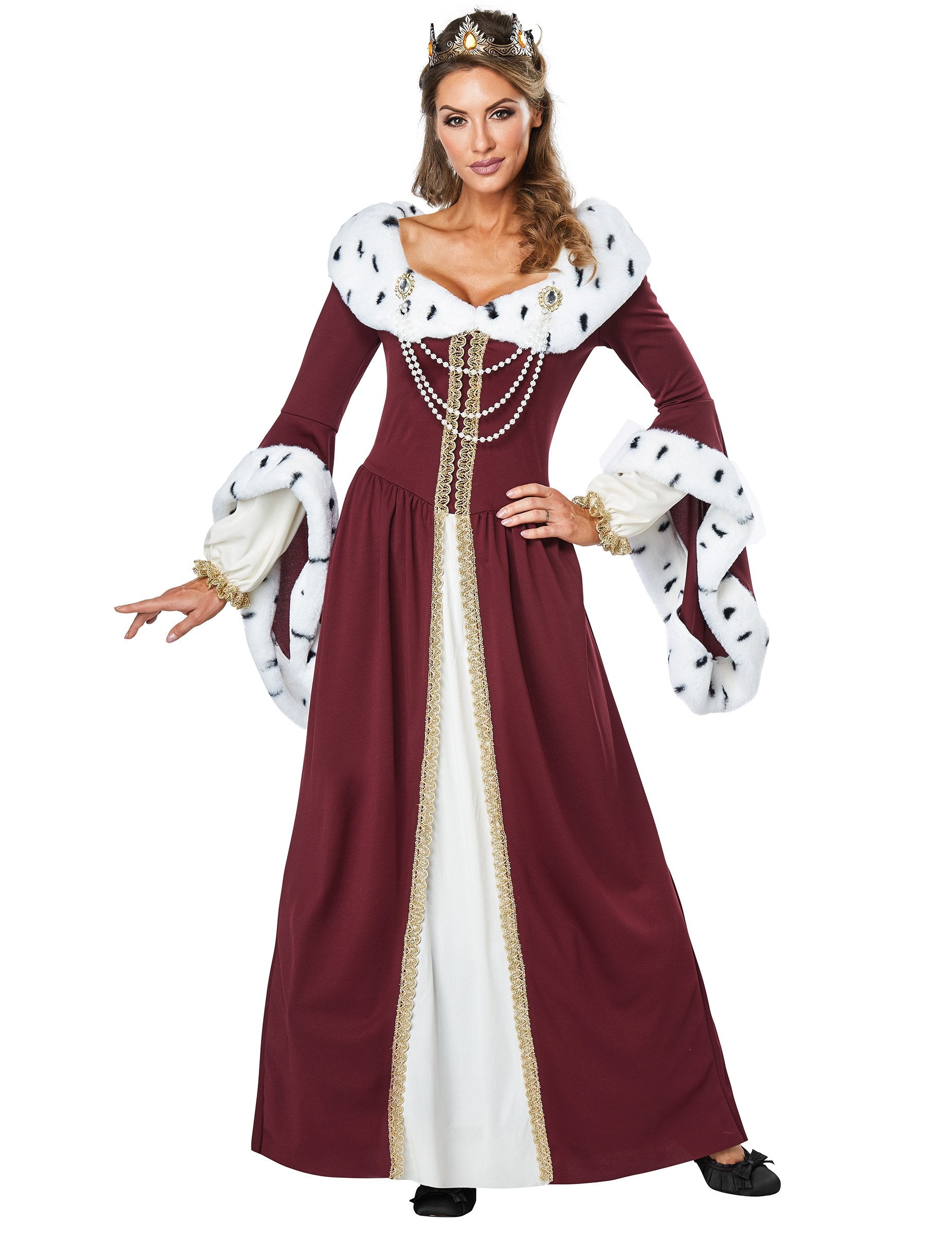 Ovo prerušavanje u bajkovitu kraljicu za žene ima haljinu i krunu (Scêptre nije uključena). Krona kraljica je zlatna u boji s lijepim rhinestonesima koje imaju jantarni boju. Haljina je duga. Burgund je u boji. Zlatni rubovi kao i lažni biseri ukrašavaju poprsje ovom lijepom haljinom. A za još više šarma na prsima je prisutno bijelo umjetno krzno s crnom i obrnuto od dugih pagodnih rukava. Ovaj srednjovjekovni kostim kraljice bit će savršen za srednjovjekovnu tematsku večer.