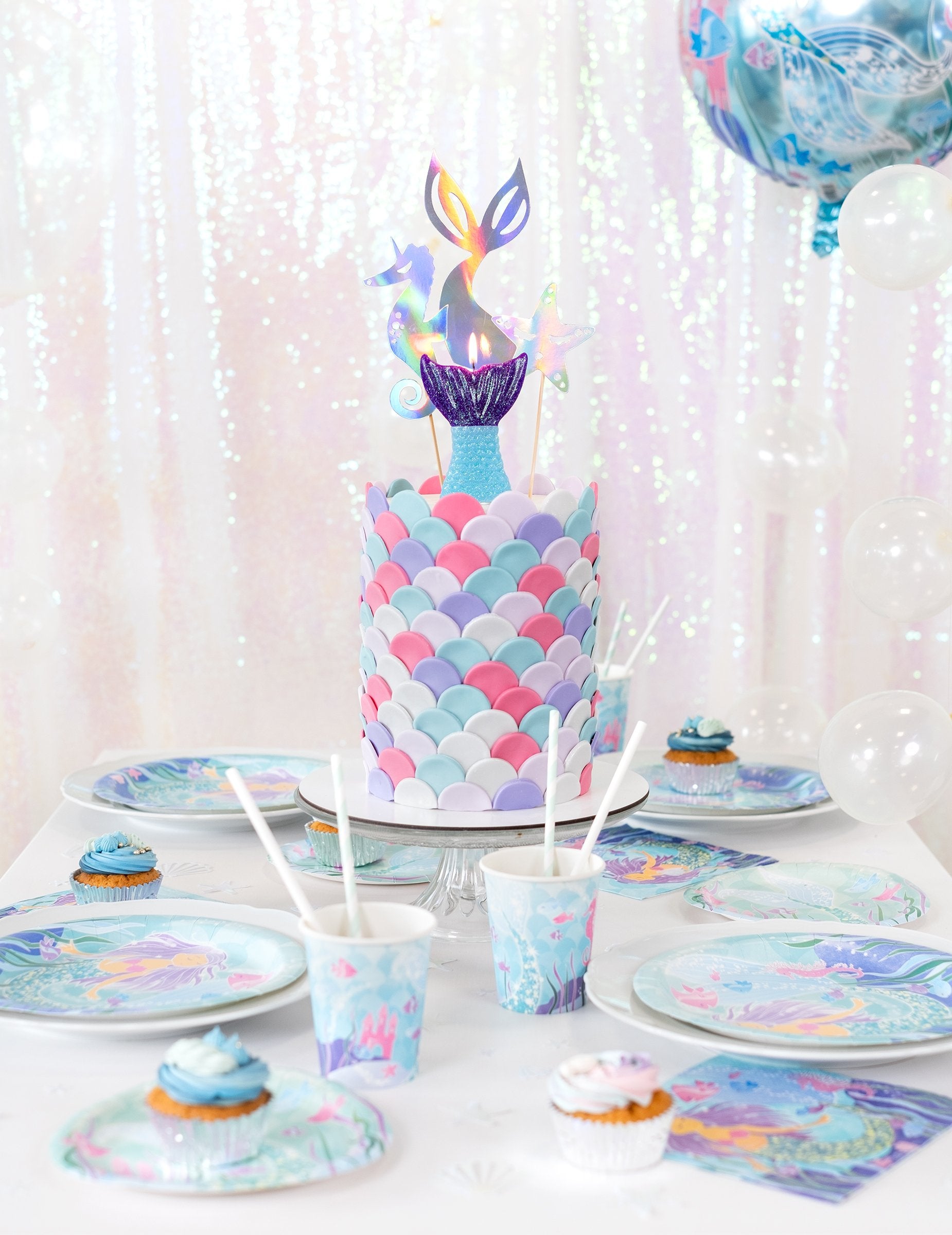 Sublimez votre dessert avec cette bougie de 13 cm de haut conçue en cire de qualité. En forme de queue de sirène, elle présente des écailles dans les tons bleus et des nageoires violettes recouvertes de paillettes. Elle est parfaite pour décorer le gâteau d'anniversaire de votre petite fille passionnée par le thème sirène.