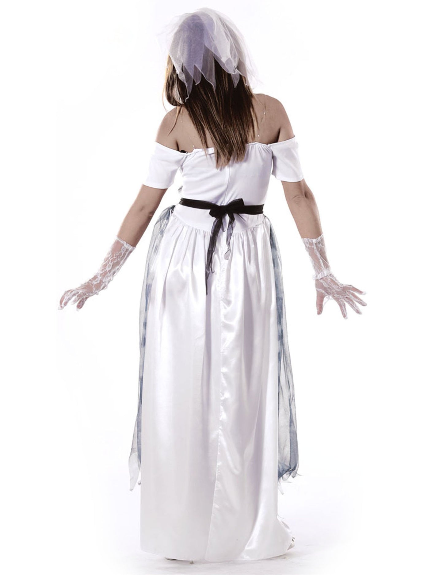 Ovaj ženski vjenčani kostim sastoji se od haljine i vela. Haljina je budier s dugom suknjom. Bijela je i crna. Okružen je crnom vrpcom, ukrašenom bijelim i crnim ružama. Bustier je bijeli u sredini, a crni vezan bijelim uzorcima na stranama. Ovu haljinu dovršava bijelim velom. Ovaj kostim za mladenke duha bit će savršen za slavlje Noći vještica!