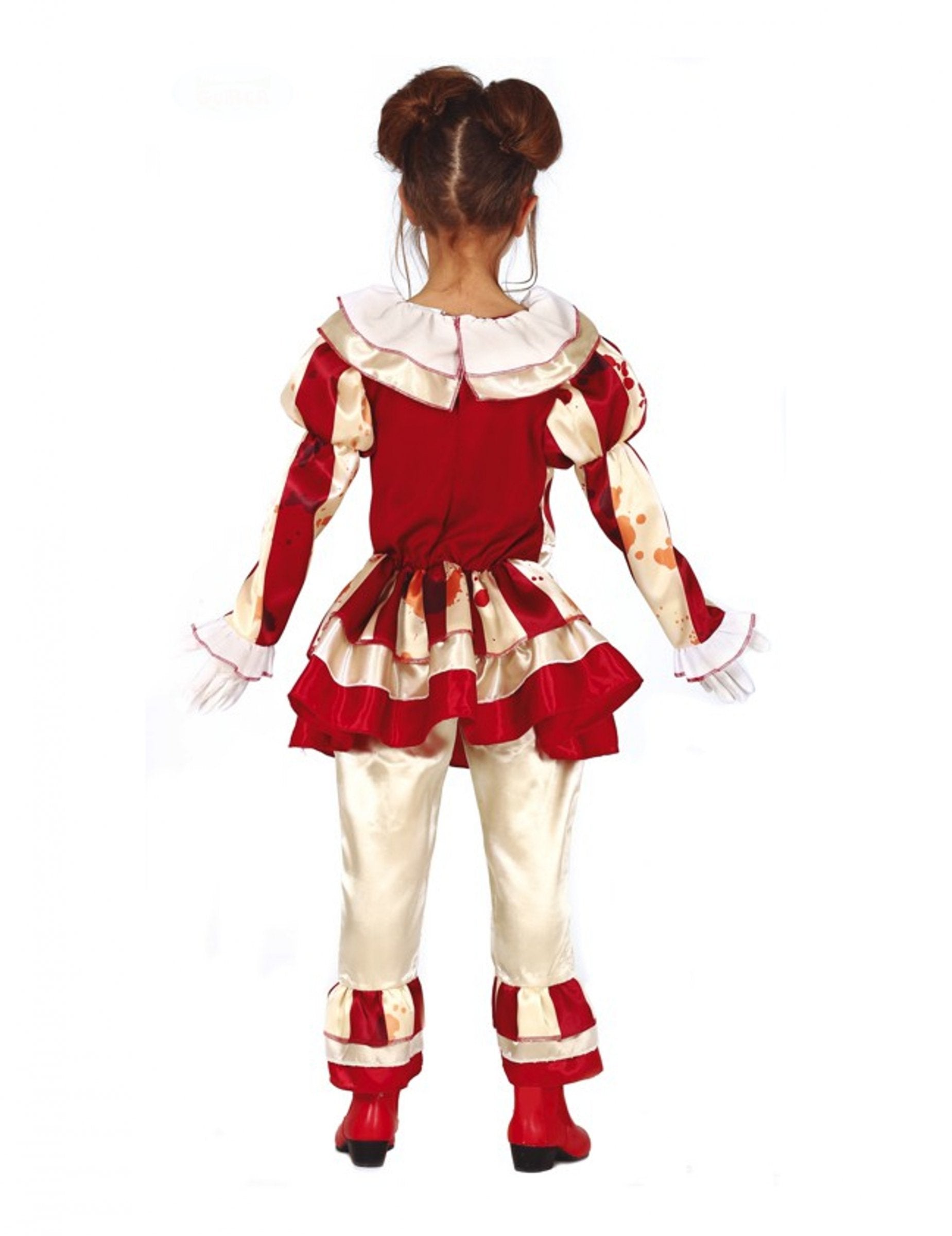Ovaj zastrašujući kostim crvenog i slomljenog bijelog klauna ima haljinu s lažnim ovratnikom i pantacourtom. Kratka haljina ima tipičan oblik odjeće klauna. Blizu je korpusa do struka s natečenim ramenima i integriranim lažnim ovratnikom. Dno je plamteno i ima 3 zamašnjaka. Potpuno je izrađen od satenske tkanine i prugasti je velikim crveno -bijelim slomljenim okomitim prugama. Cijela je razmazana krvnim mrljama. Dno je satenski slomljeni bijeli pantacourt koji se na dnu plasira i zauzima pruge haljine. Ovaj kompletni kostim klauna za djevojku bit će savršen za utjelovljenje najstrašnijeg horor filma klaun za Noć vještica.
