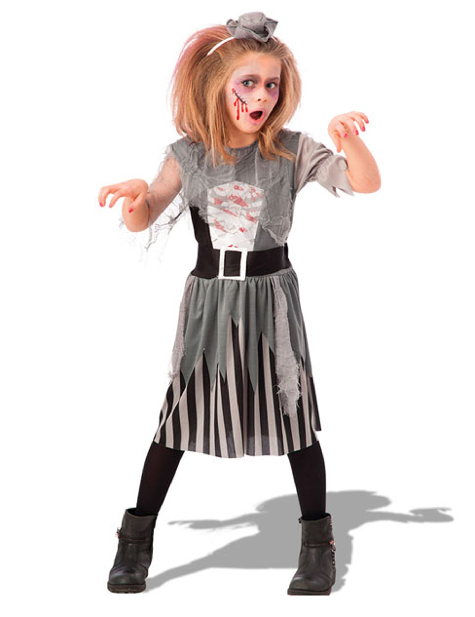 Ovaj gusarski zombi kostim namijenjen je djevojci, sastoji se od haljine i trake za glavu (tajice nisu uključene). Donji dio haljine je s bijelim i crnim prugama. Gornji dio uključuje tkaninu izrezanu na sive vrhove koji pada na donji dio. Elastika se nalazi na veličini. Prolaz je također obložen sivim velom. Zadaci krvi ispisani su na torzu, na bijeloj pozadini, za još više realizma. Traka za glavu je bijela s mini sivim šeširom fiksiranim na vrhu. Ovaj zombi kostim bit će savršen za vašu kćer na večeri Noći vještica.
