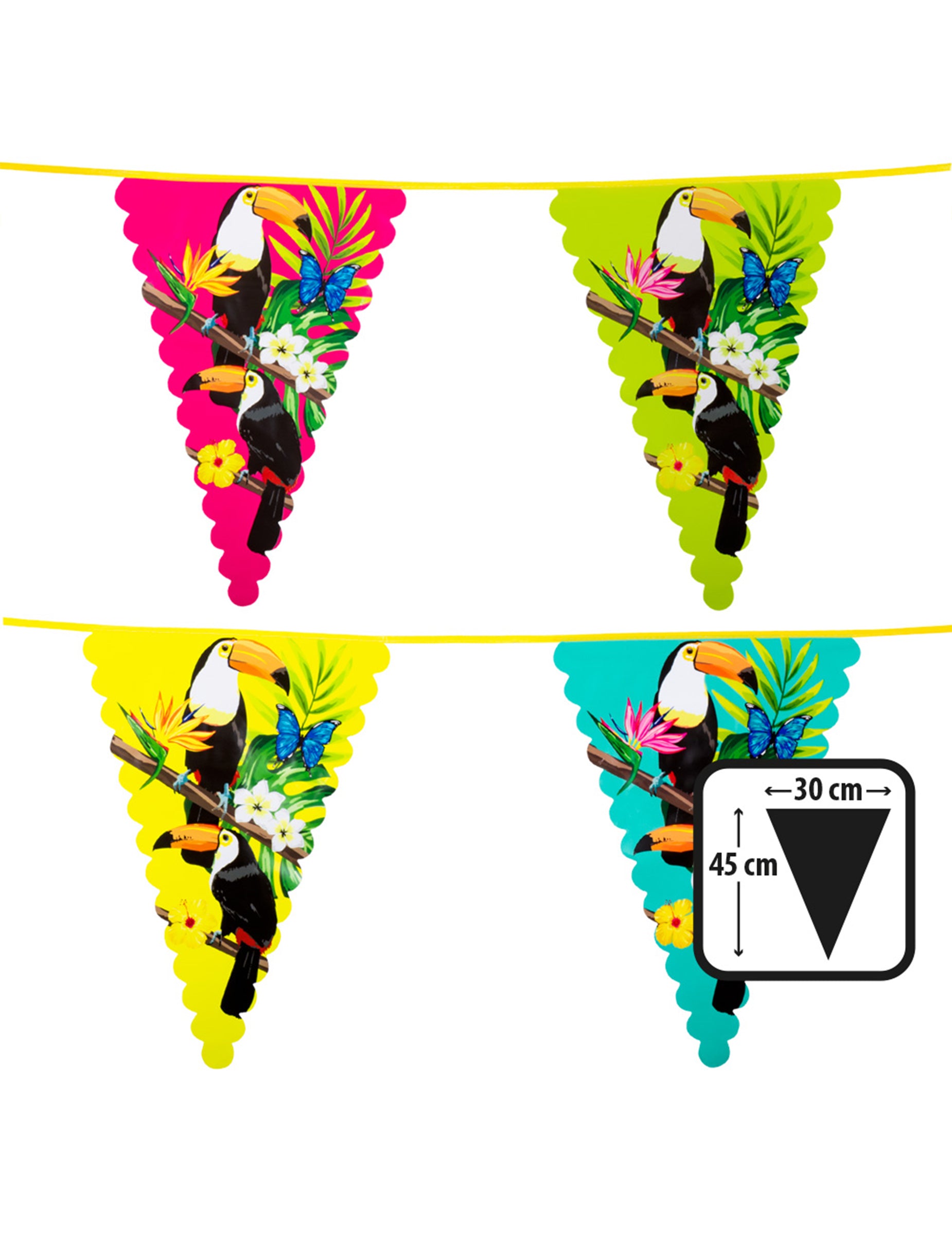 Ovaj je vijenac plastičan. Mjeri dugačku oko 6 m i ima zastave od oko 45 x 30 cm. Pennants predstavljaju tokane i tropske lišće i cvjetove na žutoj, ružičastoj, zelenoj i tirkiznoj pozadini. Ovaj tropski vijenac bit će idealan za šareni ukras tijekom havajske zabave!