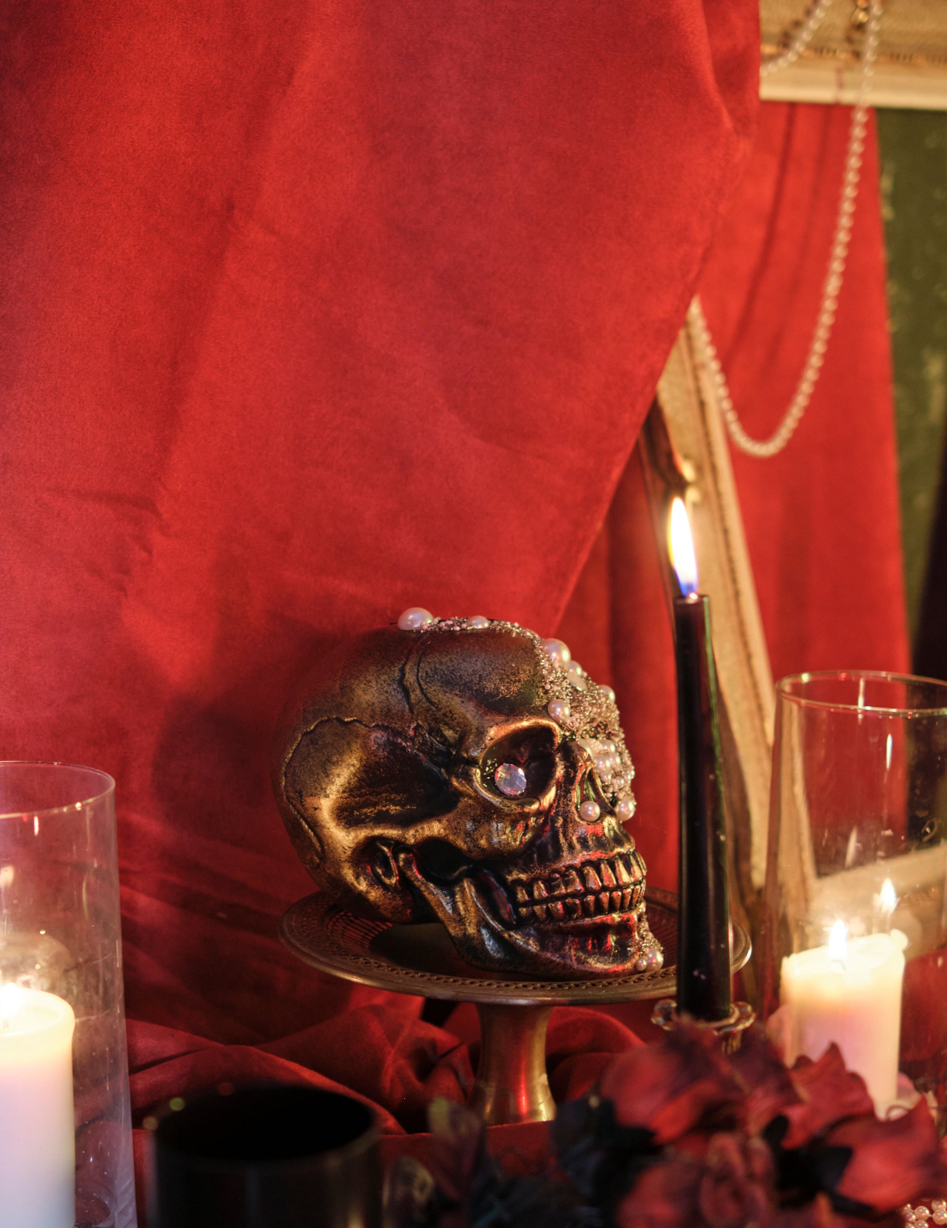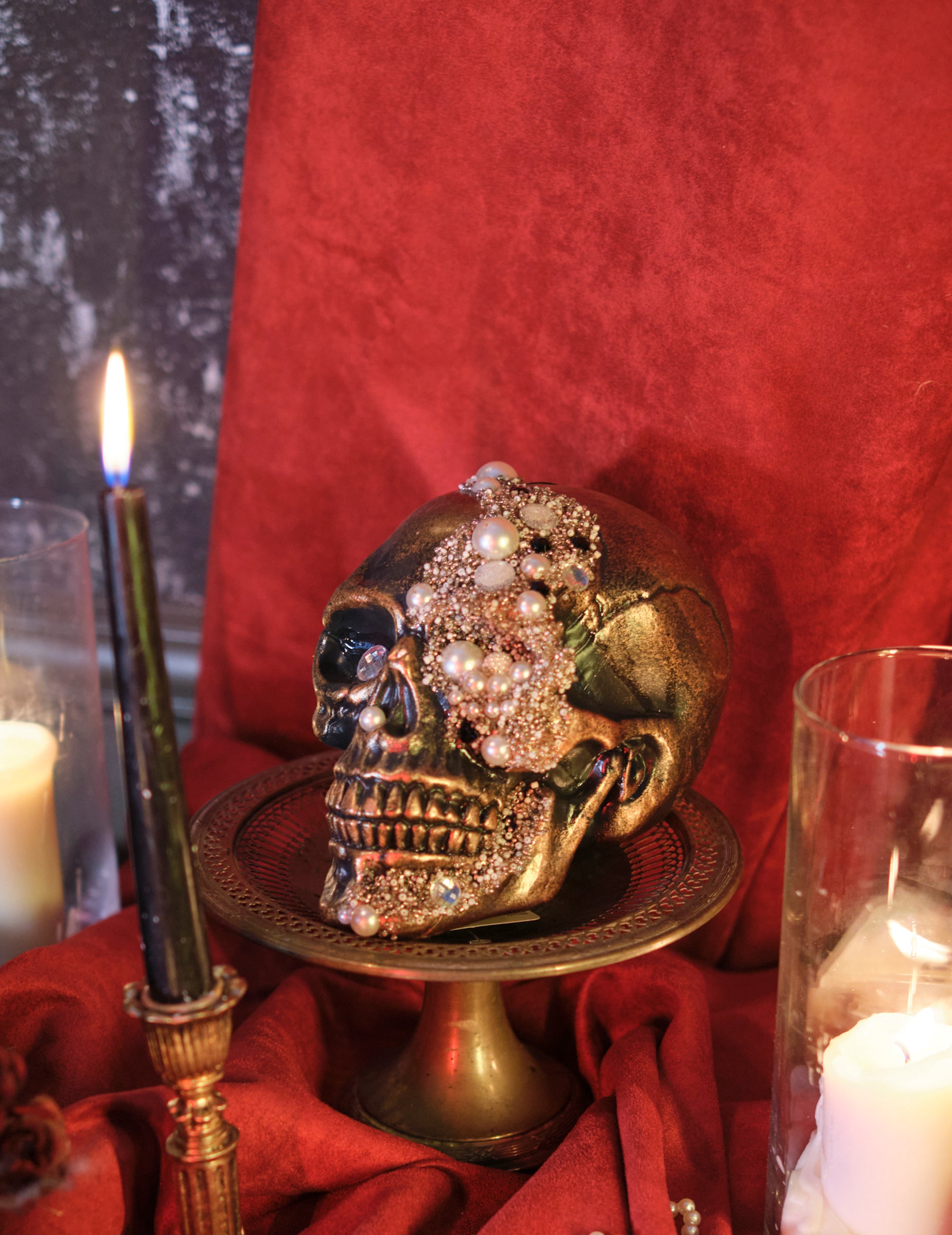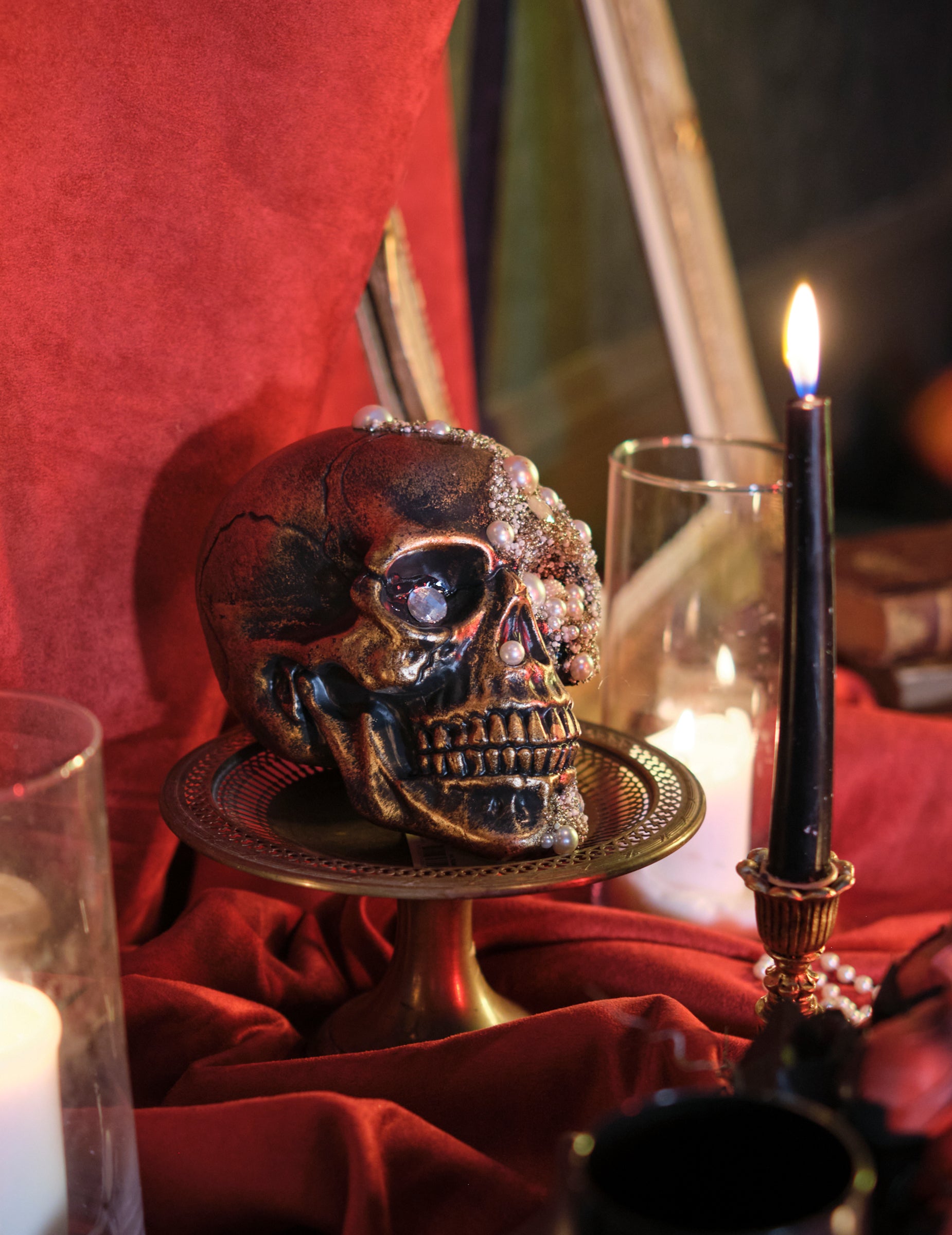 Ovaj ukras predstavlja bakrenu lubanju. Ova lubanja kostura mjeri otprilike 16 x 15 x 21 cm. Ukrašen je lažnim dijamantima s jedne strane lica. Ovaj dekoracija tenilena kao šik i zastrašujuća bit će savršena za dovršavanje ukrašavanja vašeg stola za Noć vještica!
