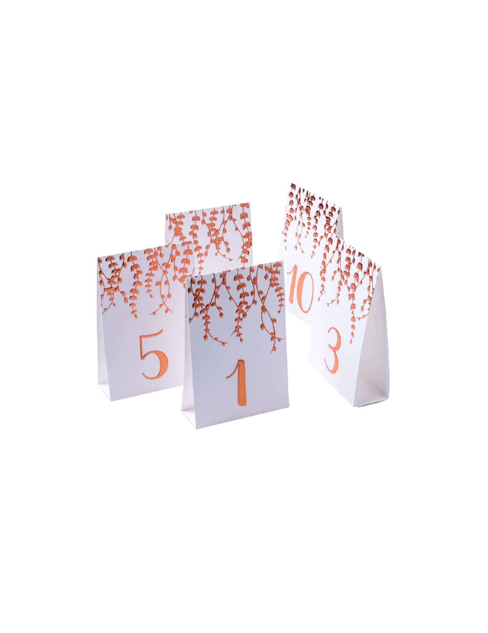 Ova serija sadrži 10 oznake za stol kartonske kutije dimenzija 15 x 10 cm. Svaka kartica prikazuje broj od 1 do 10, elegantno ukrašen uzorcima lišća boje ružičastog zlata. brojevi stolova savršeni su za organizaciju vašeg plana sjedenja brak s daškom sjaja.