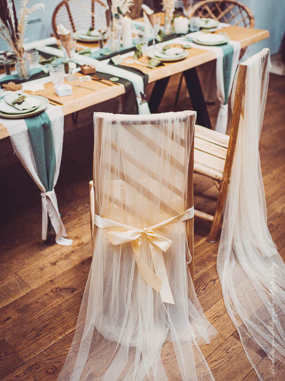 Ovaj set se sastoji od 2 velika jedra za stolice lepršave tkanine i usklađene satenske vrpce.