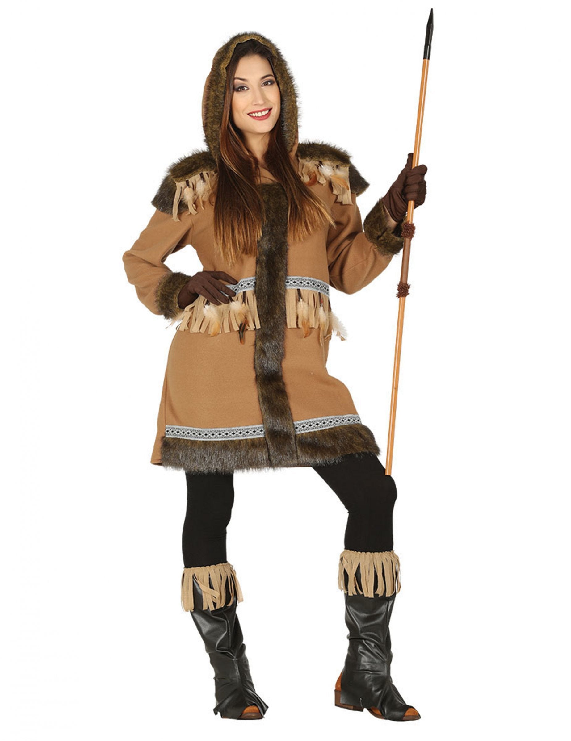 Ovaj kostim Inuita namijenjen je ženama. Sastoji se od jakne i na čizmama. Ova jakna u smeđim tonovima je dugačka. Ramena, krajevi rukava i kapuljača, dno i prednji dio jakne ukrašeni su tamno smeđim lažnim. Frange su prisutne na veličini i ramenu. Na kapuljača je izravno ušivena jaknom koja će se lako zatvoriti na prednjoj razini. ON čizme su također opremljene rubovima na vrhu i savršeno će nadopuniti ovu inuitsku odjeću. Odlučite se za ovu kostim Inuita za žene povodom karnevala. Sigurno ćete biti jednoglasni sa svima!