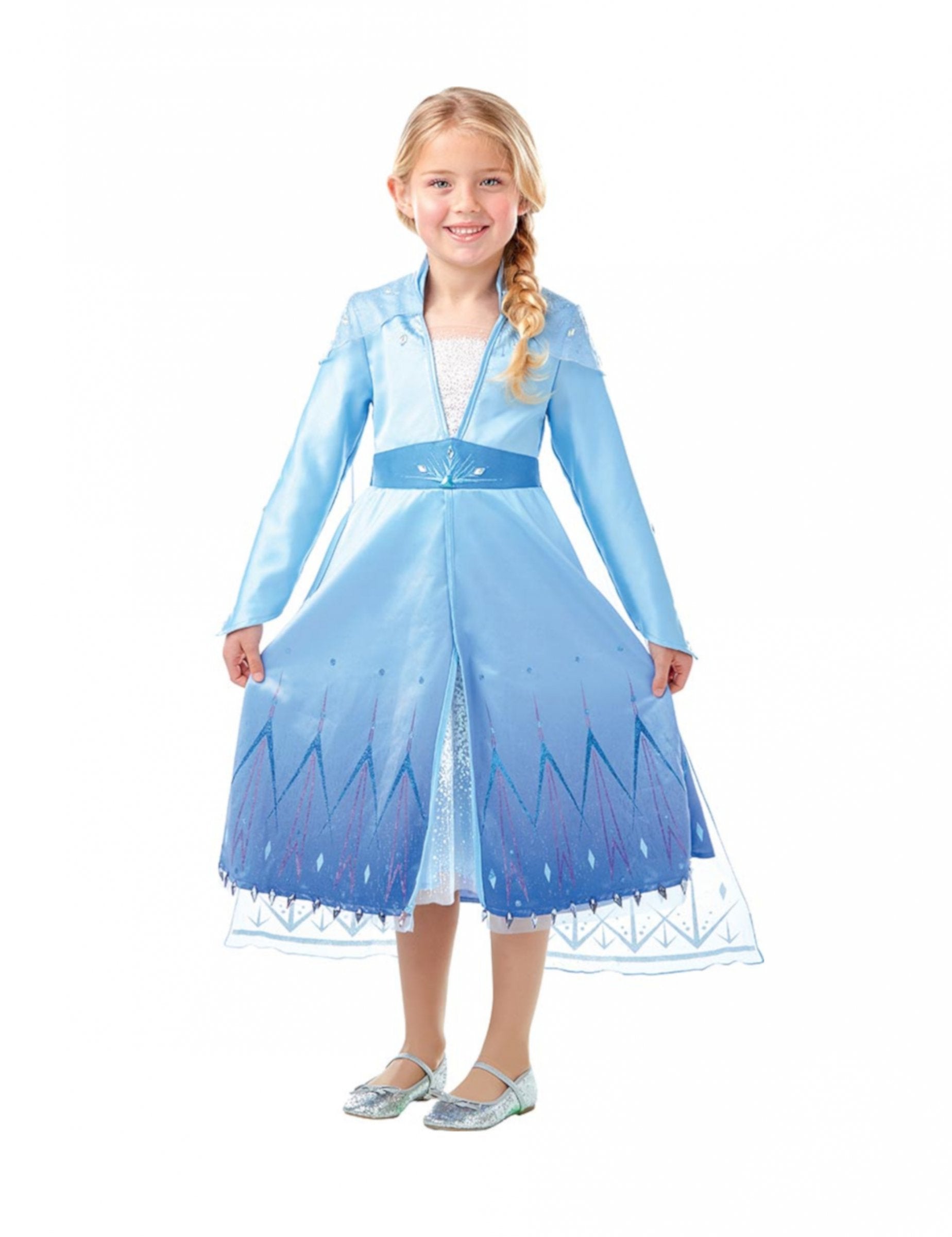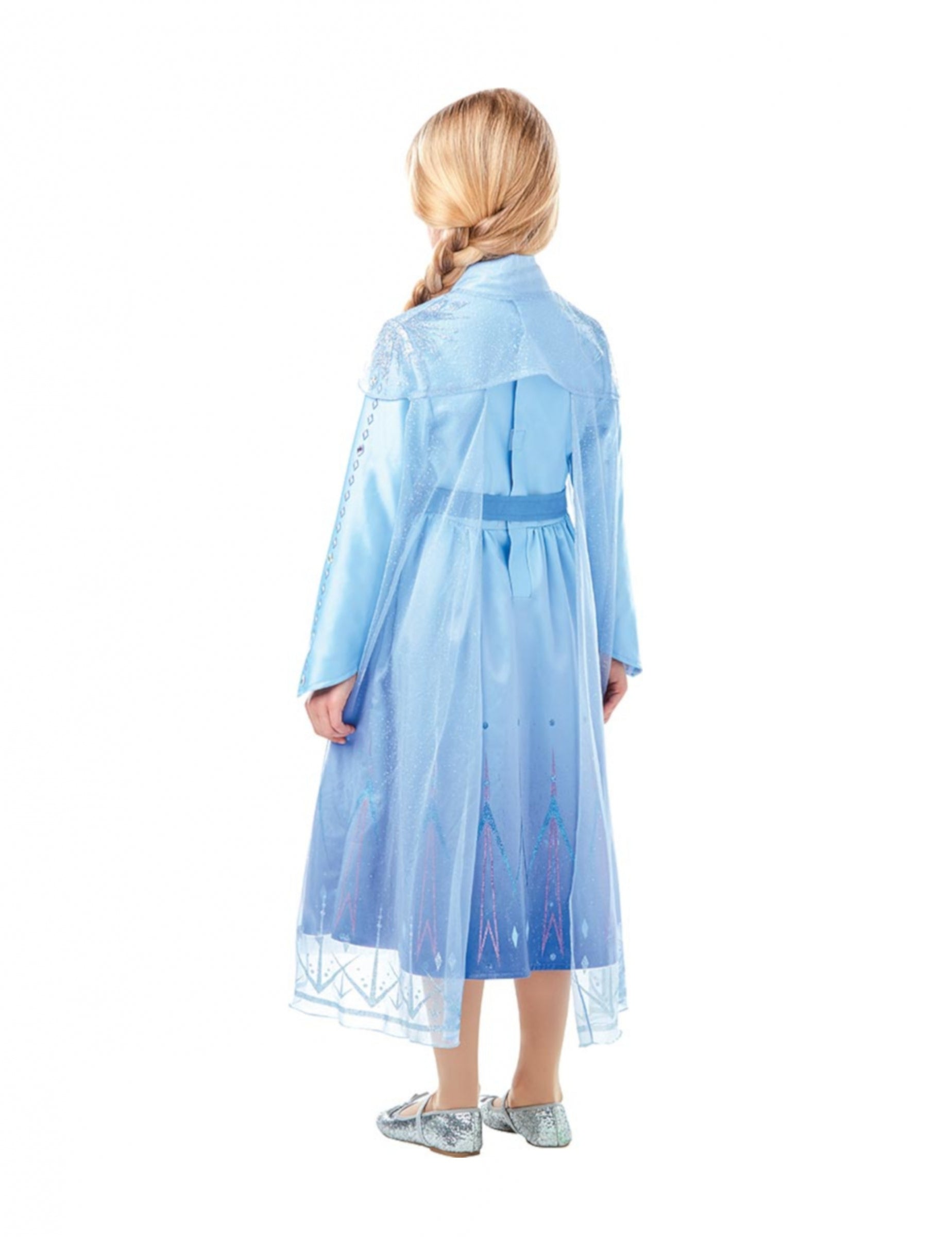 Ova vrhunska elsa prerušena pod službenim zakonitim kraljica sastoji se od haljine s pojasom i rt. Vrh haljine je plavi satenski bodi nadređeni sa svjetlucavim uzorcima. Integrirani bijeli dres ukrašen finim sjajem za snježni efekt krasi vrh ove haljine. U pogledu veličine i dekoltea prisutni su srebrni umetnuti dragulji. Plava/mauve super suknja u superiornom satenu sa svjetlucavim uzorcima na prednjoj strani i na stražnjoj strani, kao i friz srebrnih dragulja, prisutan je na dnu haljine. Prisutan je i integrirani baršunasti efekt sa sustavom pričvršćivanja Velcro na stražnjoj strani. Konačno, u ovu je prerušavanje uključen ogrtač s velom sa sjajnim uzorcima i 2 umetnuta srebrna dragulja. Opremljen je s 2 čičak pričvršćivača u ramenima kako bi ga održali na mjestu. S tim prerušavanjem vaša kćer može sanjati kao kraljicu kraljevstva Arendelle za karneval ili tematski rođendan kraljicu snijega.