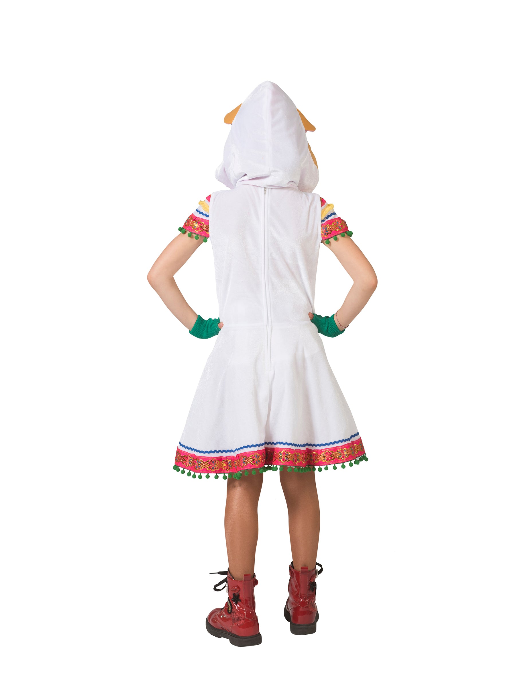 Ova peruanska prerušavanje za djevojku ima kapuljaču. Ova haljina je bijela kratka. Zatvaranje baca svjetlost na leđa Vopusa omogućit će mu da ga prođe bez poteškoća. Šarene ploče s pompomima prisutne su oko ovratnika i dna haljine. Lažni plavi pojas koji pada na suknju također je zašiljen haljinom. Na kapuljači također nadvladava glava Lame za još više šarma. Ovaj peruanski kostim bit će savršen za karneval ili večer na temu Latinske Amerike.