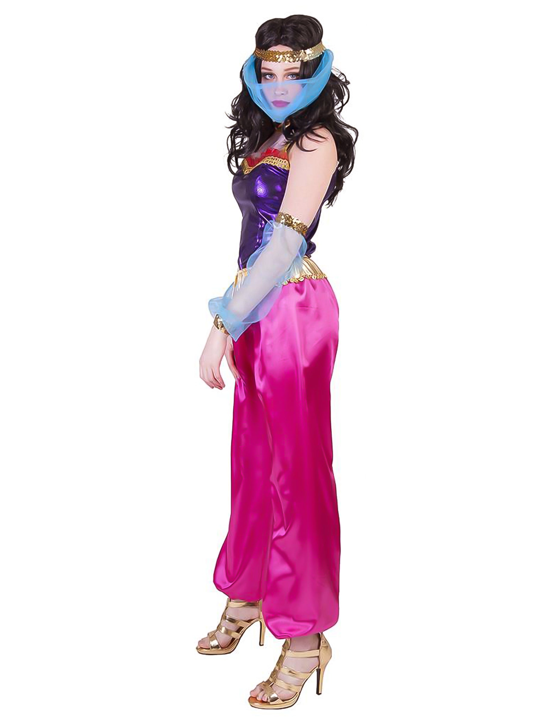 Ovaj kostim orijentalnog plesača za žene sastoji se od vrha, traka, hlača i kape (svjetiljke i cipele nisu uključeni). Vrh je sjajna ljubičasta, sa zlatnim letom i obojenim obrubom. Puhaste hlače su svijetlo ružičaste, sa zlatnim pojasom predstavljenim u struku. Veličina je elastična za više udobnosti. Trake su u plavom velu, okružene elastičnim trakama sa zlatnim šljokicama. Konačno, pokrivač za glavu dovršava ovaj orijentalni kostim. To je elastična pojasa sa zlatnim šljokicama, na kojima je fiksiran plavi veo. Ovaj kompletni kostim bit će savršen za orijentalnu večer.