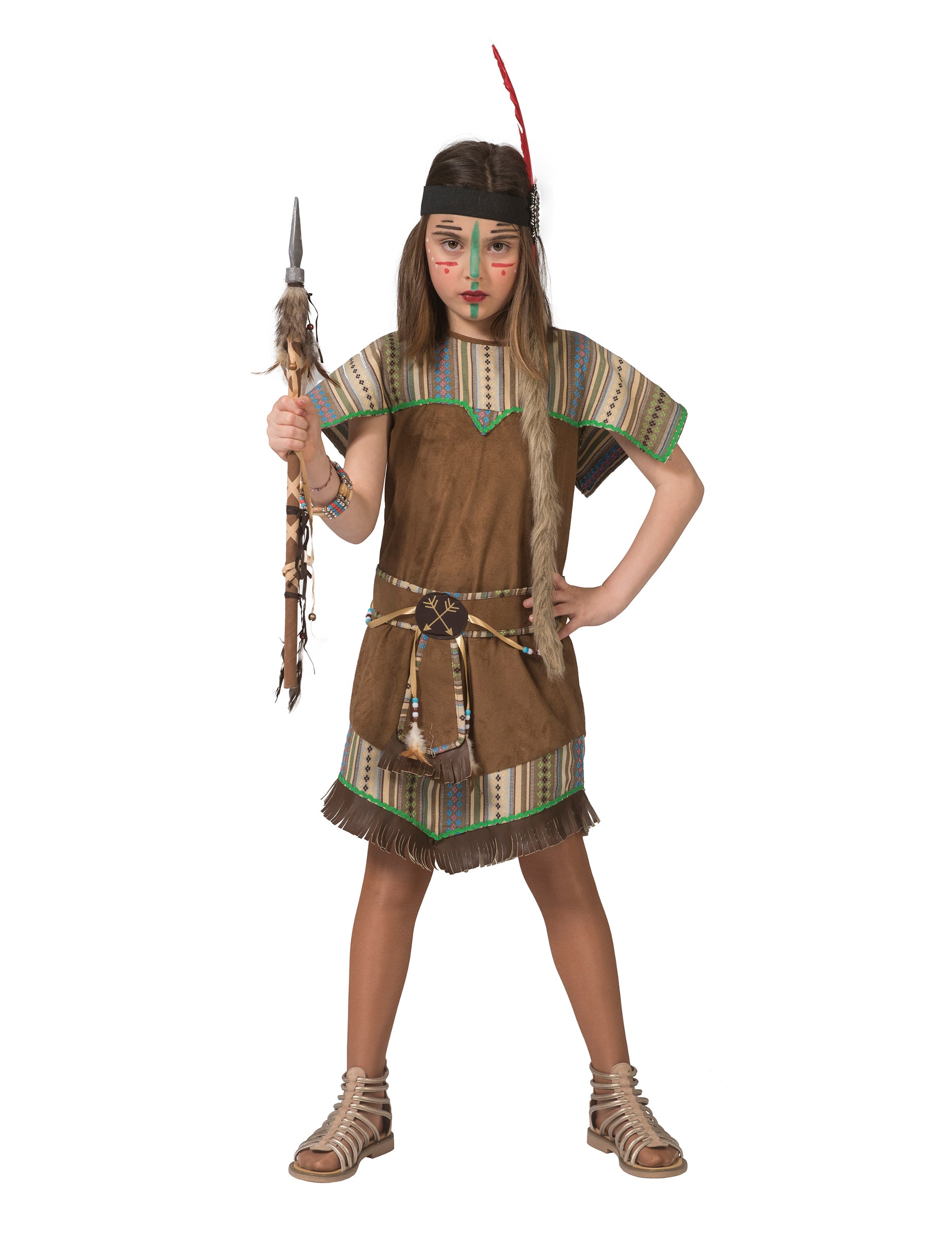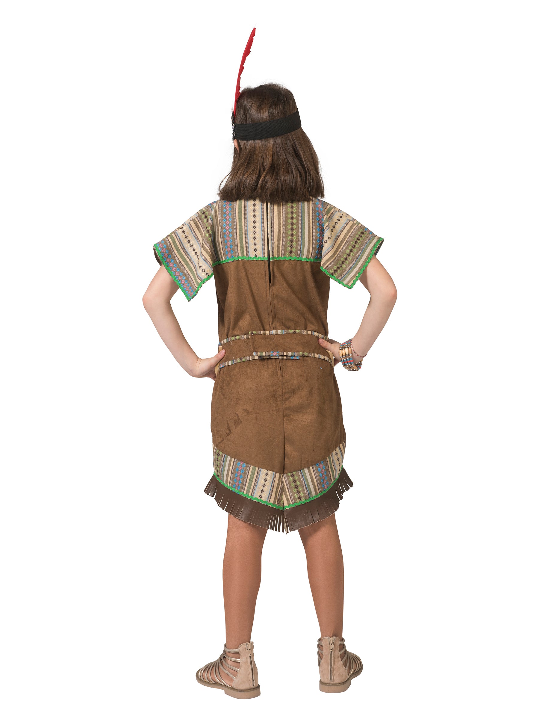 Ovaj indijski kostim za djevojku sastoji se od haljine i pojasa (natpis, koplje i cipele nisu uključeni). Haljina je smeđa, u tkanini od efekta kože. Na razini ovratnika izrađen je u tkanini od zraka, s dodirima boje. Dno haljine je izrezano na vrhu, a ukrašeno je smeđim rubovima. Ova se haljina zatvara u leđa pomoću zipa. Ovu haljinu dovršava smeđim pojasom. Zatvara se u leđima ogrebotinama. Ovaj će kostim biti savršen za postajanje pravi mali Indijanac povodom karnevala.