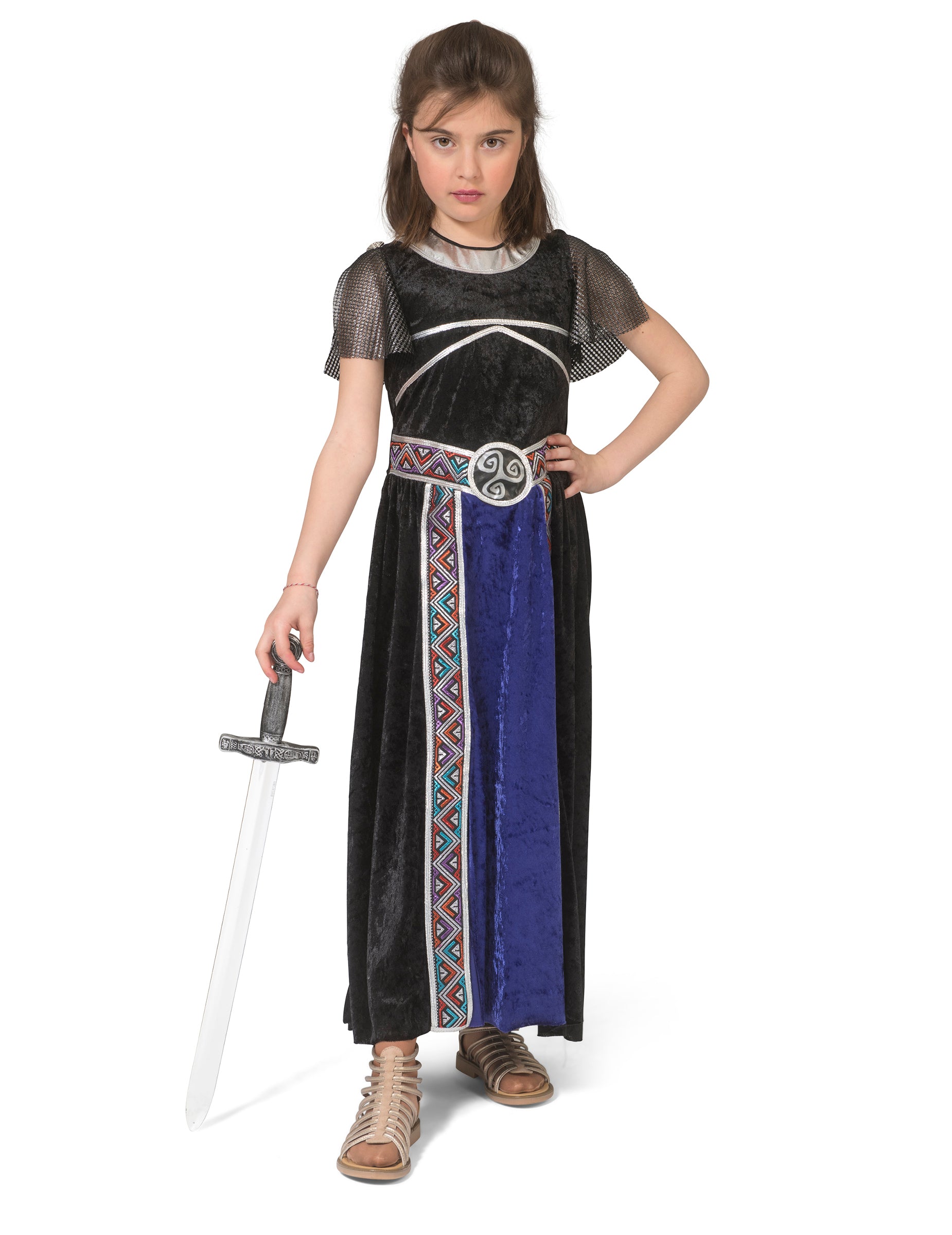 Duga haljina izrađena je od tkanine koja imitira crni baršun s tamnoplavim dijelom na donjem dijelu. Rukavi su od tkanine koja imitira lančanu košulju. Srebrni obrubi i trake s geometrijskim uzorcima daju lijep završni izgled ovom kostimu srednjovjekovne ratnice. Haljina ima patentni zatvarač na leđima za lakše oblačenje.