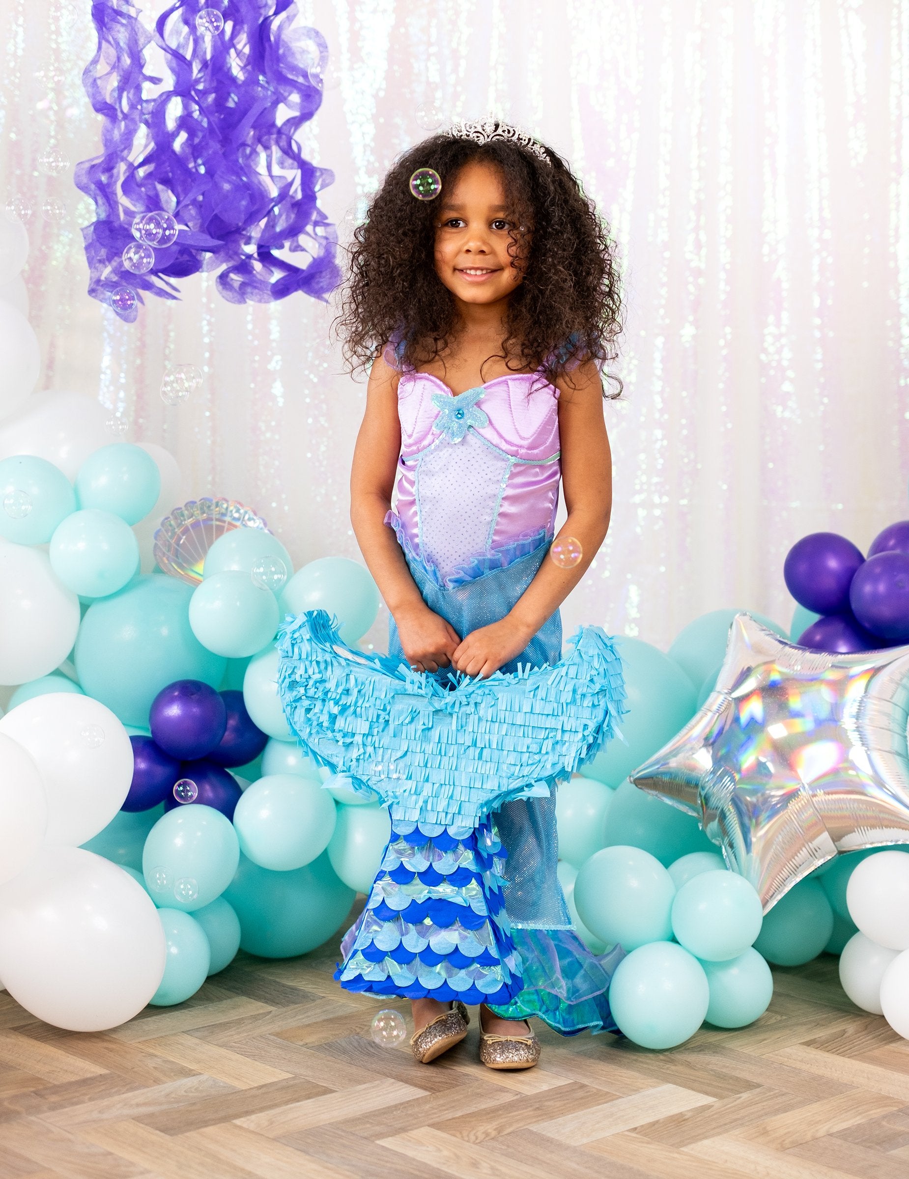 Cette piñata aux dimensions de 45 x 40 x 9 cm arbore une forme de queue de sirène aux nuances bleutées et irisées. Préparez l'animation en la remplissant de friandises avant de la suspendre en hauteur. Les enfants s'amuseront à la briser avec un bâton, les yeux bandés, pour en faire jaillir les surprises cachées. C'est l'élément décoratif et ludique indispensable pour un anniversaire de sirène réussi.