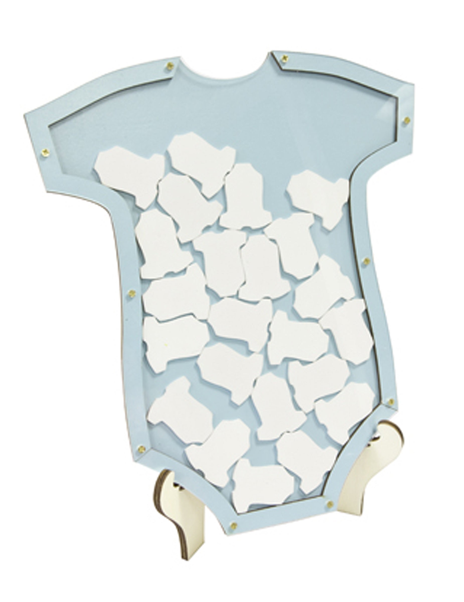 Otkrijte ovo plavi okvir u obliku bodija otprilike 25 x 24 cm, Zabavan način da oživite svoj događaj. Vaši voljeni mogu napisati svoje poruke na 24 male drvene kartice koje su uključene, prije nego što ih nježno umetnu u predviđeni utor. Bilo da se radi o čestitkama ili klađenju na ime bebe, svaka kartica veličine 2,5 x 3,5 cm... cm sačuvat će dragocjeni zapis ovog trenutka. okvir stilski se ističe kao izvrsna alternativa knjiga gostiju Tradicionalni način za čuvanje nezaboravnog suvenira s vaše proslave rođenja djeteta.