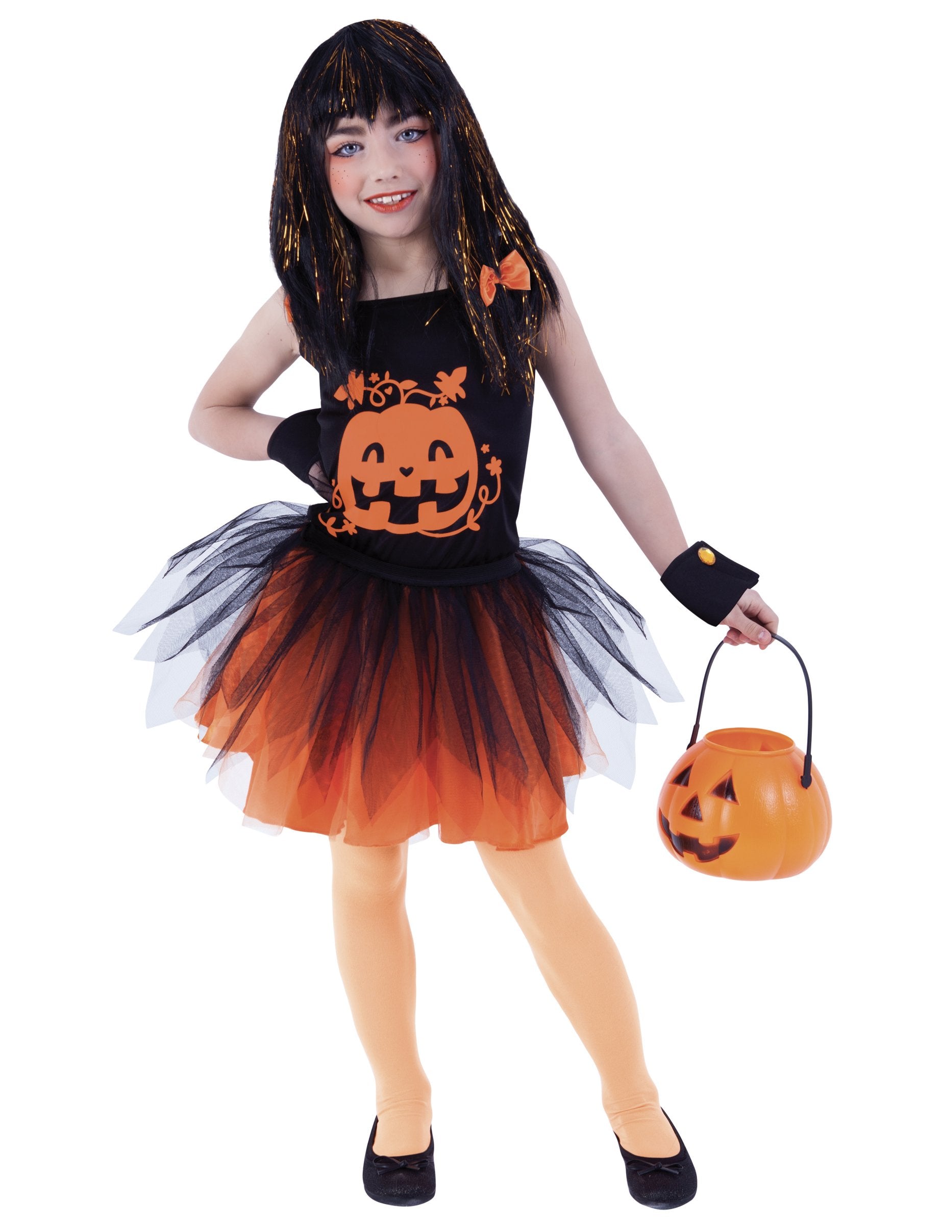 Ova bundeva prerušena za djevojčice sastoji se od vrha, tutu, dvije narukvice i par tajica (torba i perika nisu uključeni). Vrh je crna majica s narančastom bundevom ispisanom. Dvije crne narukvice s narančastim bootn -om na svakoj strani dovršavaju vrh ovog kostima. Narančasta tkanina Tutu na sebi ima crni til. Narančaste tajice savršeno će dovršiti! Ova prerušavanje bit će savršena za večer Noći vještica!