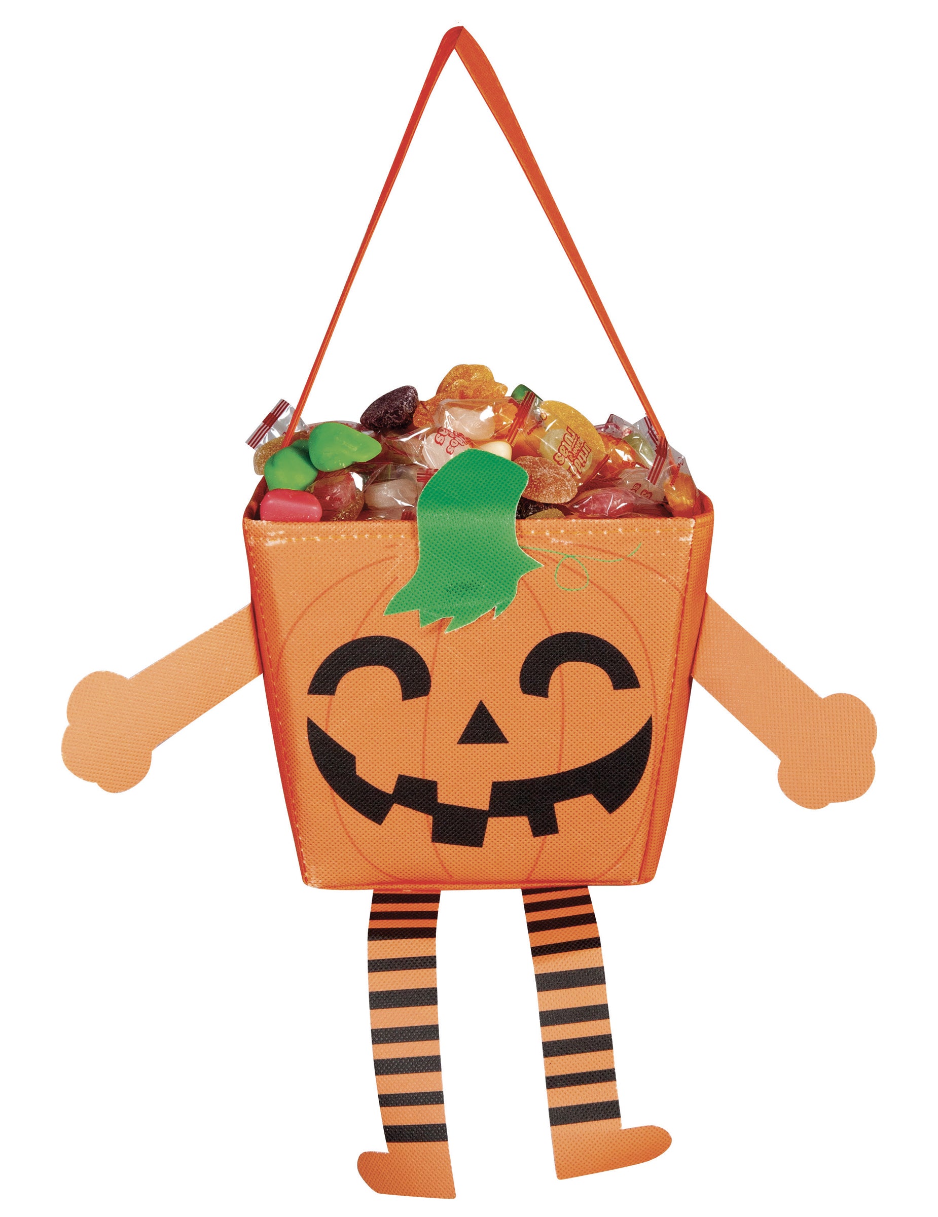 Ova vreća male narančaste bundeve izrađena je od tkanine. Mjeri otprilike 17 cm. Narančaste boje, ova je torba ispisana s nasmijanim crnim licem. U vrećici su također ušiveni par crnih i narančastih pruga. Konačno, ručka će vam omogućiti da je nosite ručno tijekom berbe slatkiša. Savršena torba za dodavanje kostima bundeve na večeri Noći vještica.