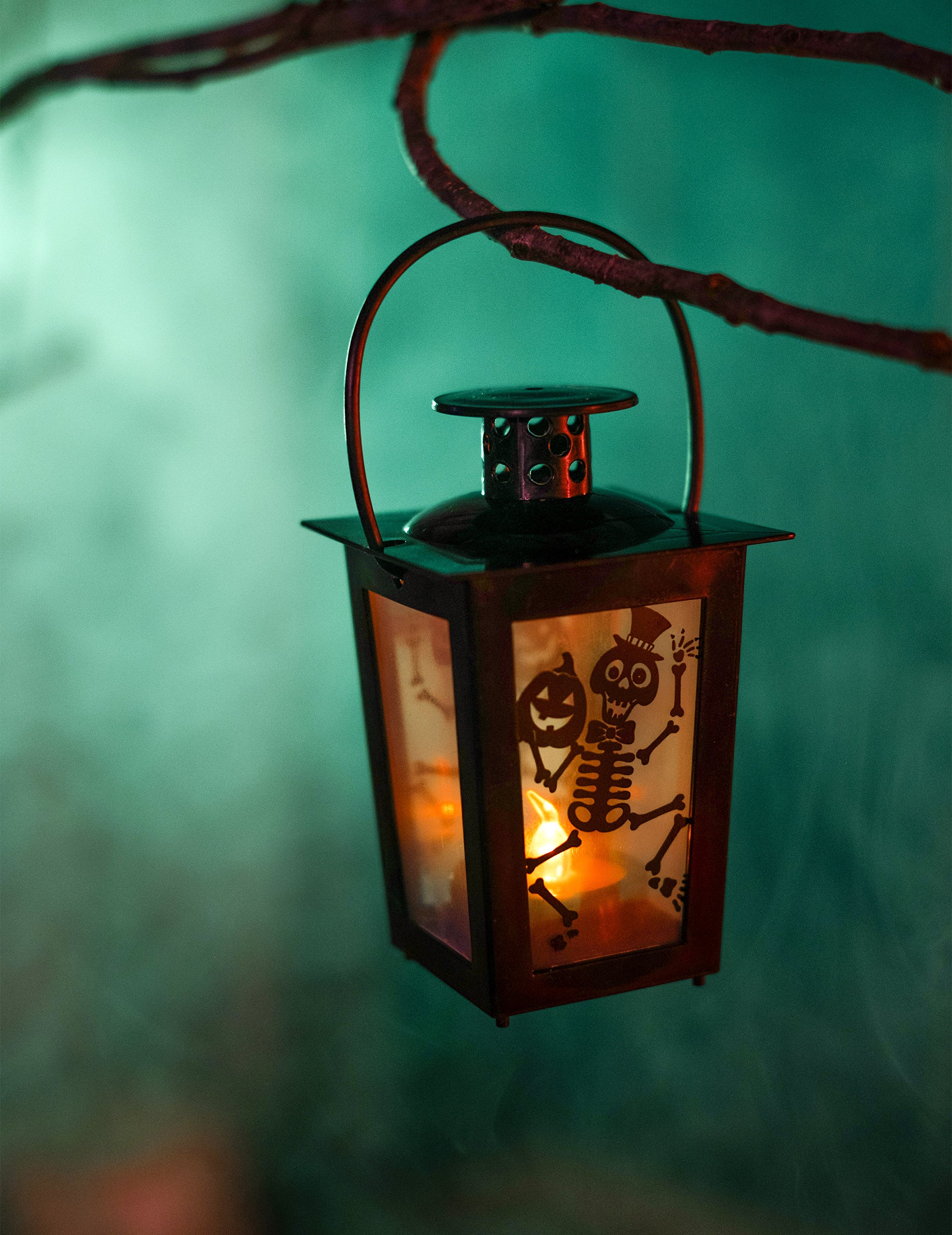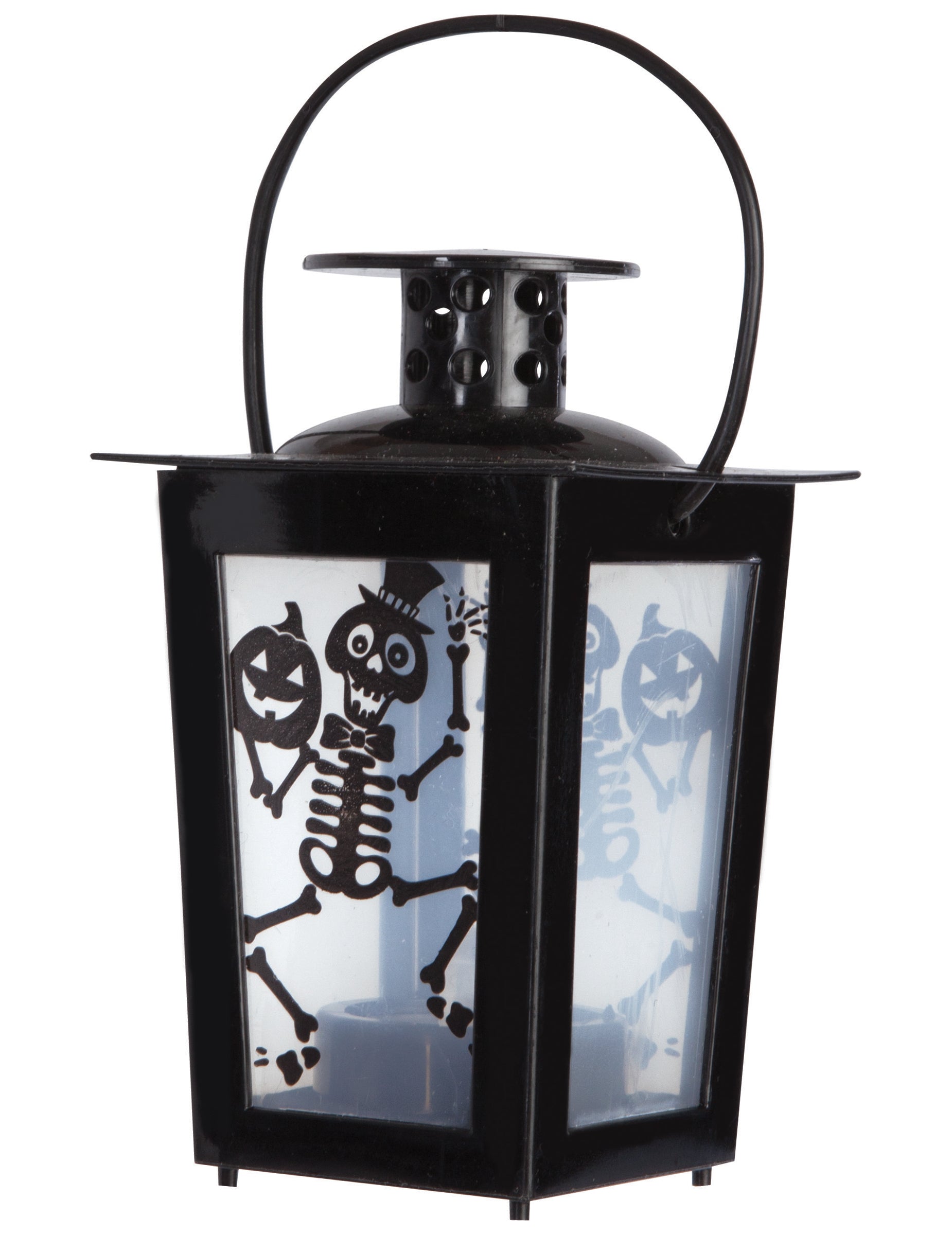 Ova osvijetljena lampa dimenzija 15 x 8 cm Ovaj lampion emitira mekan, tajanstven sjaj, savršen za stvaranje uistinu sablasne atmosfere za Noć vještica. Njegov sjajni crni okvir skriva prozirne zidove ukrašene plesnim kosturima i nasmijanim bundevama, savršeno dočaravajući blagdanski duh noći čudovišta. Zahvaljujući praktičnoj ručki, može se lako objesiti ili postaviti na stol kako bi osvijetlio vaše ukrase. Njegovo suptilno osvjetljenje pruža upravo pravu količinu uzbuđenja i šarma kako bi uljepšao vaš prostor. Za ovaj lampion potrebna je baterija CR2032 (nije uključena). Idealan za upotpunjavanje vaših ukrasa za Noć vještica, ovaj lampion će zasigurno privući svačiju pažnju svojim razigranim, ali i makabričnim stilom.